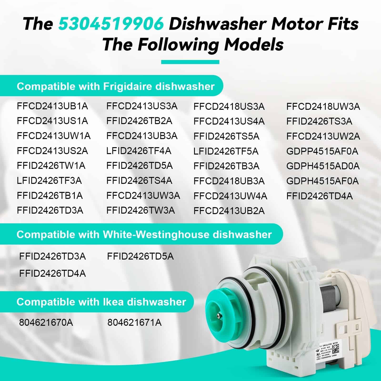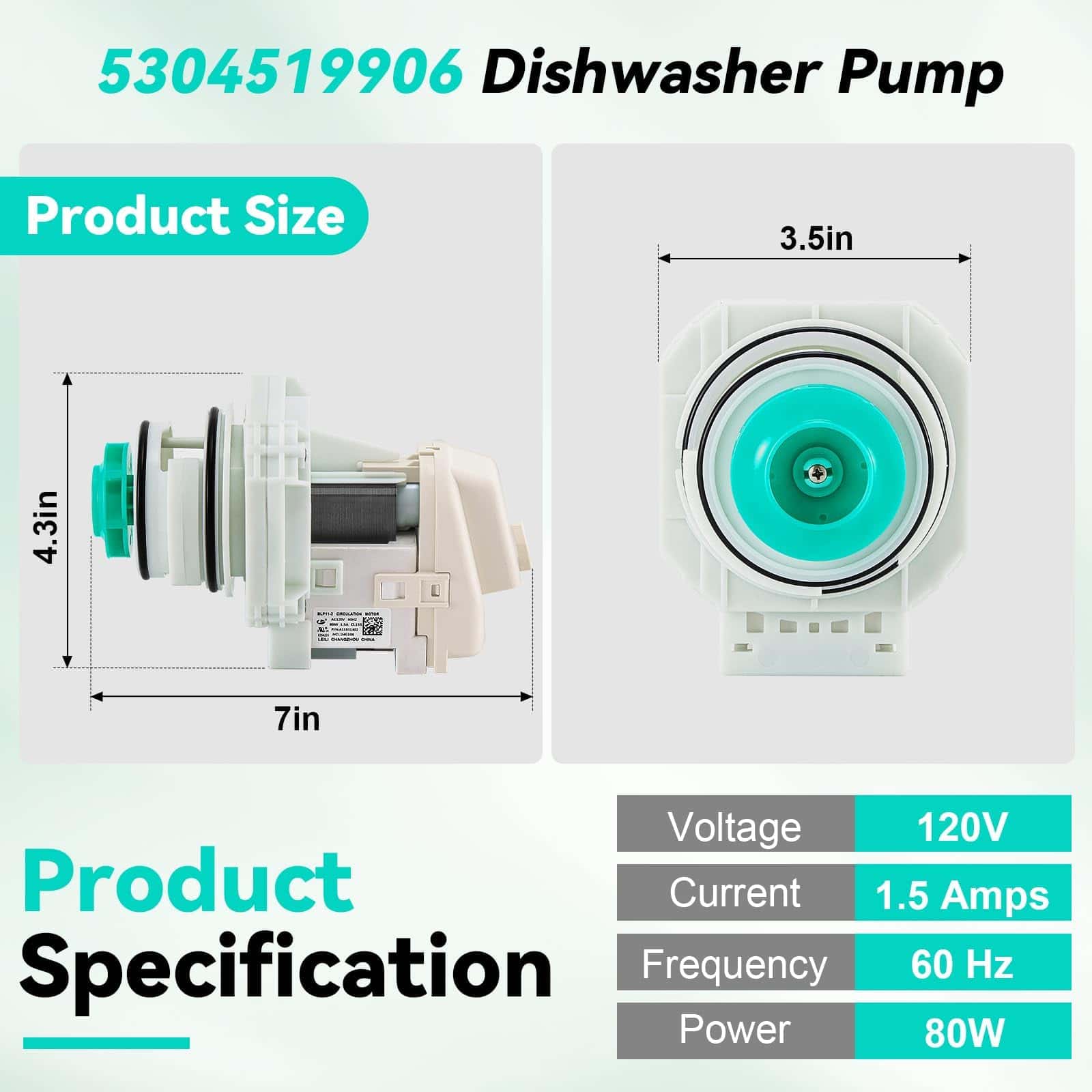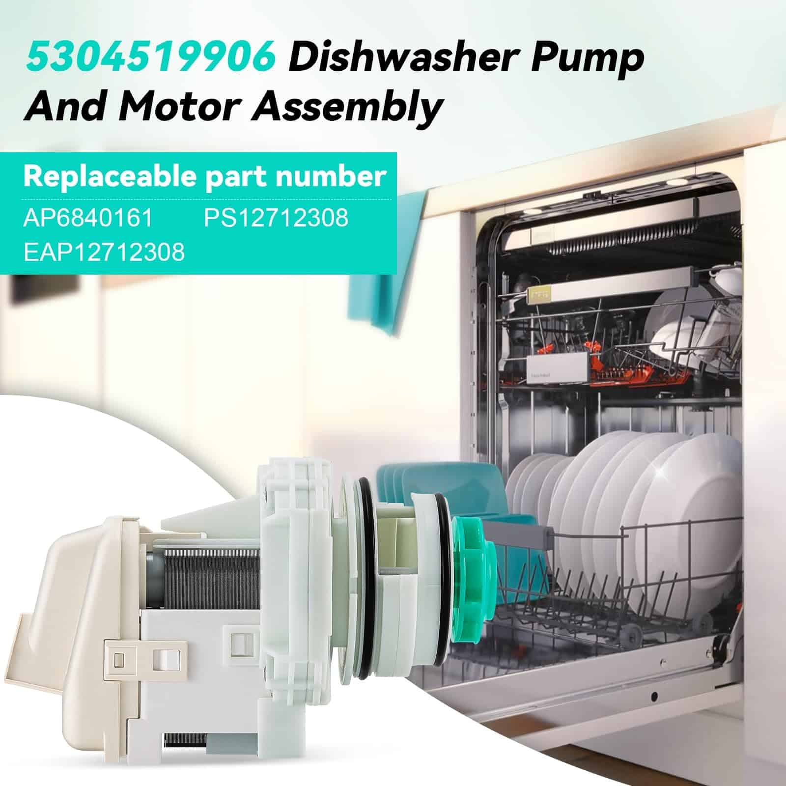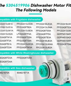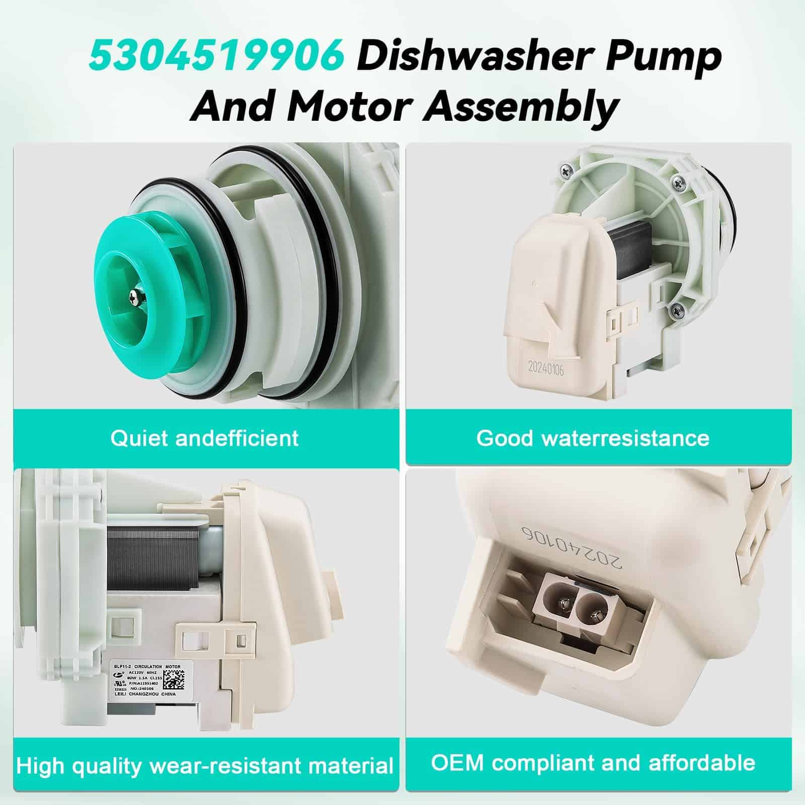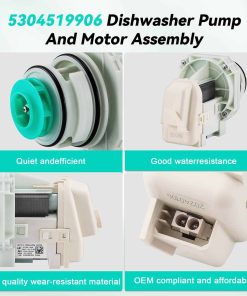 La bomba y motor 5304519906 para lavavajillas empuja el agua hacia el brazo rociador durante el ciclo de la bomba y dirige el agua hacia la manguera de desagüe durante el ciclo de desagüe. Esta bomba de circulación está hecha de materiales de alta calidad y ha sido sometida a rigurosas pruebas para garantizar un funcionamiento eficaz a largo plazo. Reemplazar la bomba y motor es una manera conveniente y económica de reparar tu lavavajillas. Esta pieza es la solución perfecta para problemas comunes de lavavajillas como: incapacidad para drenar correctamente, incapacidad para llenar agua, fugas, incapacidad para limpiar correctamente o ruidos. La instalación es sencilla, solo desconecta la energía y el suministro de agua y podrás hacerlo fácilmente.