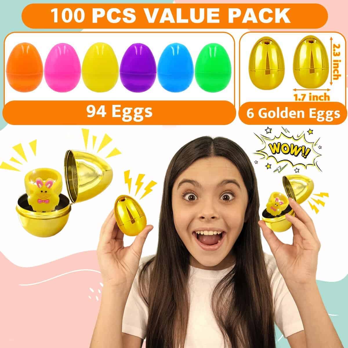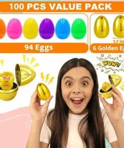 2. Paquete súper valor 100 piezas de huevos de juguete de Pascua premium rellenos incluyen 100 tipos únicos de juguetes. Todo embalado ordenadamente en una encantadora caja de regalo. Perfecto para favores de fiesta de Pascua y rellenos de canasta, estos huevos dorados miden 1.7 2.3 pulgadas cada uno, ¡prometiendo alegría y emoción interminables!