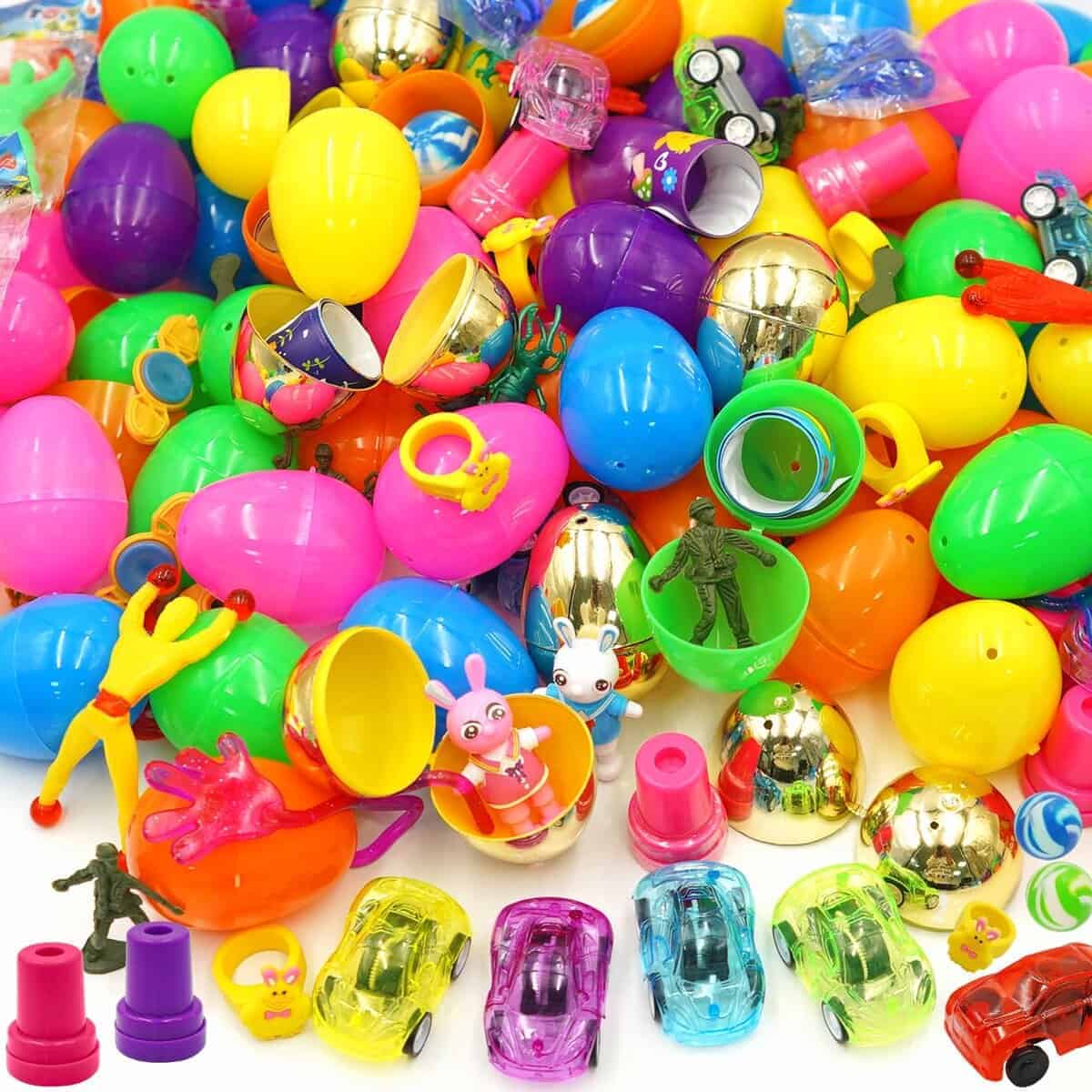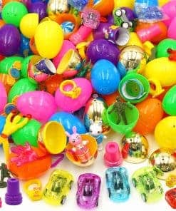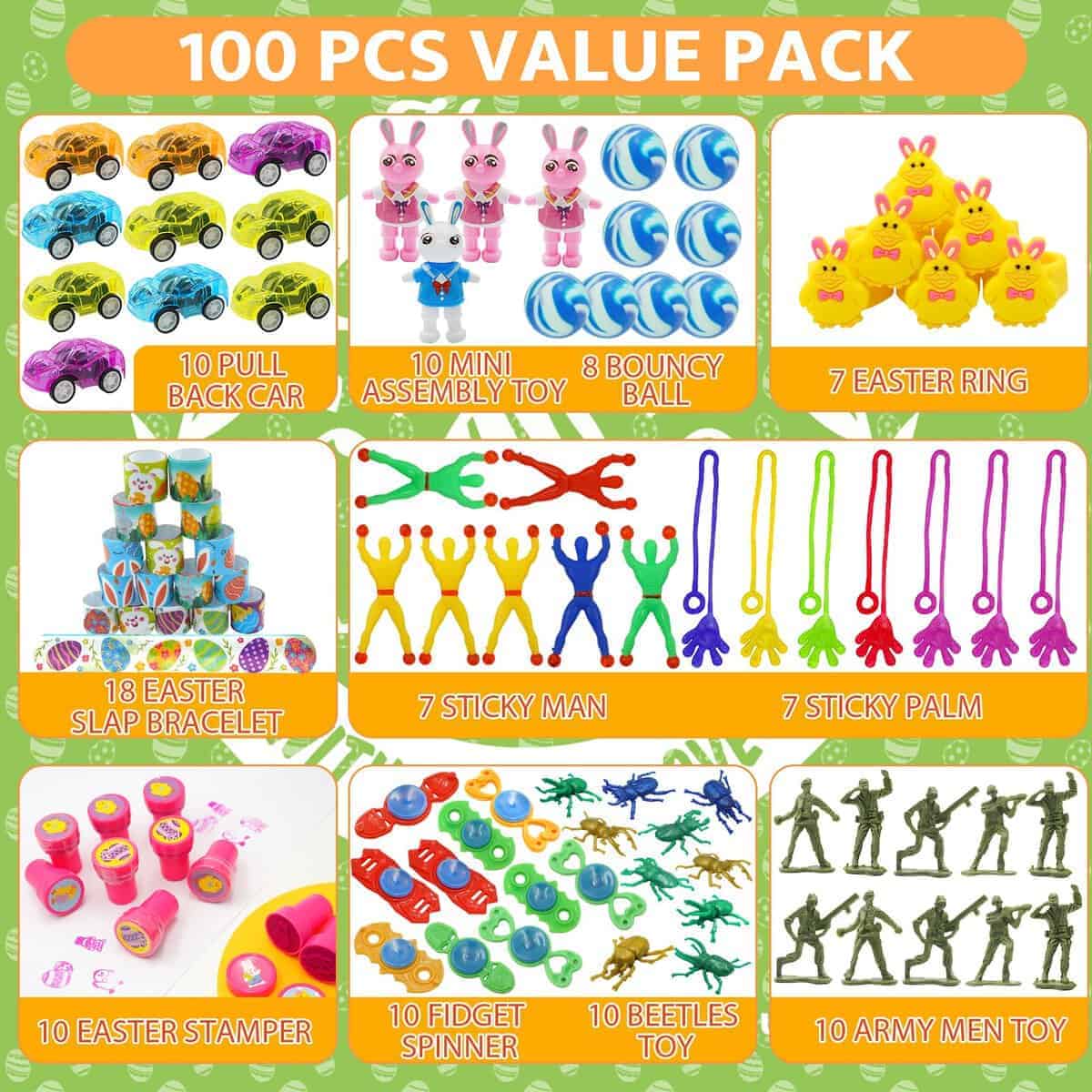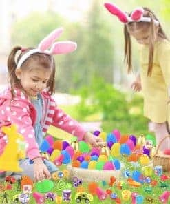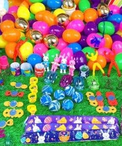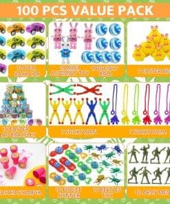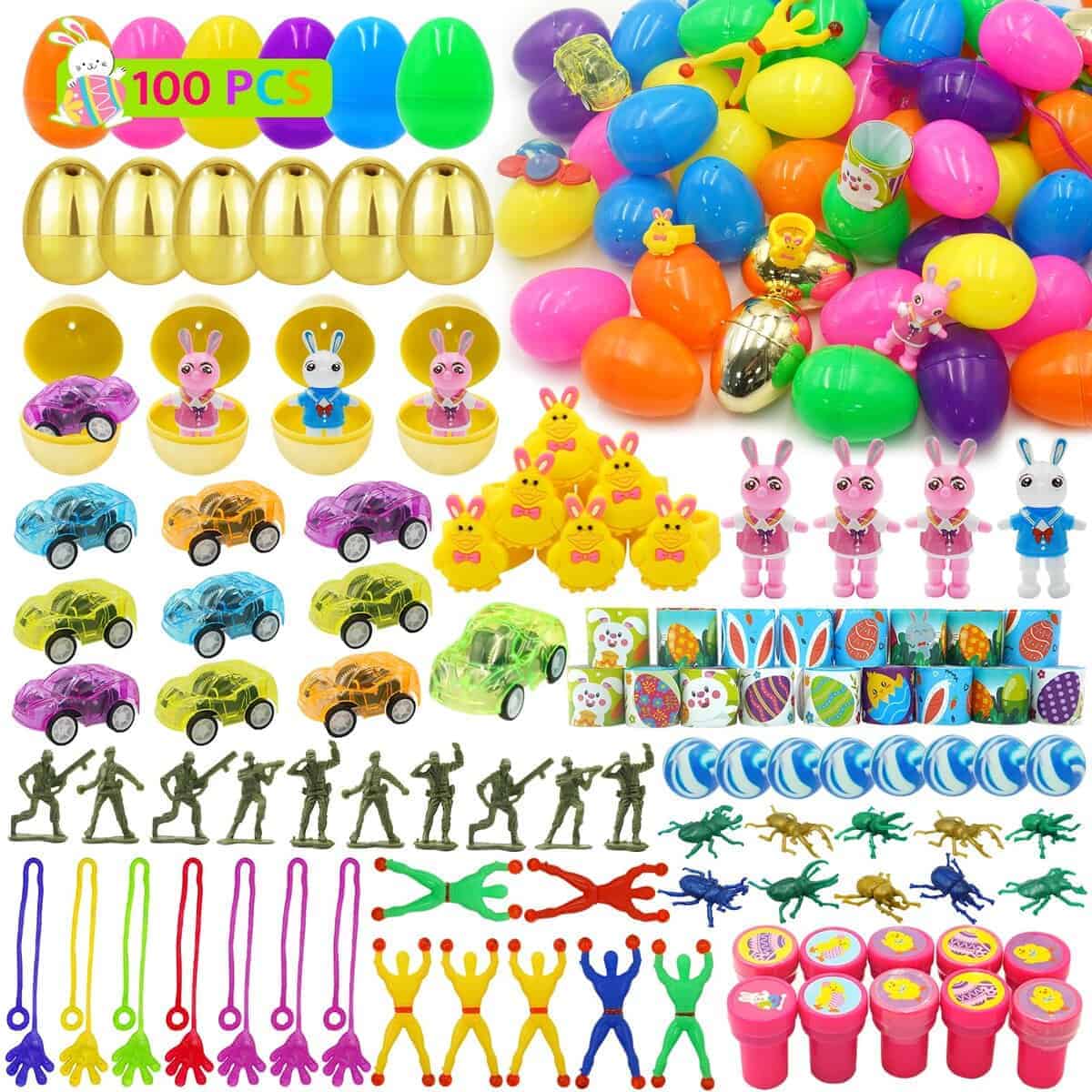 1. Huevos de Pascua llenos de canastas: hay 100 huevos de plástico de Pascua en 7 diseños de colores y 100 piezas de juguetes variados. Incluye 10 coches de retroceso, 10 borradores de conejo, 10 sellos de Pascua, 10 juguetes giratorios sensoriales, 10 juguetes de escarabajo, 10 soldados de juguete, 8 bolas saltarinas, 7 anillos de pollitos, 18 pulseras de golpe de Pascua, 7 hombres pegajosos, 7 manos pegajosas y 10 juguetes de conejo que se tambalean.