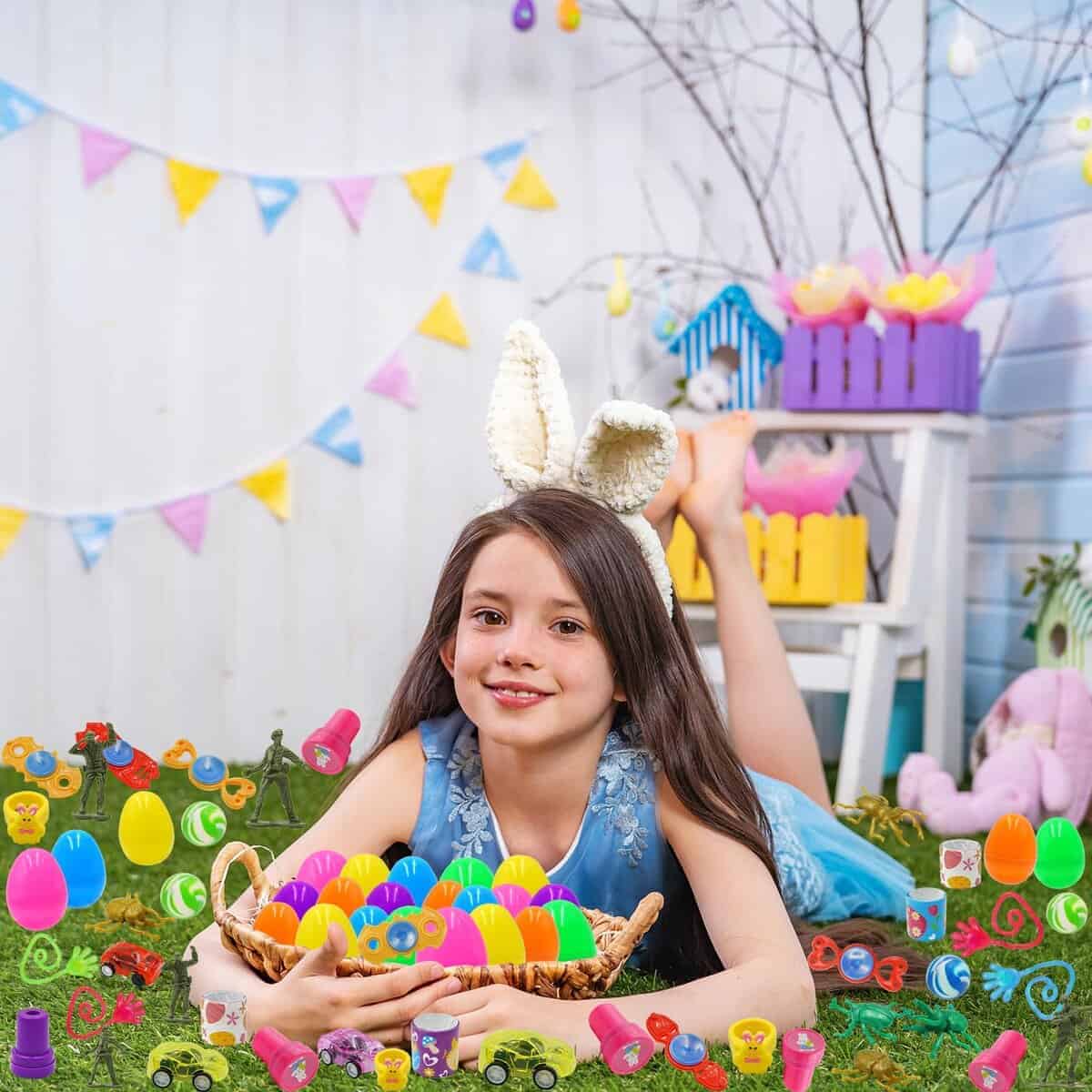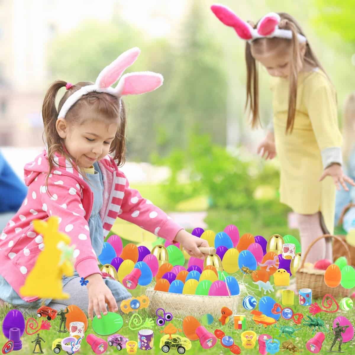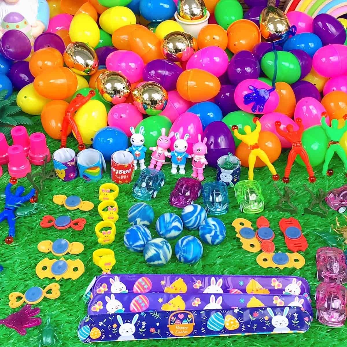 1. Huevos de Pascua llenos de canastas: hay 100 huevos de plástico de Pascua en 7 diseños de colores y 100 piezas de juguetes variados. Incluye 10 coches de retroceso, 10 borradores de conejo, 10 sellos de Pascua, 10 juguetes giratorios sensoriales, 10 juguetes de escarabajo, 10 soldados de juguete, 8 bolas saltarinas, 7 anillos de pollitos, 18 pulseras de golpe de Pascua, 7 hombres pegajosos, 7 manos pegajosas y 10 juguetes de conejo que se tambalean.