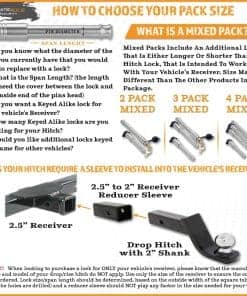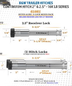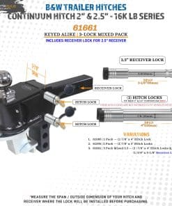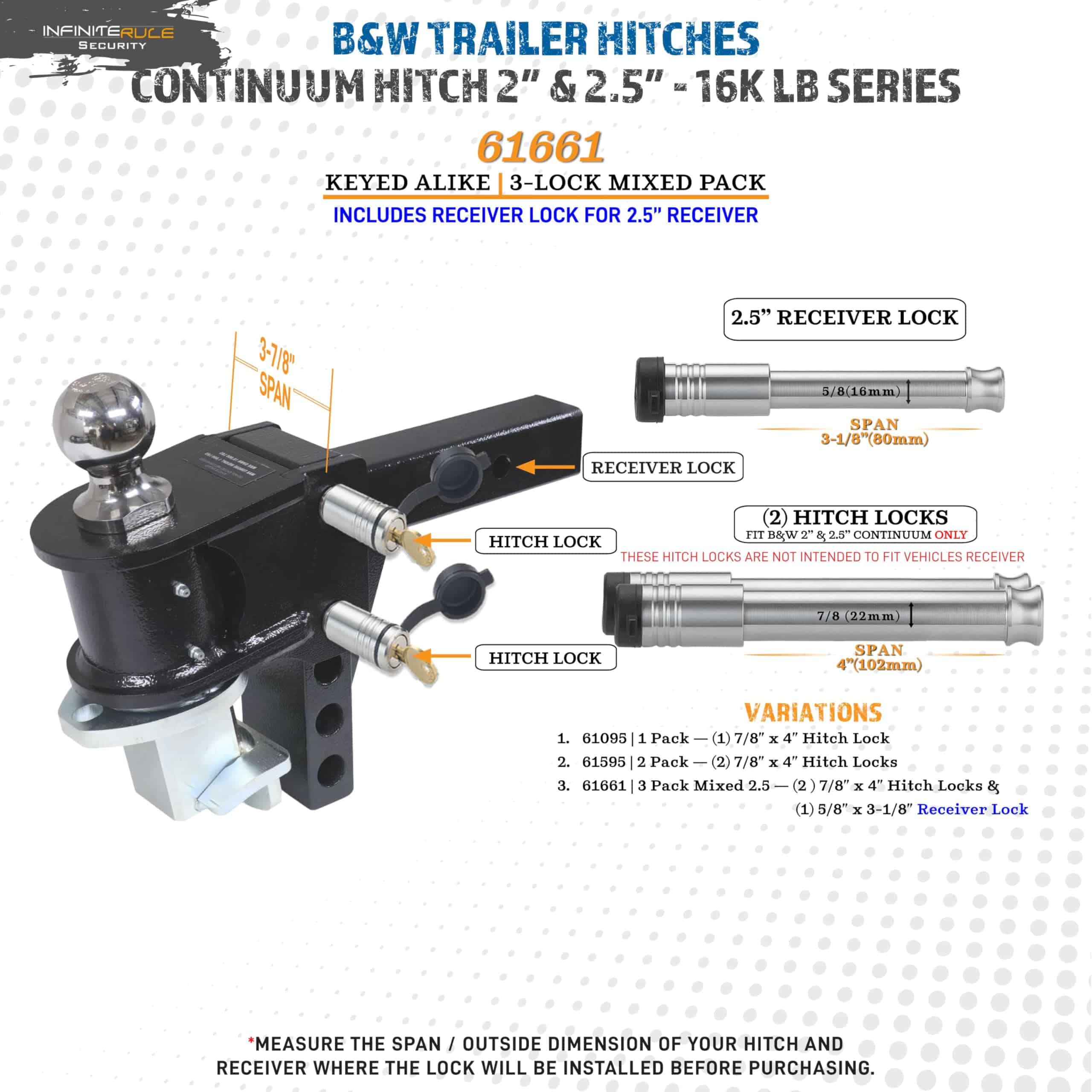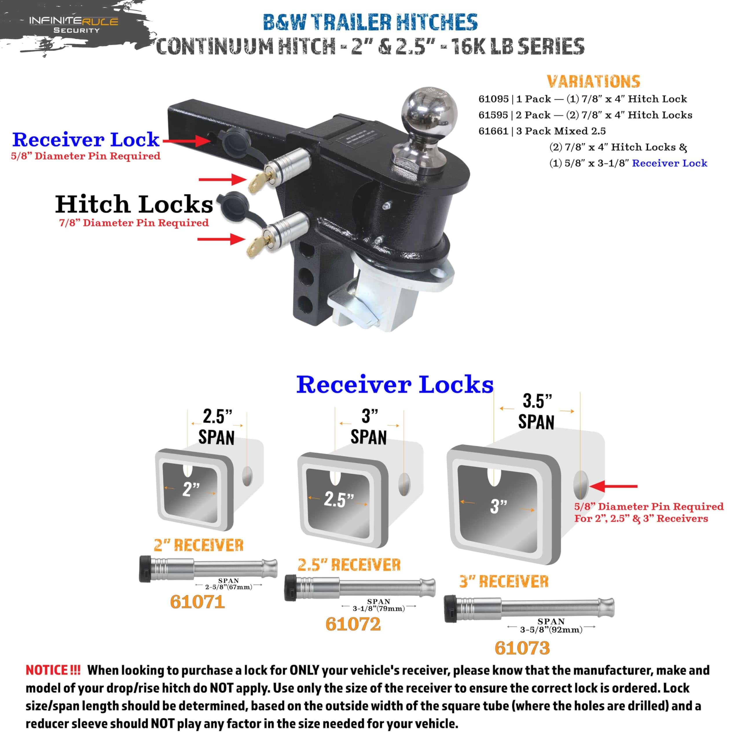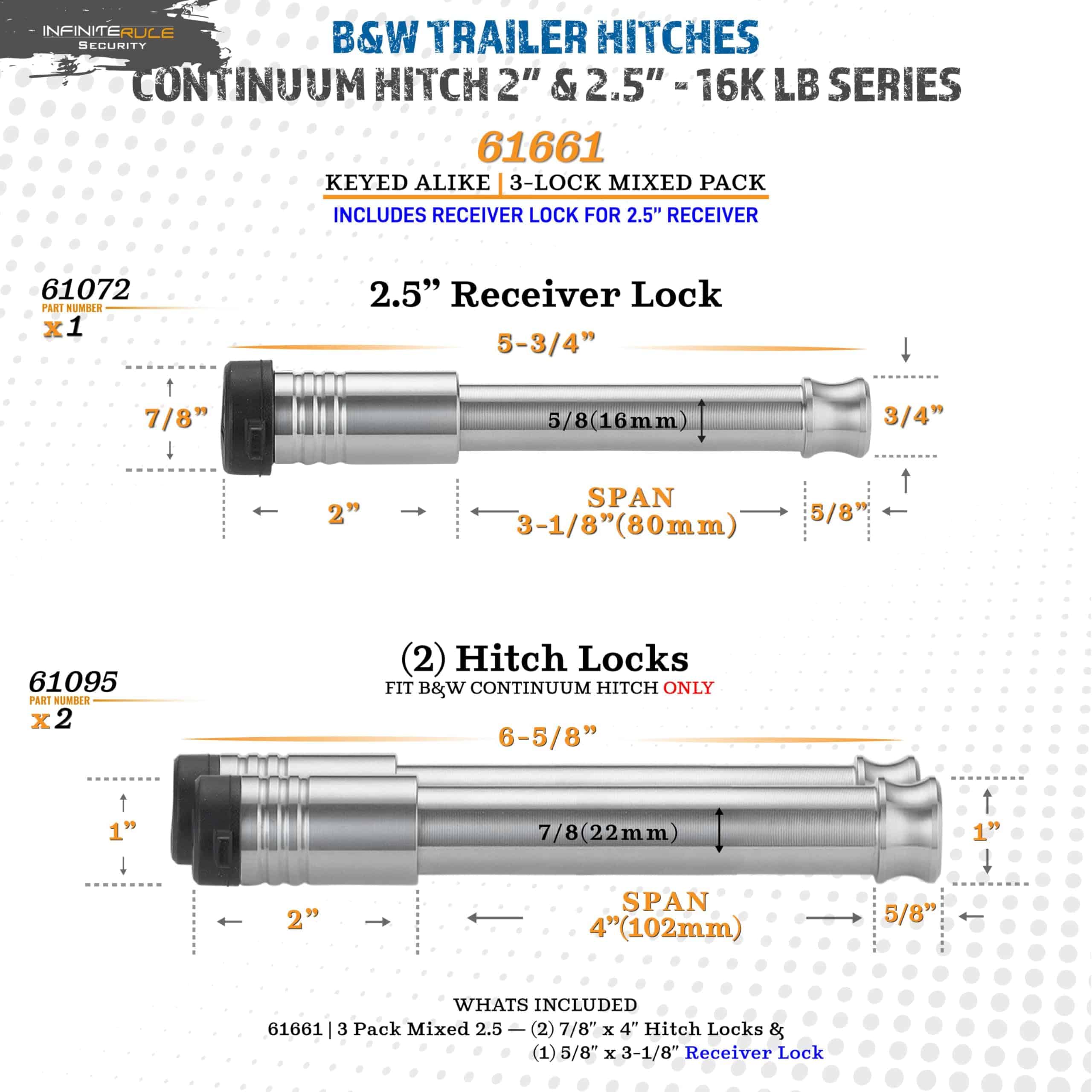 Mantén tu enganche y accesorios seguros con los cerrojos a medida de InfiniteRule. ¿Remolcar un remolque o equipos? No lo dejes vulnerable al robo con los cerrojos de enganche y receptáculo de 3 paquetes mixtos, con llave igual, diseñados a medida de InfiniteRule. Específicamente diseñados para adaptarse a los enganches B&W de la Serie Continuum 16K LB de 2″ y 2.5″, incluyen cerrojo para receptáculo de 2.5″, estos robustos cerrojos disuadirán a los criminales de desenganchar tus objetos de valor. Los cerrojos de enganche de acero inoxidable mecanizados incluidos han sido rigurosamente probados con una clasificación de 32K LB para el cerrojo de acero inoxidable y una clasificación de 21K LB para el cerrojo de receptor, por lo que puedes confiar en que resistirán intentos de romper, cortar o forzar. Las tapas de goma estancas a prueba de agua mantienen alejada la suciedad, el agua y la suciedad para que los cerrojos sigan funcionando suavemente. Proteger tu inversión es nuestra prioridad. Por eso, los cerrojos de enganche y receptor de InfiniteRule son 100% hechos en los Estados Unidos con materiales premium que resisten el óxido y la corrosión. Fabricamos, enviamos y servimos nuestros productos de seguridad nacionalmente, respaldándolos con nuestra promesa a los clientes. Antes de realizar el pedido, verifica que el espacio y el diámetro del cerrojo se adapten a tu enganche y receptor específico. Los paquetes mixtos incluyen un cerrojo adicional para receptor con pasadores más largos o más cortos para adaptarse a diferentes tamaños de receptáculos si es necesario. Te mereces tener la tranquilidad de saber que tu remolque no se convertirá en el próximo objetivo de un criminal. Elige InfiniteRule para una seguridad personalizada y resistente y desbloquea el camino hacia la aventura.