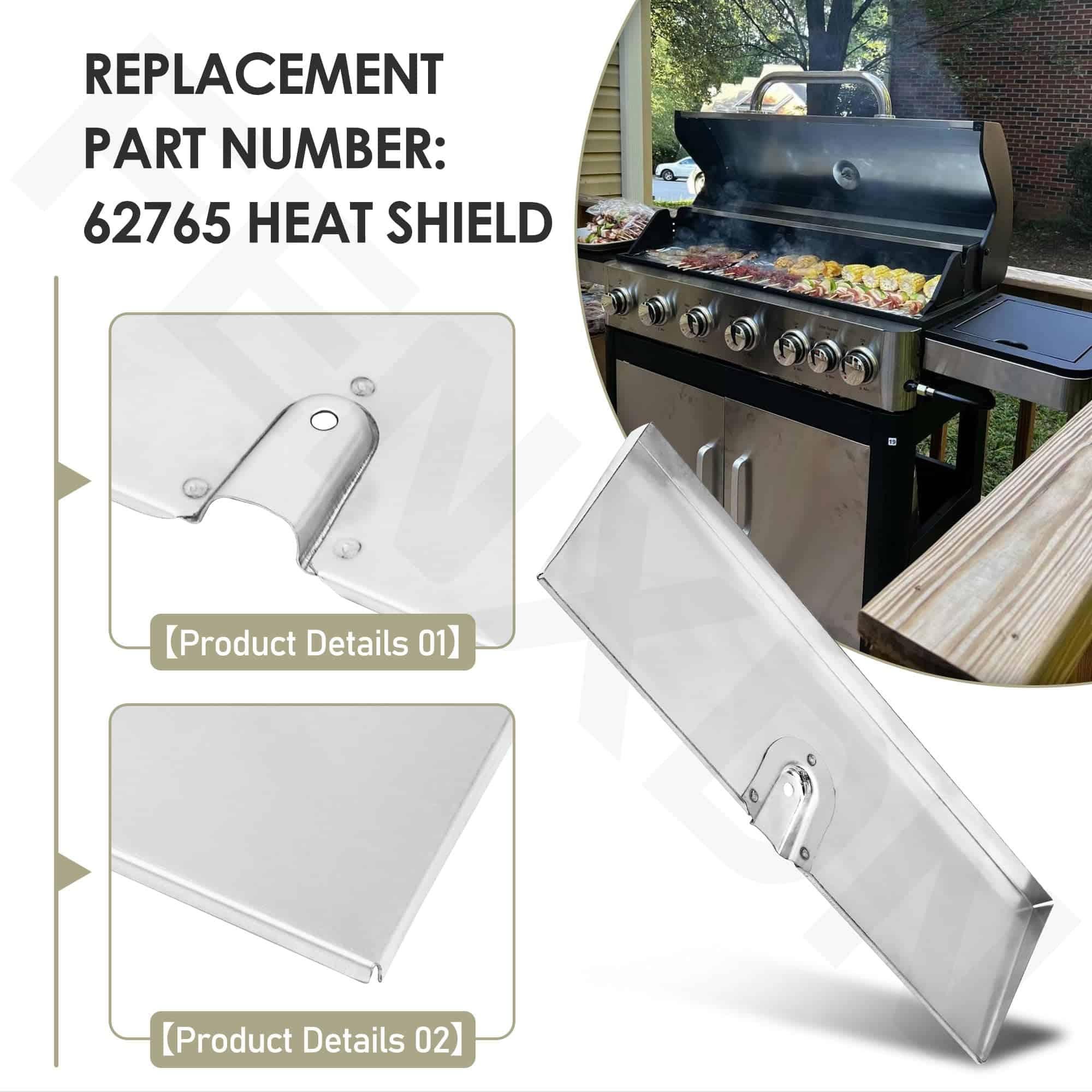 2. Número de pieza de repuesto: Protector térmico 62765, modelos compatibles de Weber Genesis incluyen: 6531001, 6531301, 6531701, 330 LP Grill, 6631001, 6631301, 330 NG Grill, 6570001 Genesis S-330 LP NG Grill, 86631301 (2013)(NG) EP-330 Grill, 86670001 (2013)(NG) Genesis S-330 Grill – SS, 86570001 (2013)(LP) S-330 Grill – SS, 86531001 (2013) E-330.