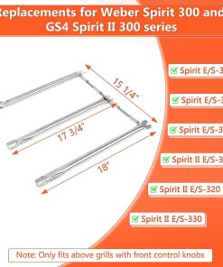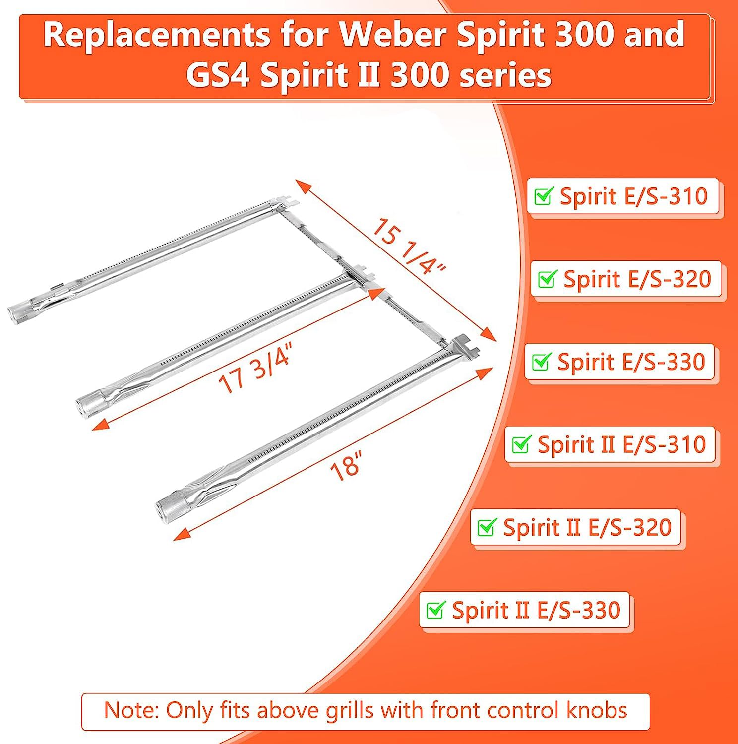 1. Compatibilidad: Quemador de parrilla de repuesto para la serie Weber Spirit 300, Spirit E/S 310, 320 y 330 (2013-2017) con perillas de control montadas en la parte delantera. Modelos detallados: E-310, E-315, S-310, S-315, E-320, S-320, E-330, S-330, SP-330. También es compatible con las parrillas de gas de la serie Weber GS4 Spirit ii 300 (3 quemadores, delantero), modelos Spirit II E-310/320, Spirit II S-310/320 y parrillas de gas de la serie Weber Spirit II LX 300 (modelos del año 2017).