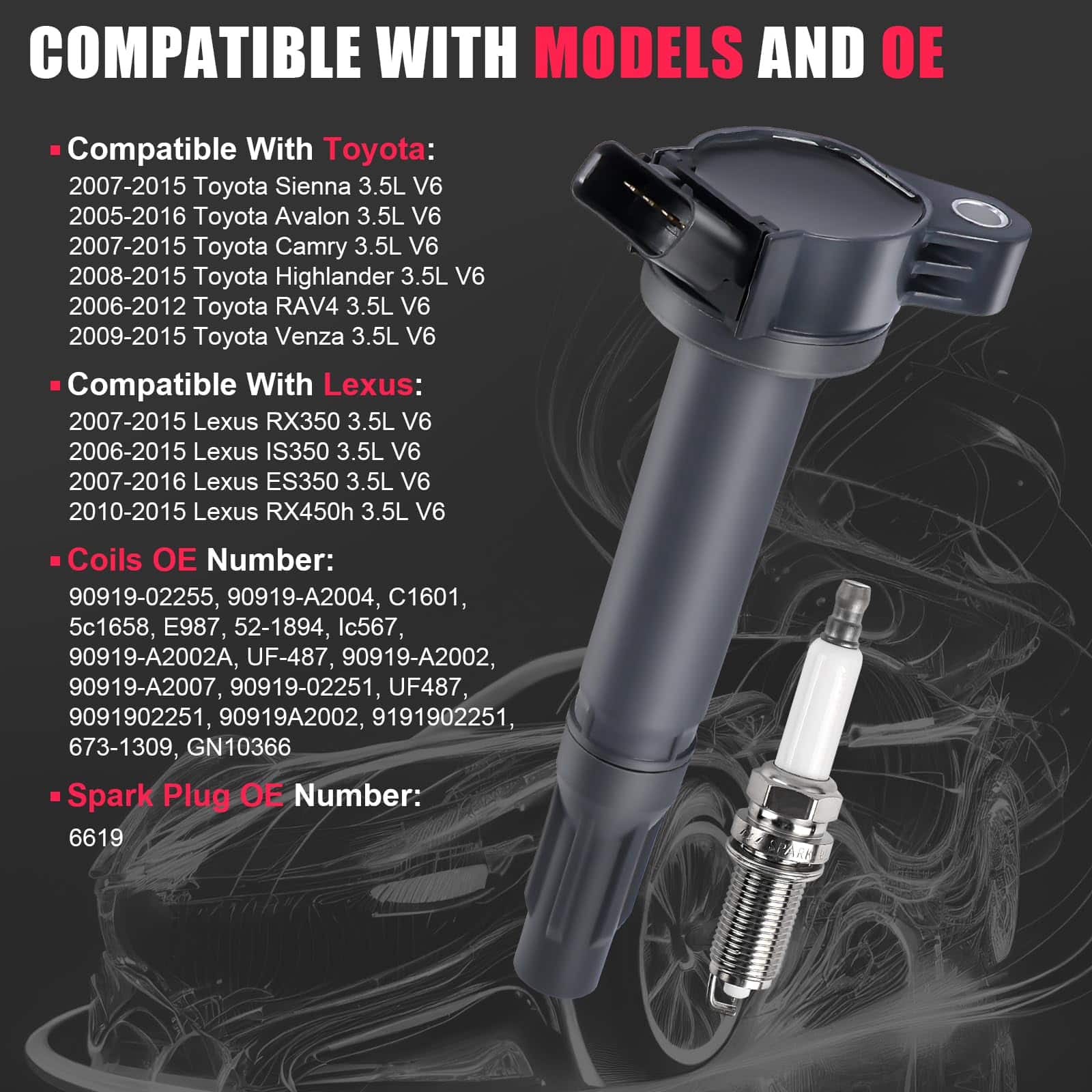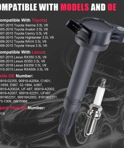 Este conjunto de bobinas de encendido y bujías es compatible con varios modelos de Toyota y Lexus equipados con motores V6 de 3.5L. Las bobinas de encendido son componentes esenciales del sistema de encendido de su vehículo, responsables de generar la chispa necesaria para encender la mezcla de aire y combustible en los cilindros del motor. Las bujías, por otro lado, son responsables de encender esta mezcla en los cilindros en el momento adecuado.