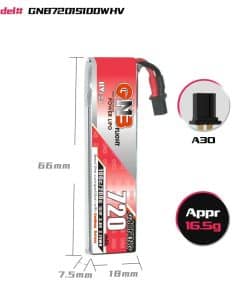 Especificaciones: Capacidad Mínima: 720mAh; Configuración: 1S1P/3.8V/1 celda; Tasa de descarga continua: 100C; Tasa máxima de descarga: 200C; Peso Neto: 16.5(+/-1g) Aprox; Dimensiones: 66mm x 18mm x 7.5mm Aprox. (L x A x H); Descarga: A30
