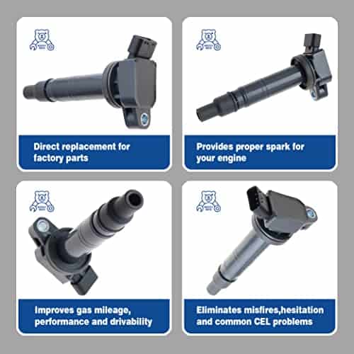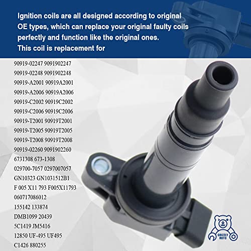 3. GRIZZLY AUTO utiliza la última tecnología y componentes OE para ofrecer una calidad excepcional que supera los requisitos OE. ¡15% más de energía que las bobinas OE! Nuestras bobinas de encendido son fáciles de ubicar en ambos lados del motor dentro del compartimiento del motor, lo que se puede instalar en minutos. Puede experimentar arranques de motor más consistentes y suaves de inmediato. 4. Para prolongar la vida útil de la bobina de encendido, se sugiere encarecidamente revisar regularmente su bujía para mantenerla en buen estado. Sin embargo, la bobina de encendido y la bujía se pueden reemplazar juntas para disminuir la probabilidad de disfunción común del sistema de encendido, ya que una bujía vieja sobrecargará y sobrecargará las bobinas de encendido. 5. Garantía de 2 años o 40000 millas proporcionada por GRIZZLY AUTO. Si tiene alguna insatisfacción con la calidad de esta bobina, contáctenos de inmediato. Estamos siempre aquí esperando sus preguntas y listos para ayudarlo a resolverlas.