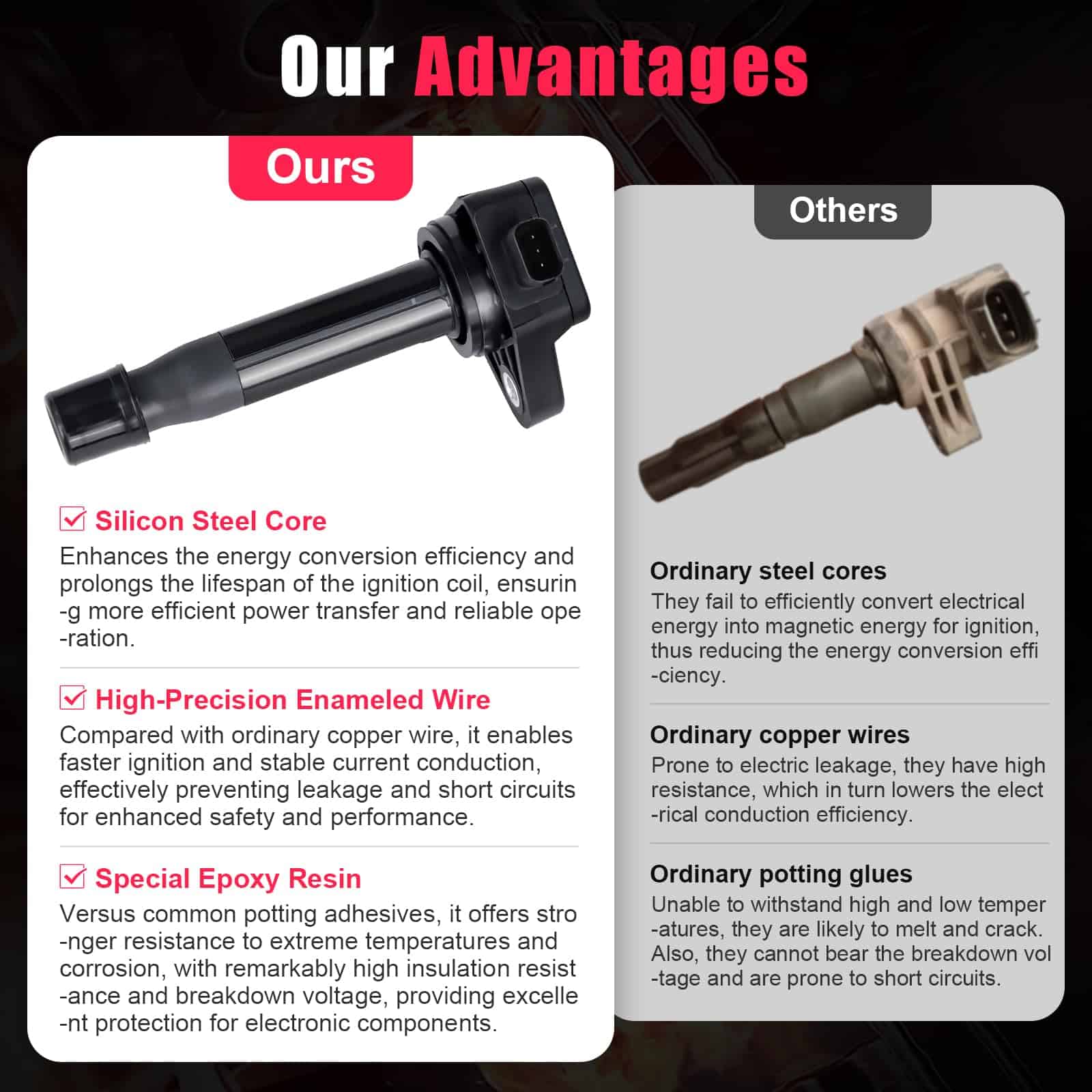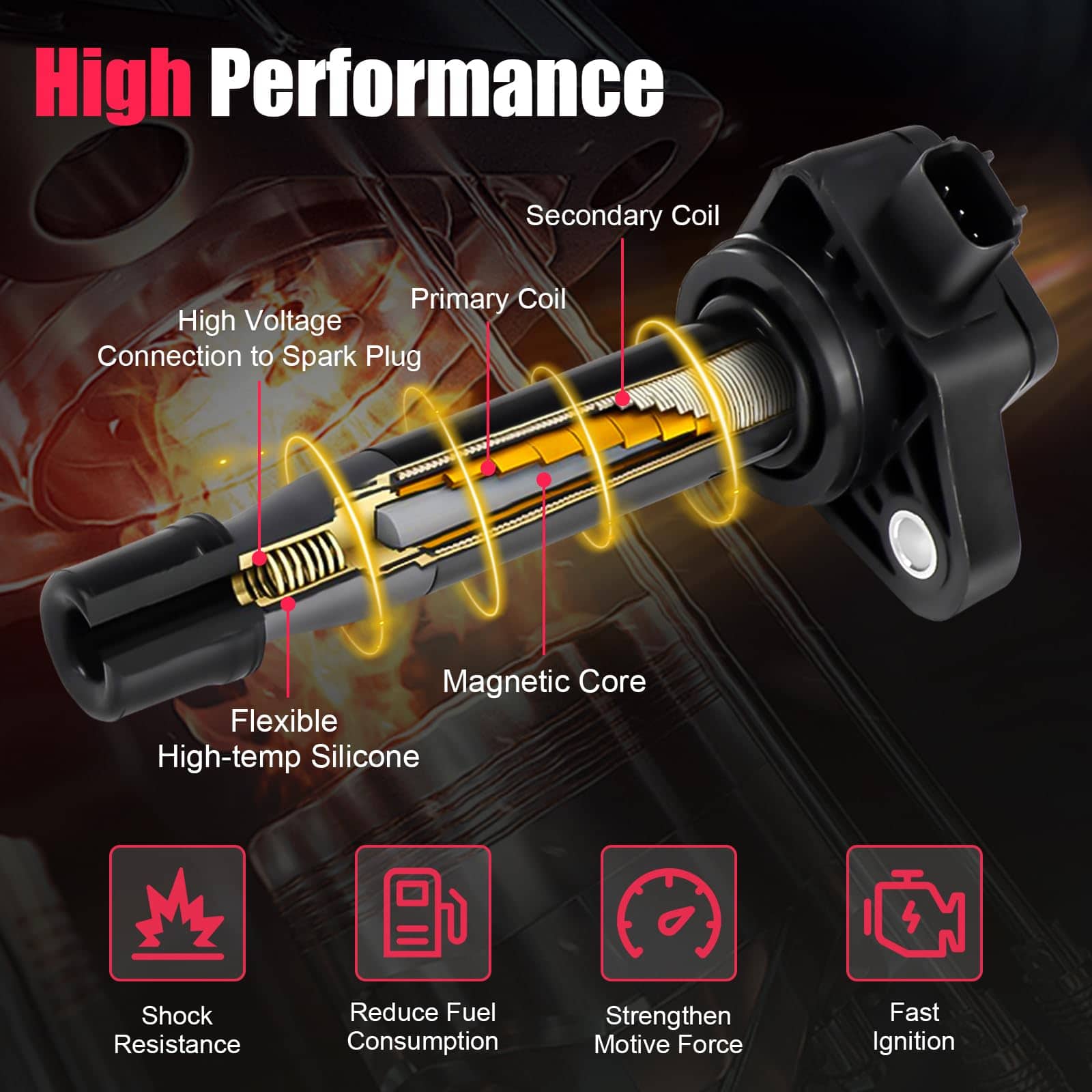 4. Excelente función: Después de aproximadamente 50,000 kilómetros de conducción, sus Paquetes de bobinas pueden comenzar a mostrar signos de envejecimiento, lo que potencialmente puede provocar fallos en el motor, ralentí áspero, disminución de la potencia y mala economía de combustible. Nuestros Paquetes de bobinas meticulosamente diseñados y mejorados están diseñados para superar los estándares OEM, asegurando una instalación sin esfuerzo y mejorando drásticamente el rendimiento. Experimente capacidades excepcionales de arranque en frío y un funcionamiento más suave del motor.