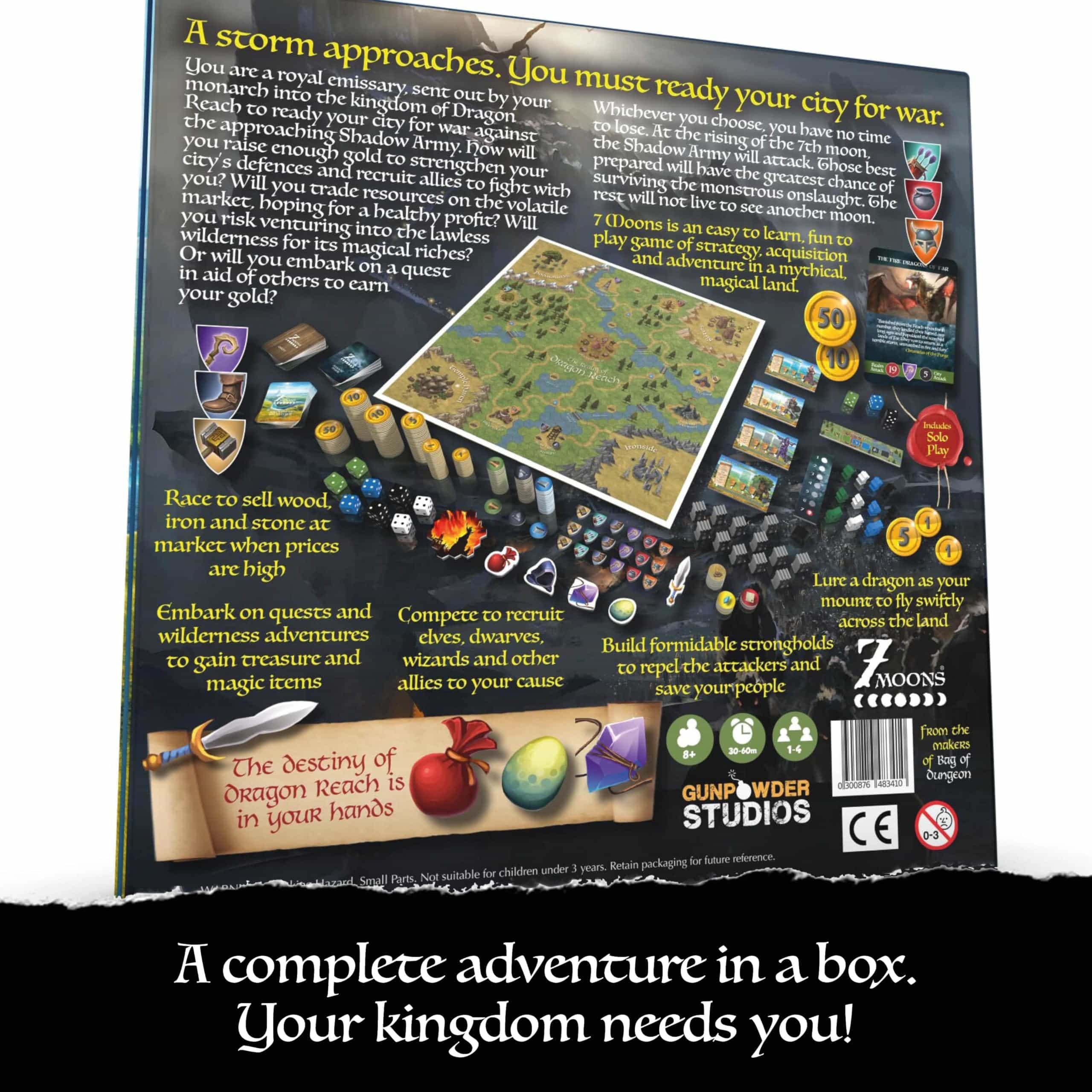 El reino mágico en el que se desarrolla 7 Moons está tejido ricamente en el juego, brindando a los jugadores una experiencia inmersiva con ellos en el centro de la aventura. Juegas como emisarios reales, enviados por tu monarca al reino de Dragon Reach para preparar tu ciudad para la guerra contra el ejército sombrío que se acerca. ¿Cómo conseguirás suficiente oro para fortalecer las defensas de tu ciudad y reclutar aliados para luchar contigo? ¿Comerciarás recursos en el volátil mercado, esperando un buen beneficio? ¿Arriesgarás aventurarte en la naturaleza salvaje por sus riquezas mágicas? ¿O emprenderás una misión en ayuda de otros para ganar tu oro? ¿Qué tipo de juego es 7 Moons? 7 Moons es un juego fácil de aprender, divertido de jugar de estrategia, adquisición y aventura en una tierra mítica mágica. El juego incluye una agradable mezcla de mecánicas – comercio, búsqueda, viaje, construcción y combate – para mantener las cosas interesantes y dar a los jugadores muchas opciones sobre cómo se desarrolla su aventura. El ejército sombrío es un duro oponente al final del juego, pero si has planeado y jugado bien, tu ciudad estará bien. Probablemente. Posiblemente. Tu viaje te espera…