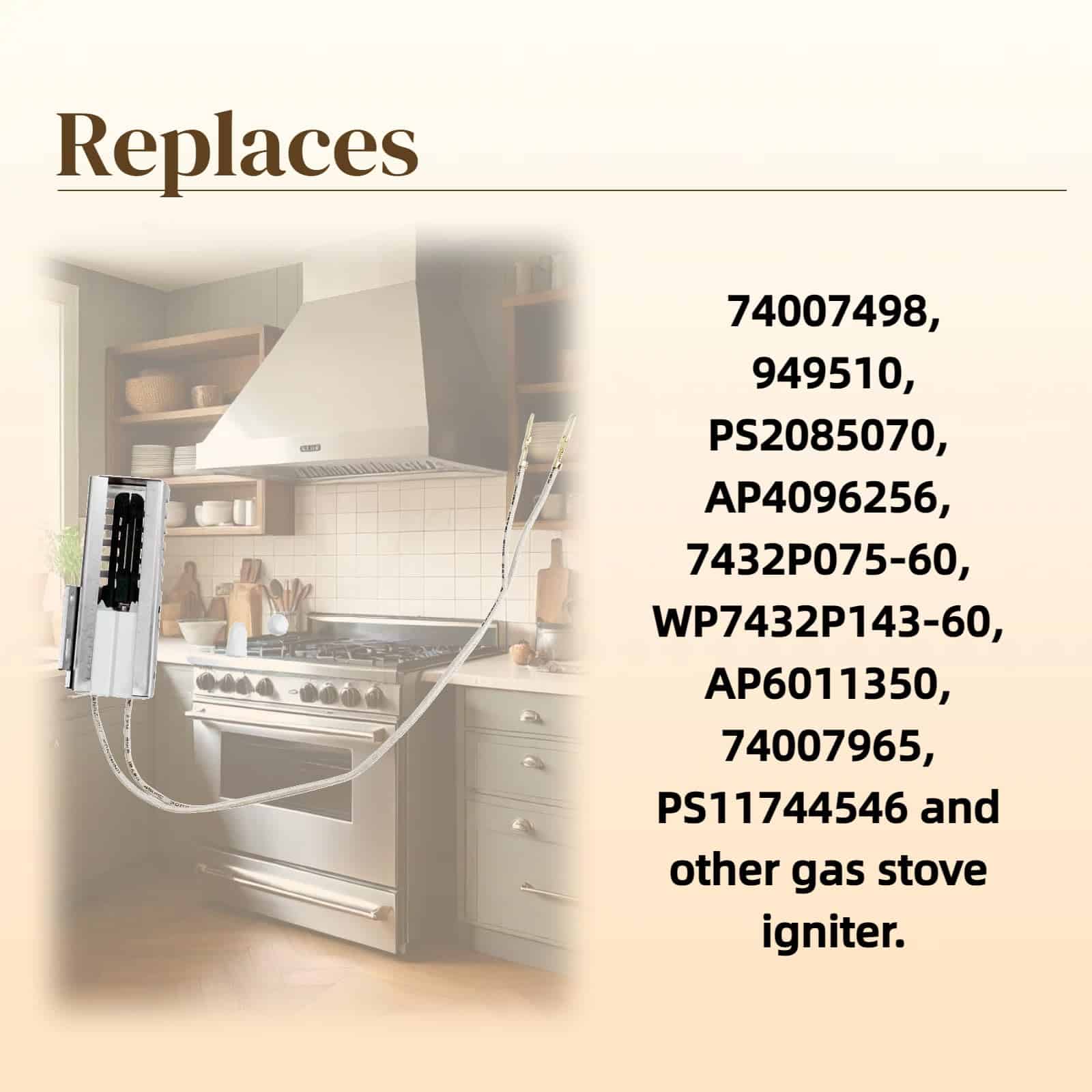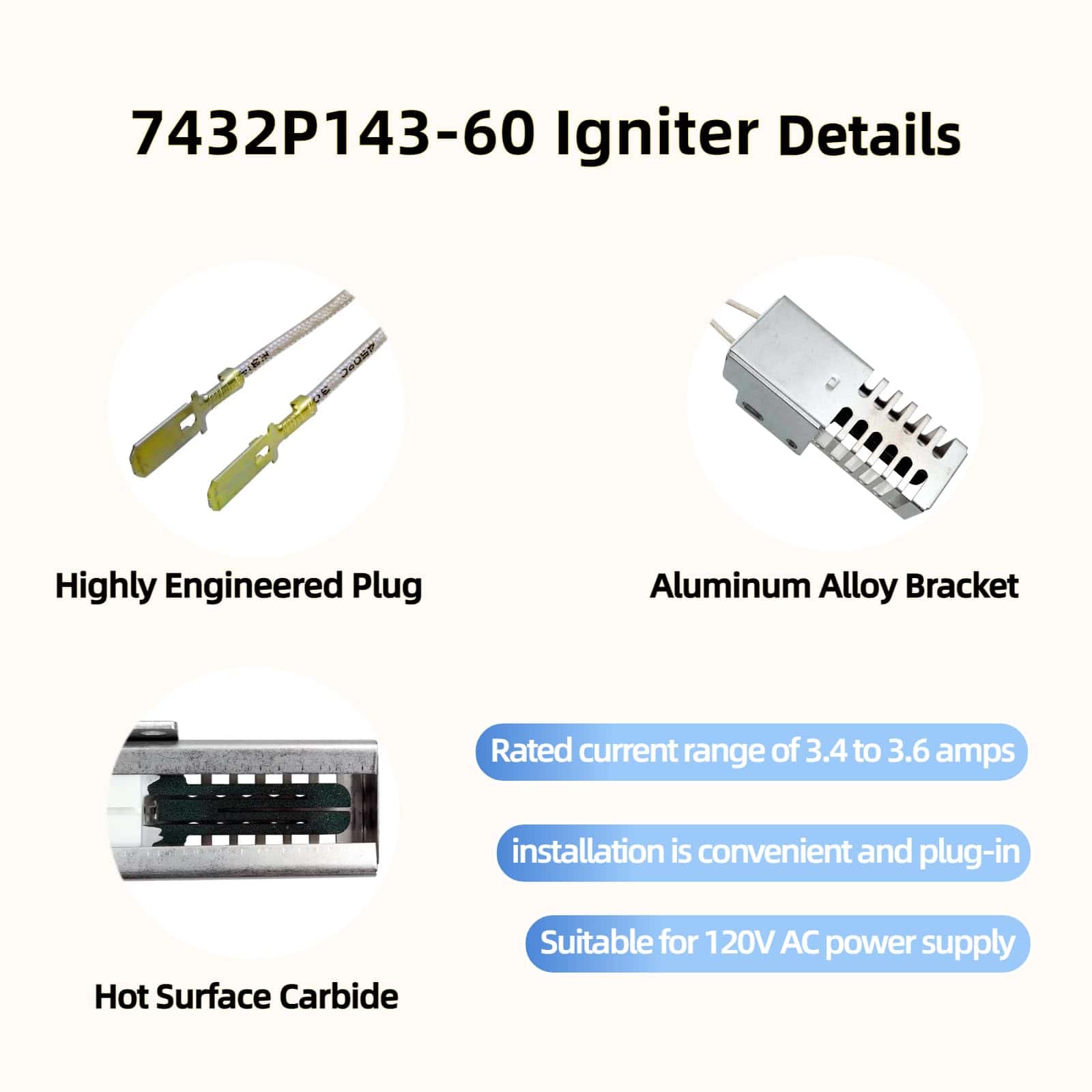2. Reemplazo: 74007498, 949510, PS2085070, AP4096256, 7432P075-60, WP7432P143-60, AP6011350, 74007965, PS11744546. El encendedor tiene un rango de corriente nominal de 3,4 a 3,6 amperios, es adecuado para una fuente de alimentación de 120V AC, y la instalación es conveniente y enchufable, no requiere herramientas complejas. PRECAUCIÓN: Desembale y maneje con cuidado: el elemento del encendedor es extremadamente frágil y sensible a la contaminación, no debe tocarse bajo ninguna circunstancia.
