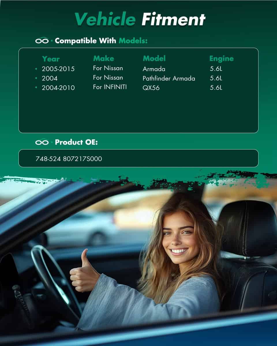 Posición: Delantero Izquierdo, Lado del Conductor. OEM Número: 748-524, 807217S000. Compatible con: Infiniti QX56 2004-2010, Nissan Armada 2005-2015, Nissan Titan 2004-2015, Nissan Pathfinder Armada 2004.