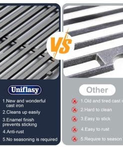 1. Se ajusta perfectamente a las parrillas para Weber 7637 y las parrillas para gas de la serie Spirit 200 de Weber: Spirit (2 quemadores) Spirit E-210, Spirit E-220, Spirit S-210, Spirit S-220 (Años Modelo 2013-2017) con paneles de control montados en la parte delantera. 2 parrillas de reemplazo para Weber 46010074, 46100001 (2013), 46110001, 46113101, 47100001 (2013) parrillas de gas. También compatible con la serie Spirit II 200, spirit ii e-210 e-220 spirit ii s-210 spirit s-220. NOTA: NO se ajusta a la parrilla de gas de la serie spirit 200 con paneles de control montados en el lateral. 2. Dimensiones – 17.5″ x 10.2″ cada una, 17.5″ x 20.5″ para 2 unidades. En la caja – Juego de 2 parrillas para parrilla. Material – Hierro fundido resistente. Por favor, revisa Doble la dimensión y el modelo de tu parrilla antes de ordenar. Si la parrilla recibida está dañada, contáctanos a tiempo, te reemplazaremos la nueva, gracias. 3. Retiene el calor – Las parrillas de hierro fundido no solo calientan de manera uniforme y retienen el calor de manera excelente, sino que también entregan un sellado profesional, capaz de producir marcas prominentes de sellado. 4. Extremadamente duradero – Hecho de hierro fundido duradero para garantizar un uso duradero. No se astilla ni se oxida como las barras esmaltadas, más duradero y deja hermosas marcas de sellado en la comida. 5. Antiadherente y fácil de limpiar – La superficie de la rejilla tiene un acabado de esmalte de porcelana mate que evita que se pegue y permite una fácil limpieza.