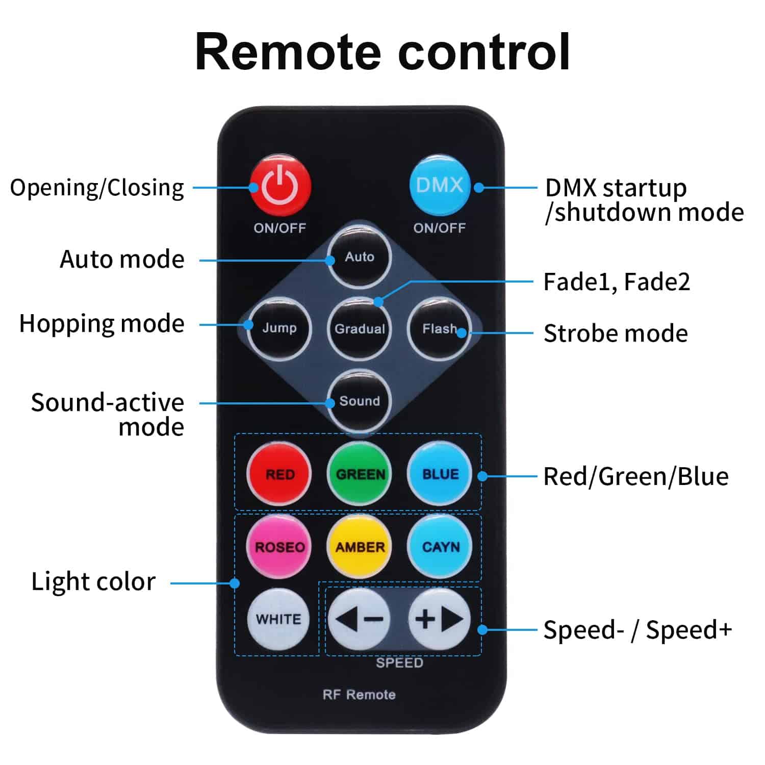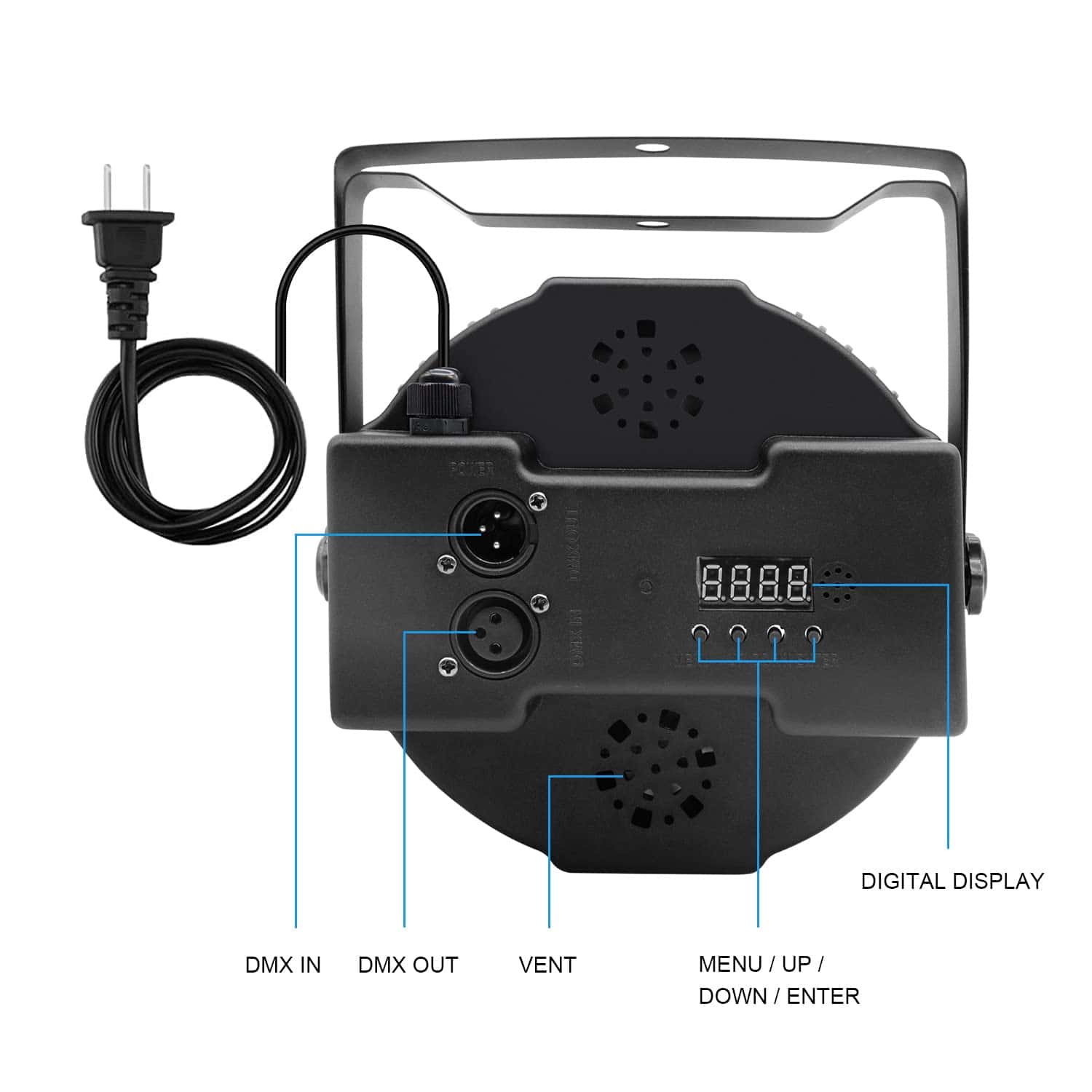 The inputs and outputs of the DMX port are located on the back of the spotlight to control led par.You can turn on/off, switch modes, and change colors by pressing the button on the back of DJ lights.More importantly, the stage lights can record your last operation unnecessary to reset.