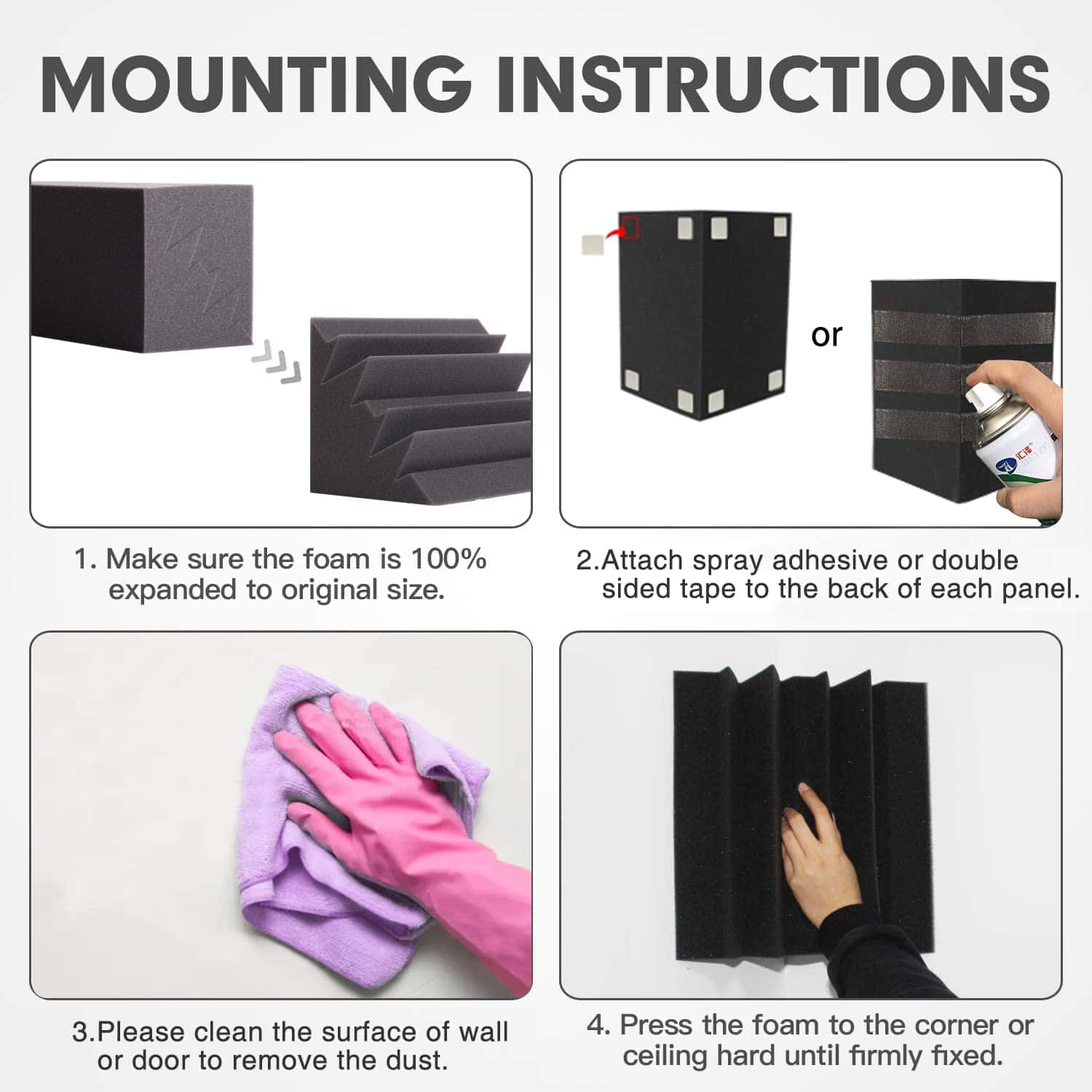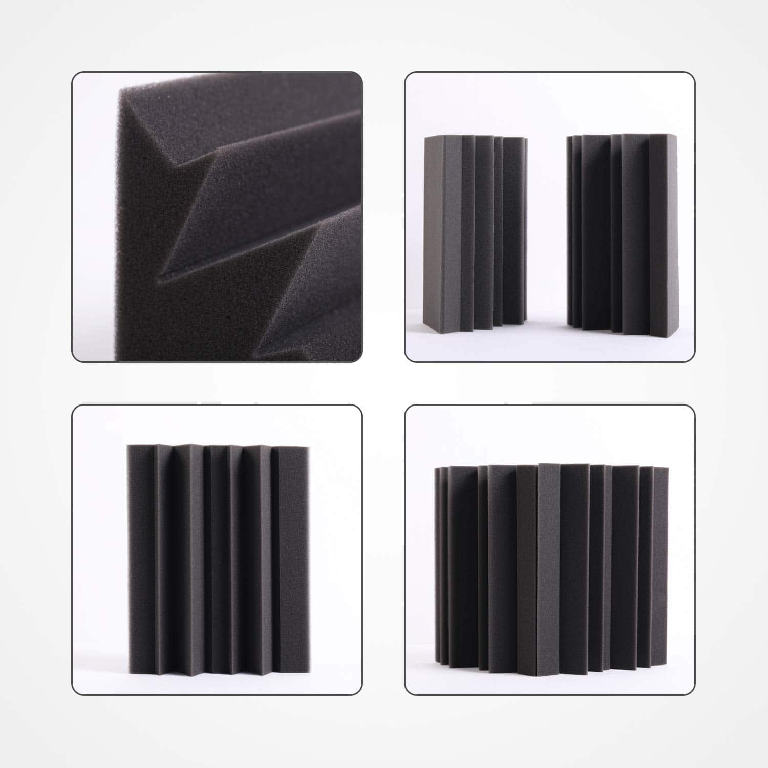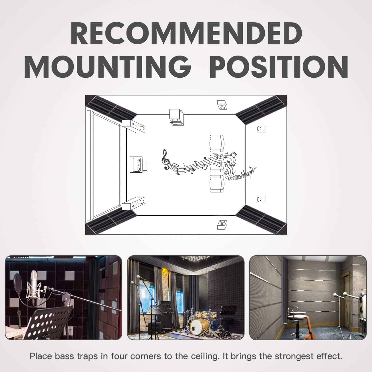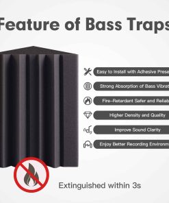 –Esquina de trampa de bajos de espuma de alta densidad e ignífuga para procesar las bajas frecuencias del sonido. Aprobó el estricto estándar de prueba de CA BULLETIN CAL 117-versión 2013, Parte 3. Alta densidad significa una mayor absorción del sonido. El producto ignífugo proporciona un entorno de montaje mucho más seguro.