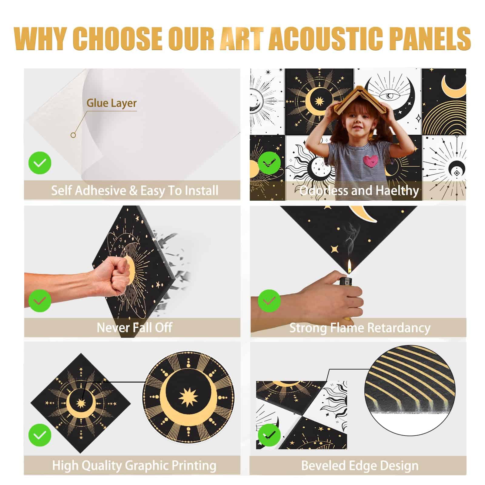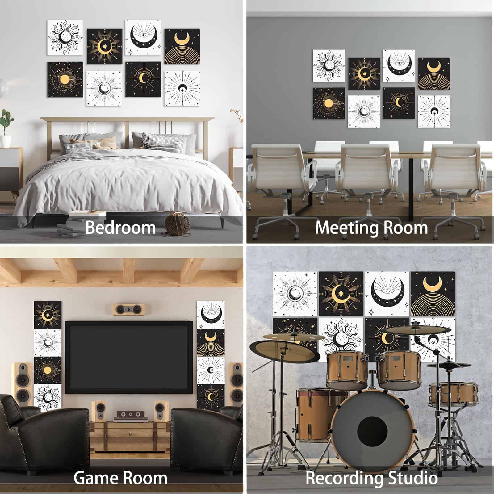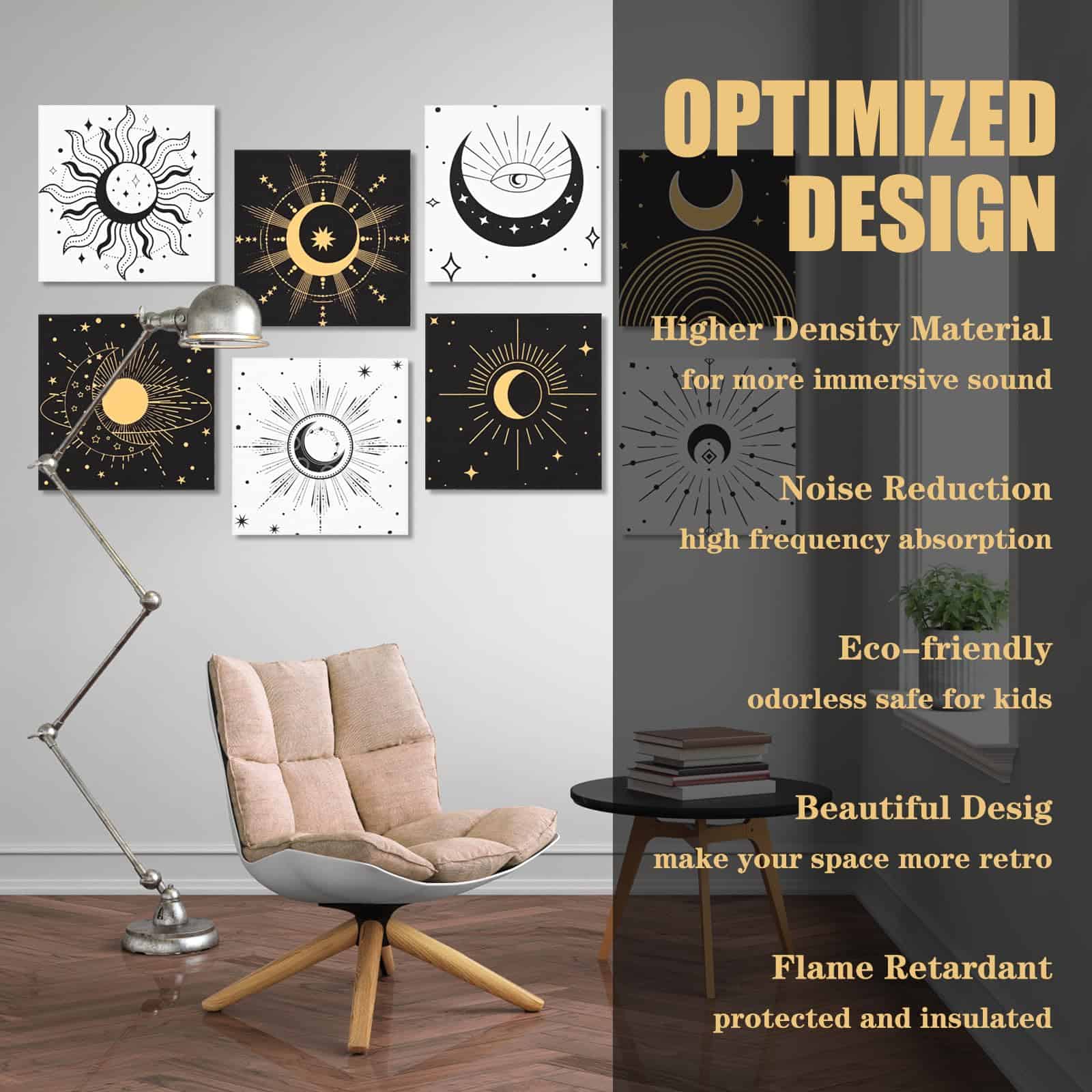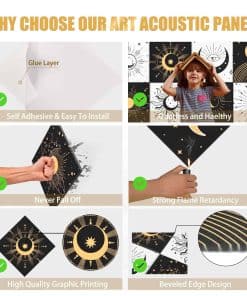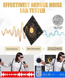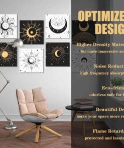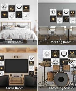 8 Pack Paneles Acústicos de Arte Auténticamente Diseñados: Los Paneles Acústicos de Arte no solo ofrecen una excelente función de control de aislamiento acústico, sino que también incorporan un diseño artístico. Con un elegante diseño de estilo bohemio gótico con elementos de estrellas y lunas, estos paneles acústicos aportan belleza y personalidad al espacio interior, permitiendo que el control del sonido se fusione perfectamente con la decoración de la pared interior. Fáciles de Instalar y Sin Herramientas Necesarias: Nuestros paneles de pared a prueba de sonido están diseñados para la simplicidad con su sistema autoadhesivo. No se necesitan herramientas ni pegamento, simplemente péguelos en la pared para una instalación fácil y fuerte. Disfrute rápidamente de la comodidad acústica que ofrecen estos paneles. Excelente Aislamiento Acústico y Material Duradero: Fabricados con material de alta densidad de 9.4 lb/ft3, estos paneles acústicos pueden bloquear eficazmente la transmisión del sonido, brindando una mejor experiencia de aislamiento acústico. Hechos de poliéster de alta calidad 100% retardante de llama, inodoro, no tóxico, resistente a la corrosión y a la decoloración, estos paneles acústicos son seguros y confiables, brindándole una larga experiencia de uso. Diseñados para Varios Entornos Interiores: Los paneles de arte acústico son adecuados para una variedad de entornos interiores, como hogares, estudios profesionales, teatros caseros, oficinas, etc. para satisfacer las necesidades de diferentes lugares. Brindan una calidad de vida mejorada al reducir eficazmente el ruido y las molestias. Disfrute gratis de esta mejora en su calidad de vida con la compra de estos paneles. Compre con Confianza y Servicio al Cliente Personalizado: 100% de servicio de devolución e intercambio. Si tiene algún problema con nuestros productos, no dude en contactarnos. Contamos con ingenieros acústicos profesionales que analizarán su situación específica y garantizarán una experiencia de compra satisfactoria para usted y su hogar, estudio u oficina.