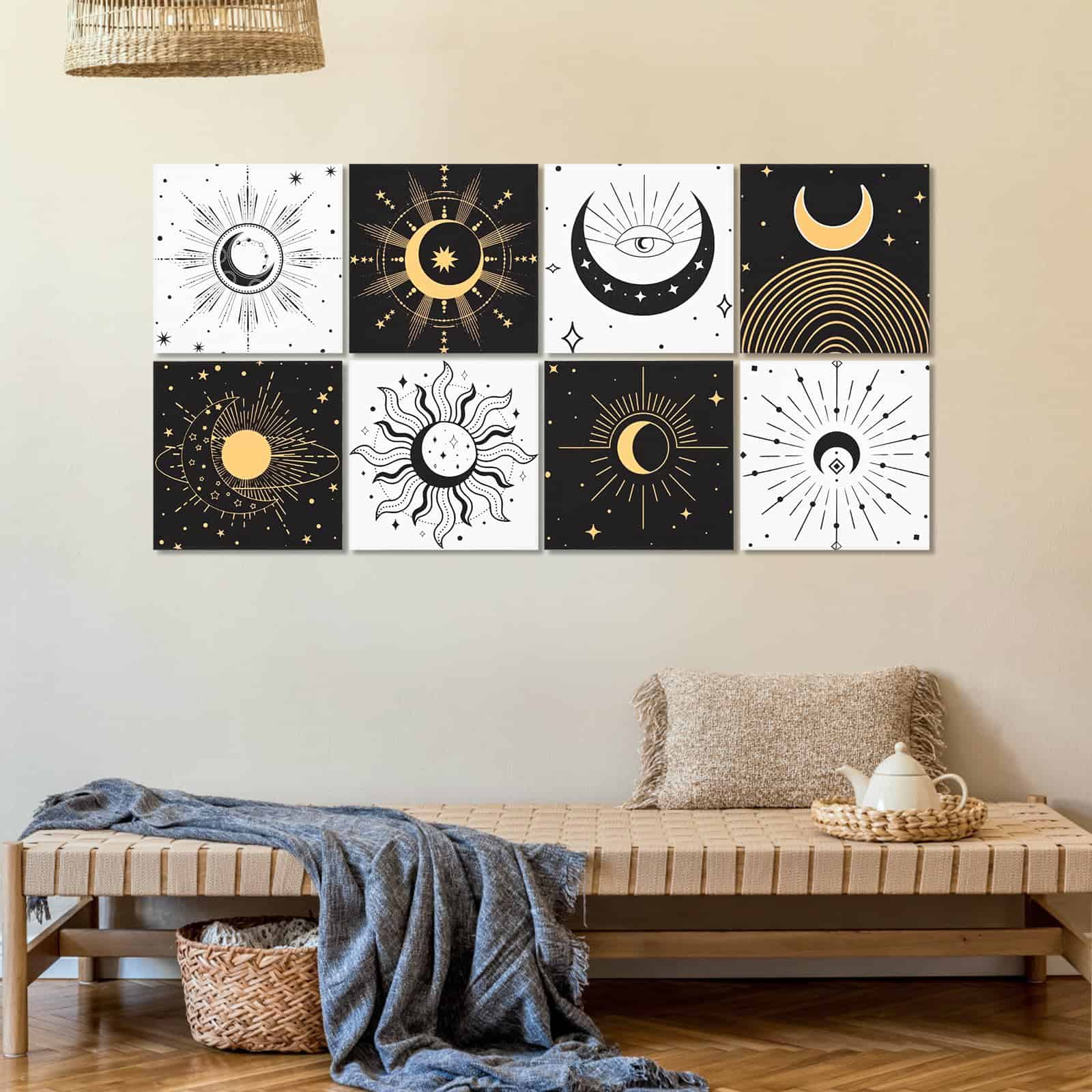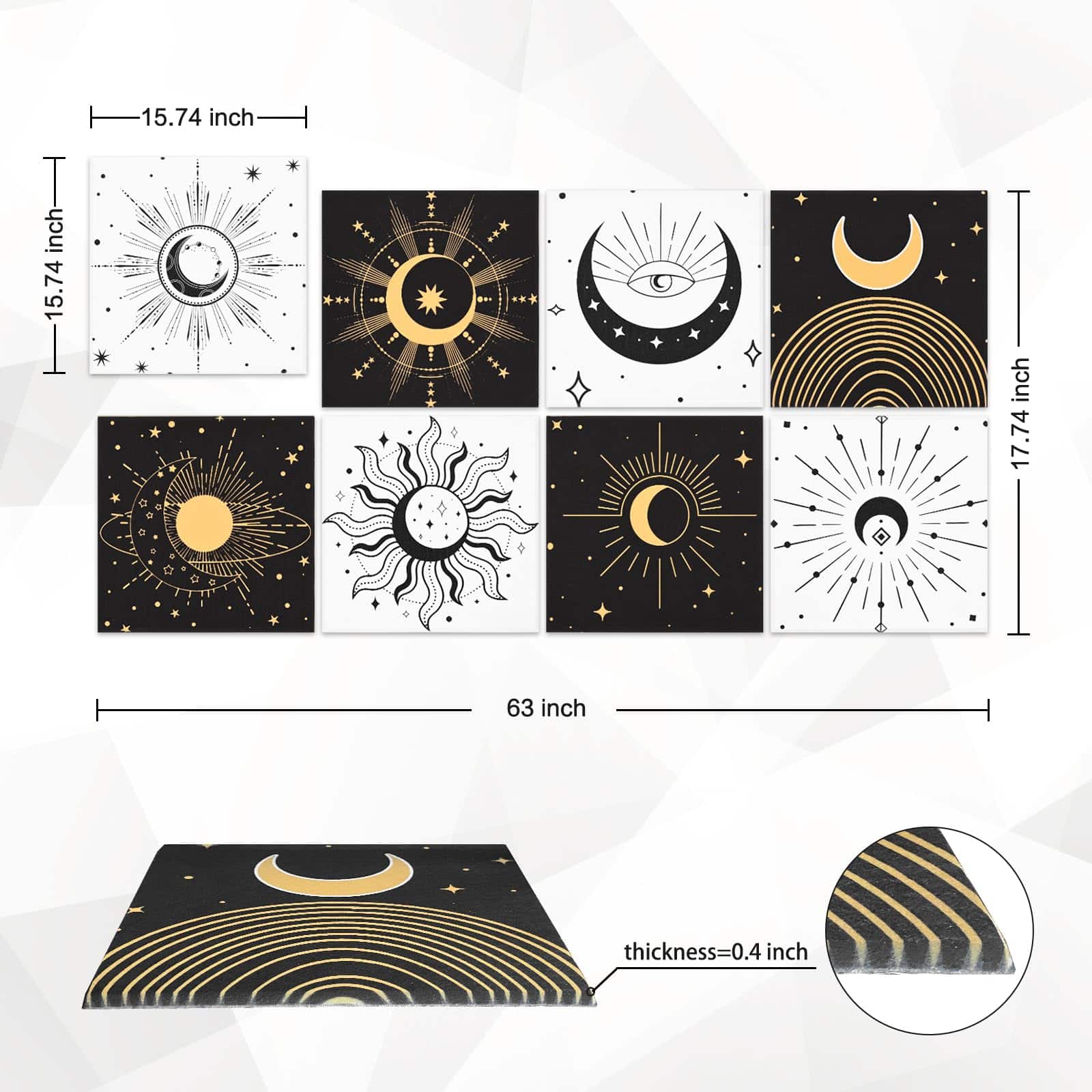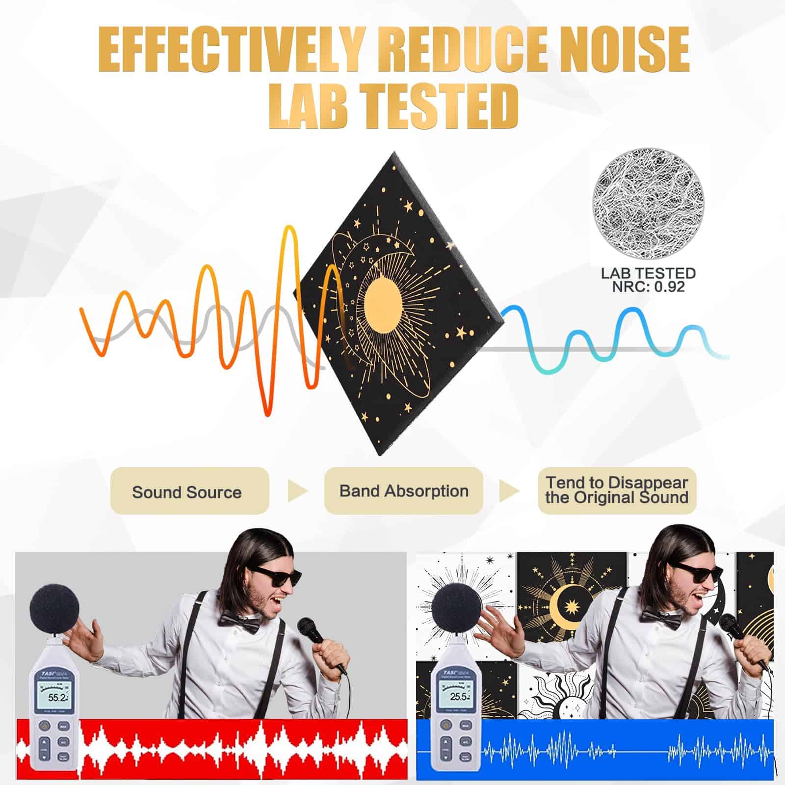 8 Pack Paneles Acústicos de Arte Auténticamente Diseñados: Los Paneles Acústicos de Arte no solo ofrecen una excelente función de control de aislamiento acústico, sino que también incorporan un diseño artístico. Con un elegante diseño de estilo bohemio gótico con elementos de estrellas y lunas, estos paneles acústicos aportan belleza y personalidad al espacio interior, permitiendo que el control del sonido se fusione perfectamente con la decoración de la pared interior. Fáciles de Instalar y Sin Herramientas Necesarias: Nuestros paneles de pared a prueba de sonido están diseñados para la simplicidad con su sistema autoadhesivo. No se necesitan herramientas ni pegamento, simplemente péguelos en la pared para una instalación fácil y fuerte. Disfrute rápidamente de la comodidad acústica que ofrecen estos paneles. Excelente Aislamiento Acústico y Material Duradero: Fabricados con material de alta densidad de 9.4 lb/ft3, estos paneles acústicos pueden bloquear eficazmente la transmisión del sonido, brindando una mejor experiencia de aislamiento acústico. Hechos de poliéster de alta calidad 100% retardante de llama, inodoro, no tóxico, resistente a la corrosión y a la decoloración, estos paneles acústicos son seguros y confiables, brindándole una larga experiencia de uso. Diseñados para Varios Entornos Interiores: Los paneles de arte acústico son adecuados para una variedad de entornos interiores, como hogares, estudios profesionales, teatros caseros, oficinas, etc. para satisfacer las necesidades de diferentes lugares. Brindan una calidad de vida mejorada al reducir eficazmente el ruido y las molestias. Disfrute gratis de esta mejora en su calidad de vida con la compra de estos paneles. Compre con Confianza y Servicio al Cliente Personalizado: 100% de servicio de devolución e intercambio. Si tiene algún problema con nuestros productos, no dude en contactarnos. Contamos con ingenieros acústicos profesionales que analizarán su situación específica y garantizarán una experiencia de compra satisfactoria para usted y su hogar, estudio u oficina.