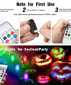 Cómo empezar: Carga cada luz estroboscópica mini durante 5 segundos, luego desconecta el cable USB. Presiona y mantén presionado el botón ON del control remoto para empezar. Esto debe hacerse dentro de 1 minuto desde que desconectaste el cable.
