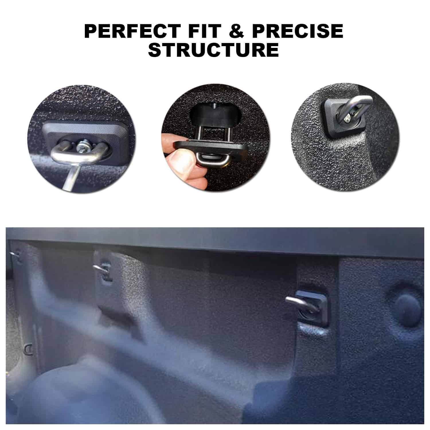 Pasos sencillos para instalar anclajes retráctiles: Retire los tornillos; Baje un lado de la base en el bolsillo del poste; Centra el anillo en el agujero; Levante mediante el anillo y «enganche» detrás del labio del bolsillo; Tire hacia arriba del anillo mientras coloca los tornillos; Apriete manualmente con un destornillador Phillips; No apriete en exceso. Aplicación: Compatible con Silverado Sierra 2007-2019 Colorado & Canyon 2015-2019. Paquete: 9 Anclajes para camioneta con hardware de montaje y juntas.