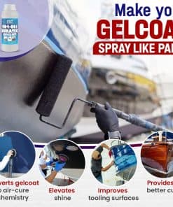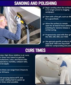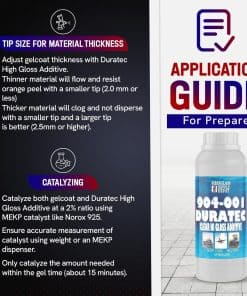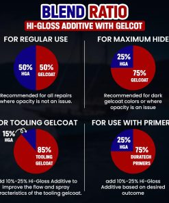 Obtendrá un acabado superior, añadirá calidad y ahorrará tiempo y mano de obra con el aditivo de poliéster Duratec Hi-Gloss. Baja porosidad: cuando se utiliza para reparaciones, la mezcla del aditivo con el gelcoat produce una superficie de baja porosidad. Piel de naranja reducida: la baja viscosidad de la mezcla resulta en un acabado suave que se lija fácilmente. Propiedades mejoradas: para superficies de molde, la mezcla del aditivo con el gelcoat de conformado crea una temperatura de distorsión térmica más alta, una mejor retención del brillo, una mayor resistencia al impacto y una porosidad subsuperficial reducida. Acabado superior: cuando se mezcla uno a uno con gelcoats, el aditivo crea un revestimiento al aire, similar al esmalte. No se necesita ningún aditivo de secado al aire. Cuando se utiliza para reparar el gelcoat, las superficies se restauran a condiciones como nuevas. Use un gelcoat sin cera con este producto.