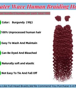99J Cabello Trenzado de Agua Ondulada Hecho de Cabello Humano para Trenzar Bohemio sin Nudo 2 Paquetes 100g 20 pulgadas Sin Trama 10A Extensiones de Cabello Humano Virgen Brasileño Ondulado para Trenzas Boho. Nuestro cabello para trenzas humanas está hecho de cabello humano virgen brasileño de alta calidad, asegurando su suavidad y apariencia natural. Ya sea que prefieras un look completo y lujoso o una apariencia más natural, nuestro cabello humano para trenzar boho tiene todo lo que necesitas. Este cabello para trenzas boho sin nudos está diseñado para resistir el uso diario. Es libre de enredos, resistente a la caída y mantiene su brillo natural incluso después de varios lavados. Puedes disfrutar de trenzas boho hermosas y duraderas con este cabello de alta calidad. Las trenzas de cabello humano rizado son versátiles, no solo adecuadas para trenzas boho, trenzas sin nudos, trenzas cuadradas, trenzas cosidas y giros. También se pueden crear fácilmente diferentes estilos a la moda, dándote un estilo y encanto únicos, permitiéndote personalizar fácilmente tu peinado trenzado para adaptarse a cualquier ocasión o atuendo. Nuestro cabello para trenzas humanas es naturalmente cómodo y ligero de usar, te permite obtener fácilmente el grosor y la longitud necesarios para el cabello boho para trenzar sin sentirte pesado o voluminoso. Si te gusta una cabeza llena de trenzas, te recomiendo comprar 3-4 paquetes. El cabello trenzado humano de onda profunda está especialmente diseñado para extensiones trenzadas. A diferencia del cabello humano a granel suelto, la textura de onda profunda es suave en tu cuero cabelludo y proporciona una sensación suave y sedosa. Se puede alisar, tenir, decolorar, rizar y volver a peinar para adaptarse a tu look deseado