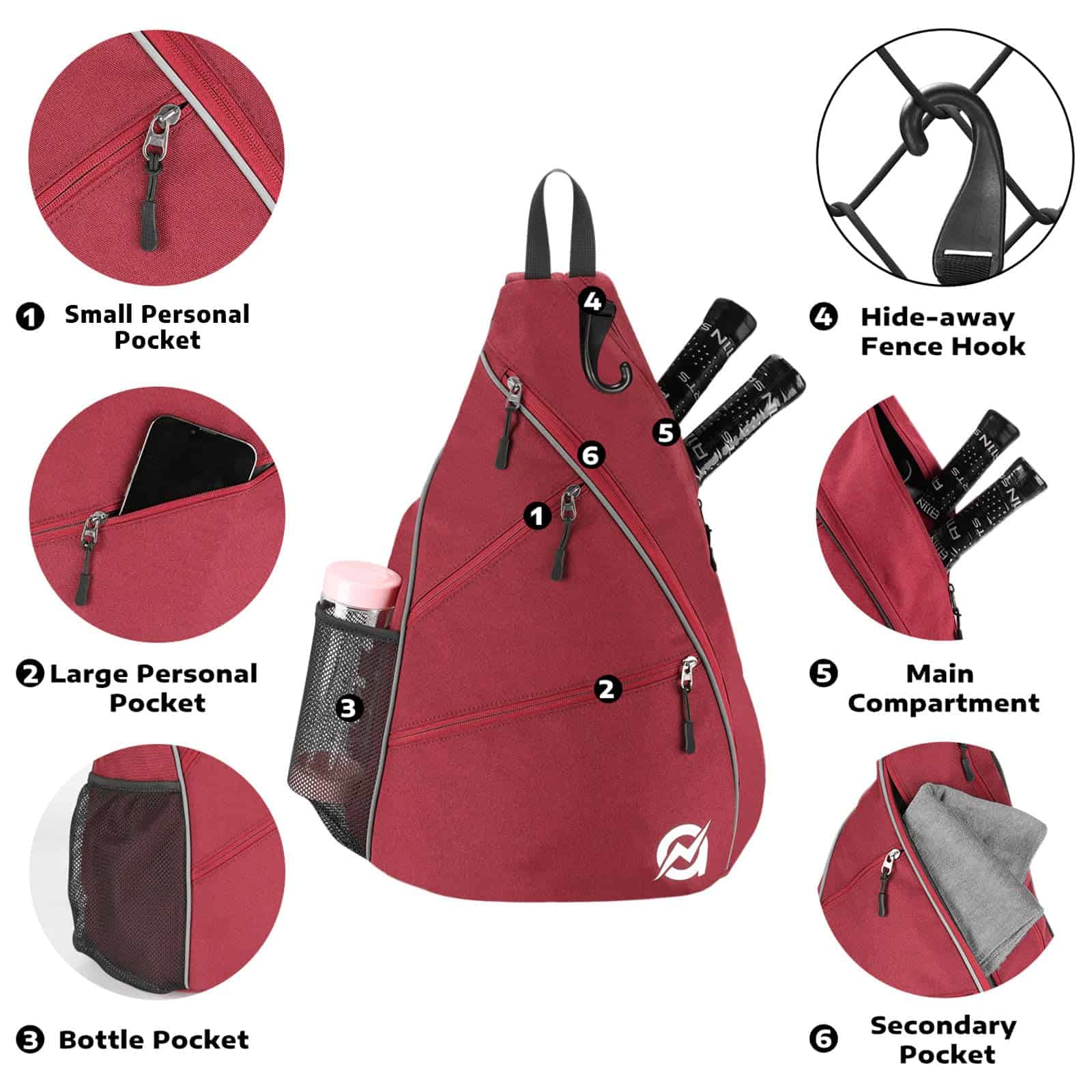 4. Gancho de valla oculto: Hay un gancho de valla oculto en el compartimento principal, puedes colgar convenientemente la bolsa en la cancha de pickleball.