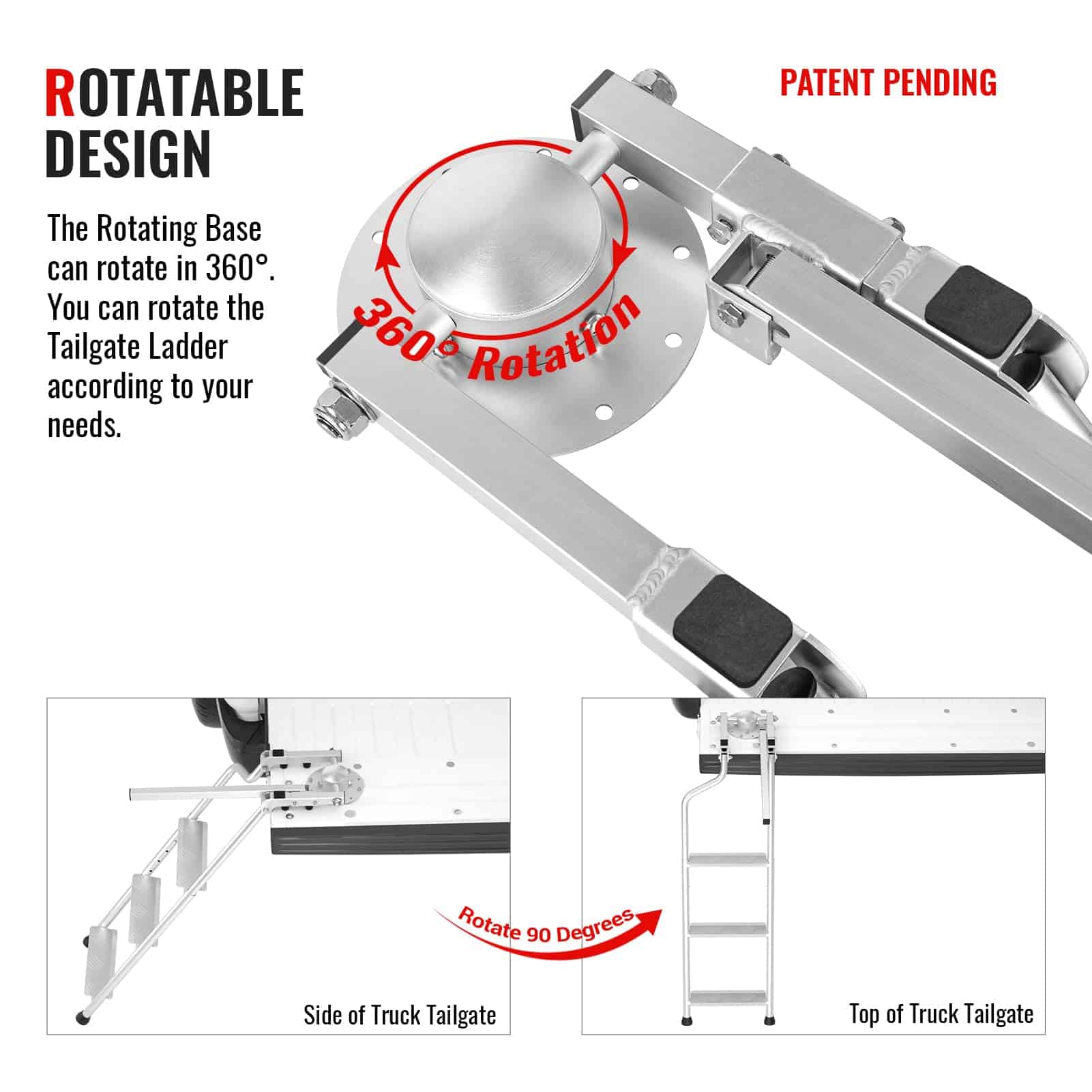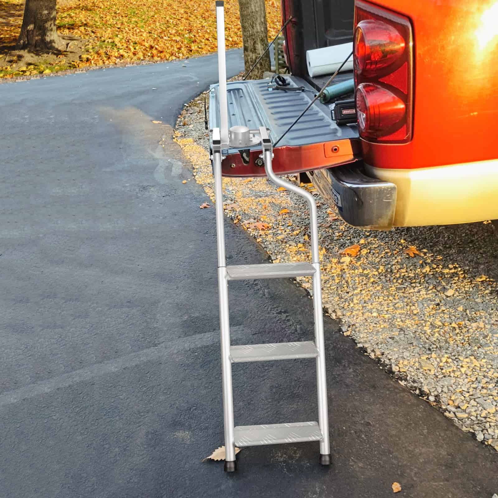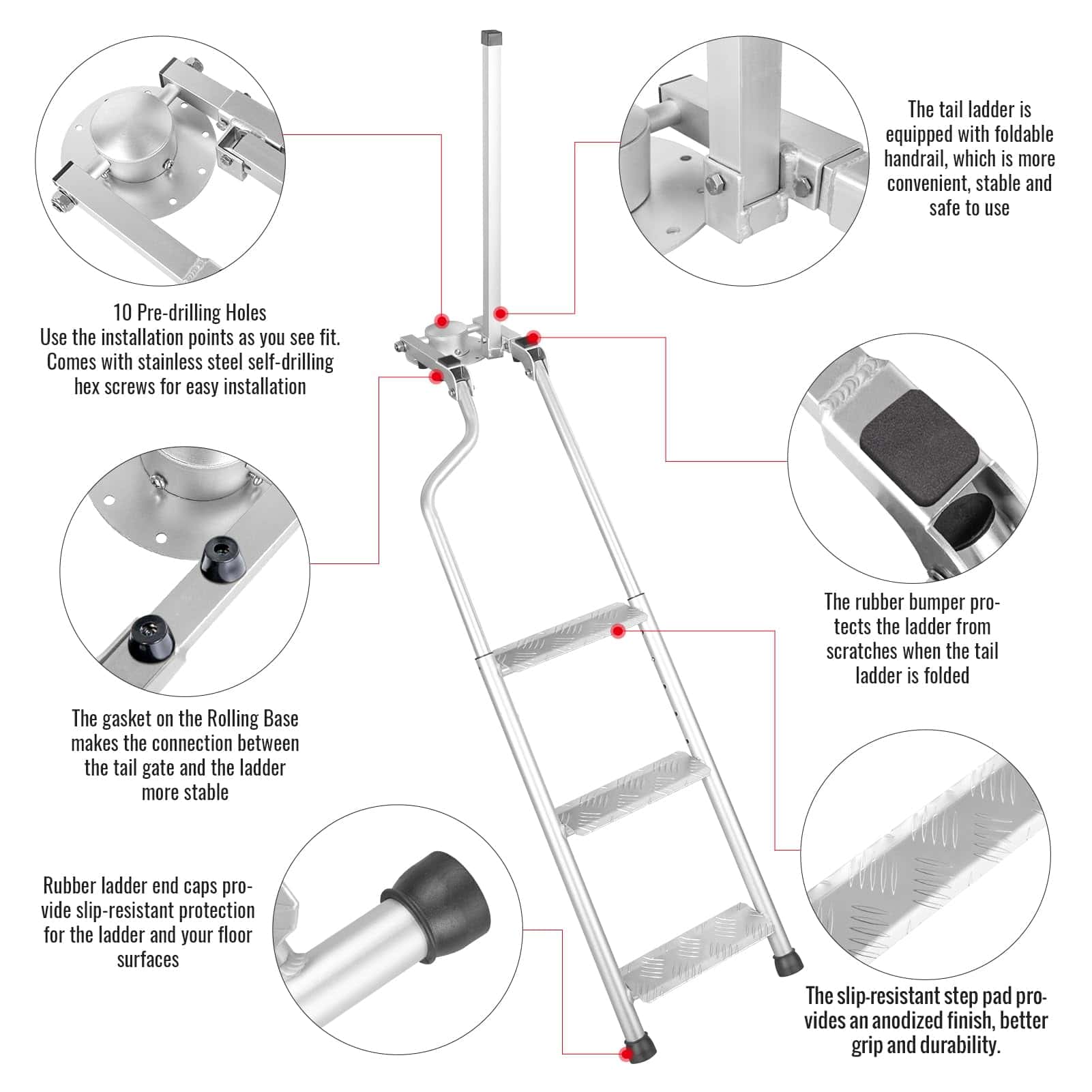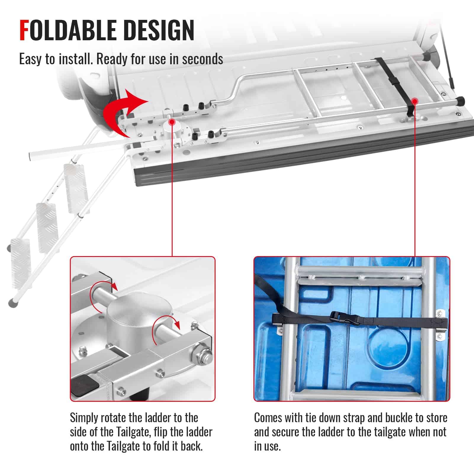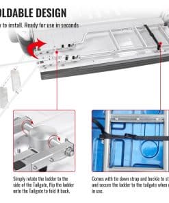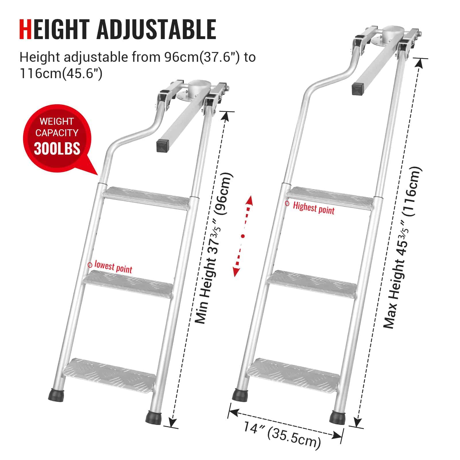3. AJUSTABLE EN ALTURA: EXCELENTE CAPACIDAD DE CARGA; Esta escalera para engranajes traseros es ajustable de 37.6″ a 45.6″. Convierta este accesorio para camioneta en alturas correspondientes de camiones de 28-45″. Esta expansión de producto es suave, se fija firmemente. Y la capacidad de carga sigue siendo excelente hasta 300 lb.