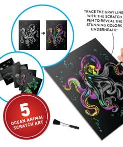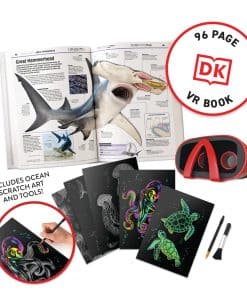3. ¡Lo que hay en la caja! Este set de regalo de lujo incluye un libro interactivo de 96 páginas, con un set de grabado de rasguño coleccionables para crear tu propio arte vibrante de animales marinos, junto con un par de gafas de RV!