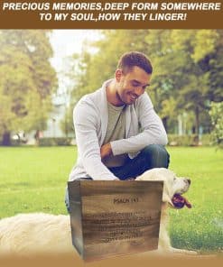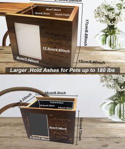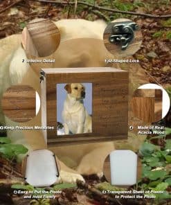 AMOR y MISERICORDIA: Preciosos Recuerdos, Profundos de Algo a Mi Alma, Cómo Perduran. Cantando de la Vieja Época, Brillantes-Tiernos Fluyendo, que las Oraciones nos Seguirán. Como miembro de nuestra familia, el amigo honesto, Su fallecimiento le hace absorber la tristeza, lo cual es muy comprensible. Elegancia y Dignidad: Si bien es comprensible que nada puede reemplazar a la mascota perdida, uno de los mayores consuelos puede ser crear un recuerdo final digno y elegante en su memoria. Nuestro producto, un lugar de descanso final para su mascota, ofrece una manera suave de conmemorar a su miembro de la familia, permanecer en su pensamiento profundo del amado él/ella. Agradecidamente, Dios nos Trae a Vencer la Tristeza y Obtener Paz en el Corazón. La muerte puede ser un corto sueño pasado, él/ella se despierta eternamente. Tamaño y capacidad: Adecuado para Caninos de Gran/ Mediano tamaño, Gatos u otros Animales Grandes. Tamaño total: 8.3″L x 6″An x 7″Alt, Volumen de 348 cu.in. Tamaño interior: 7.1″L x 5.1″An x 6.3″Alt, Volumen de 228 cu.in., adecuado para las cenizas de perros de hasta 180 libras. Más Detalles: 1.Salmo Bíblico en la parte posterior 2.hecho de madera de acacia auténtica, verdadera madera dura de toda la caja 3.foto estándar de 5 pulgadas(5″L x3.5″Alt), no es necesario cortar la imagen 4.Cerradura en forma de U y tapa superior 5.un marco de foto incorporado con una hoja de plástico transparente para proteger la foto y consejos de metal interiores para colocar la foto fácilmente y sostenerla firmemente Consejos Cálidos: 1.Debido a las diferentes pantallas de computadora y la particularidad de la madera natural, el color del objeto puede ser ligeramente diferente a la imagen de la lista. Gracias por su comprensión. 2. Madera natural con algunas hendiduras naturales, pertenecen al crecimiento normal causado, no afectarán el uso del producto. 3. Los restos deben estar en una bolsa o contenedor duradero antes de descansar en la caja, ya que no es hermético.