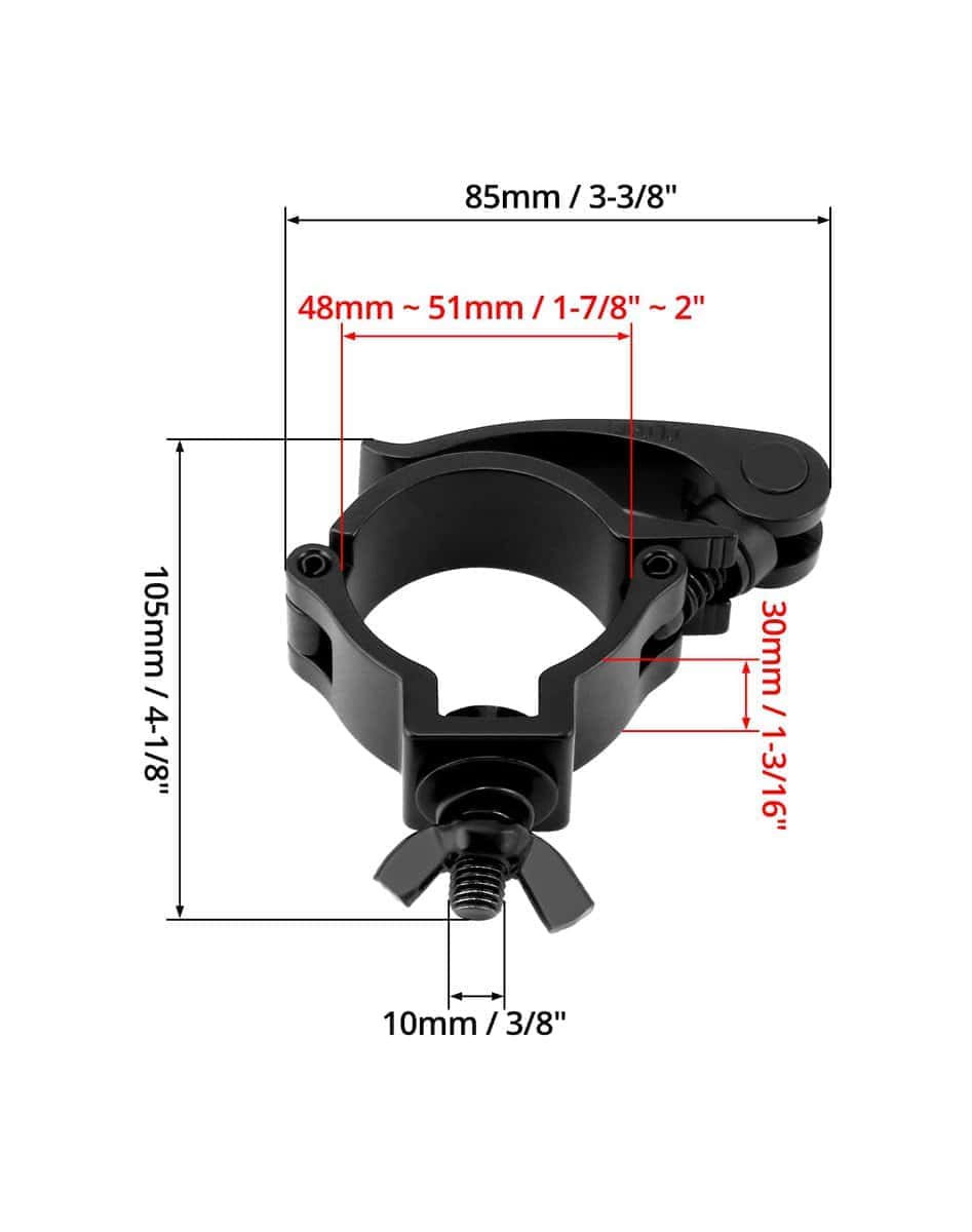 1. Versátil y confiable: Estas abrazaderas de iluminación para escenarios de DJ de 2 pulgadas están diseñadas para luces de escenario de seguridad y otras luces con un agujero de instalación de 10 mm de diámetro, proporcionando un método de fijación seguro y estable. 2. Construcción robusta: Fabricadas en aleación de aluminio 6061, estas abrazaderas pueden soportar cargas pesadas con una capacidad de peso de hasta 220 libras, garantizando la seguridad de su valioso equipo de iluminación. 3. Instalación fácil: Con un diseño de liberación rápida y cierre rápido, estas abrazaderas ofrecen una instalación eficiente y sin complicaciones, ahorrándole tiempo valioso durante la configuración. 4. Compatibilidad universal: Con un rango de diámetro de tubo/pipe adecuado de 48-51mm OD, estas abrazaderas son ideales para una variedad de aplicaciones como escenarios, cabinas de DJ, bares, pubs, eventos, teatros y discotecas. 5. Estable: Monte de forma segura su iluminación de escenario con el paquete de 10 abrazaderas de iluminación para escenarios de DJ de 2 pulgadas.
