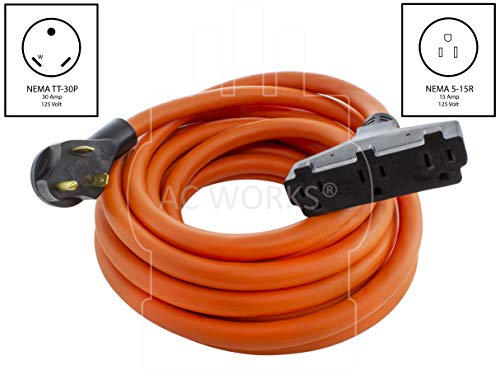 Este adaptador de marca AC WORKS TT30W515 es muy duradero. Viene en 1.5 pies o 25 pies de longitud y tiene un enchufe macho NEMA TT-30P a (3) tomas NEMA 5-15R. El NEMA TT-30P es un enchufe macho de 30 Amperios, 125 Voltios. El NEMA 5-15R es un conector hembra de 15 Amperios, 125 Voltios. Este producto es un adaptador RV/Generador y es anti-frío para mantenerse flexible en temperaturas extremas. El cable es STW, 10/3, 600 Voltios con un indicador de encendido. Incluido con su compra hay una garantía limitada de 5 años.
