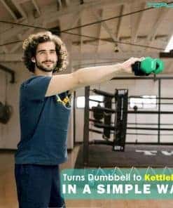 3. Conversión a Kettlebell. Nuestro accesorio para el pie de la mancuerna también funciona como una simple herramienta de conversión a kettlebell. Adjunta la correa a una mancuerna y al instante transfórmala en una kettlebell. ¡Realiza columpios de kettlebell incluso sin una kettlebell dedicada!.