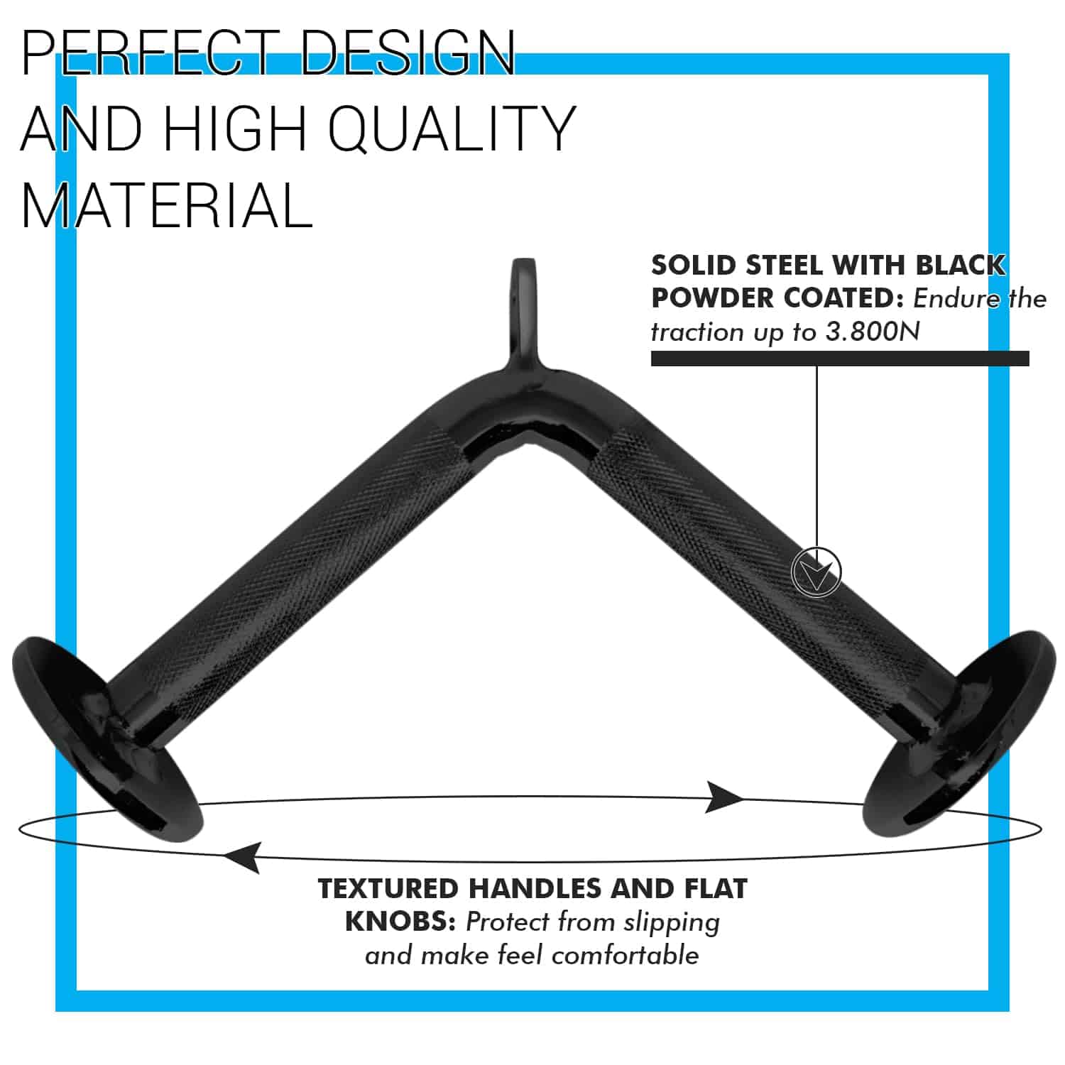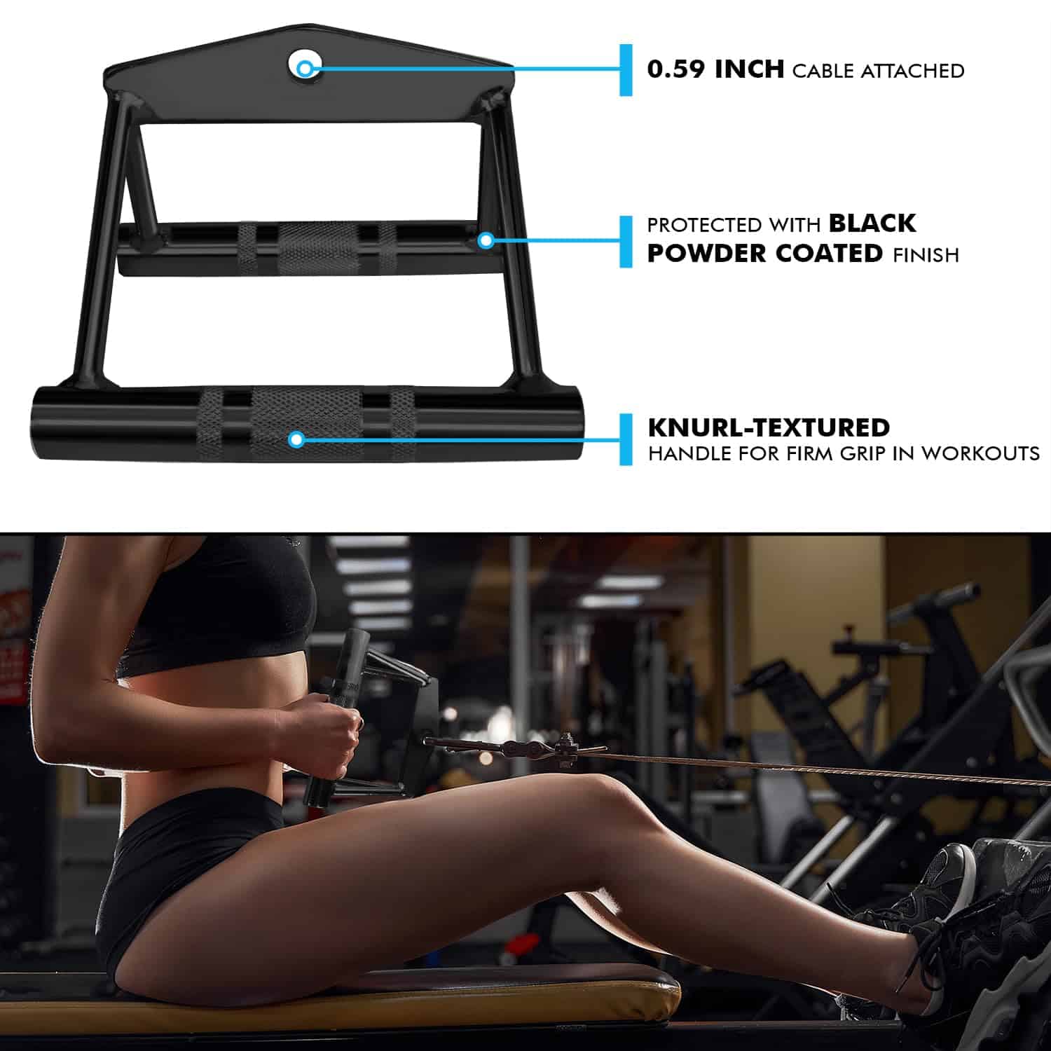 1. V Handle (Manija Doble D) está construido de acero sólido de alta calidad con una superficie texturizada antideslizante para aumentar el agarre seguro y firme de tus manos durante los entrenamientos; brinda una fuerza equilibrada a ambos brazos cuando se conecta a cualquier máquina de gimnasio. Dimensiones: 7.5×6.5×5.5 (LxAxH) y agujero de 0.53 pulgadas que se adapta fácilmente a todos los sistemas de cables.