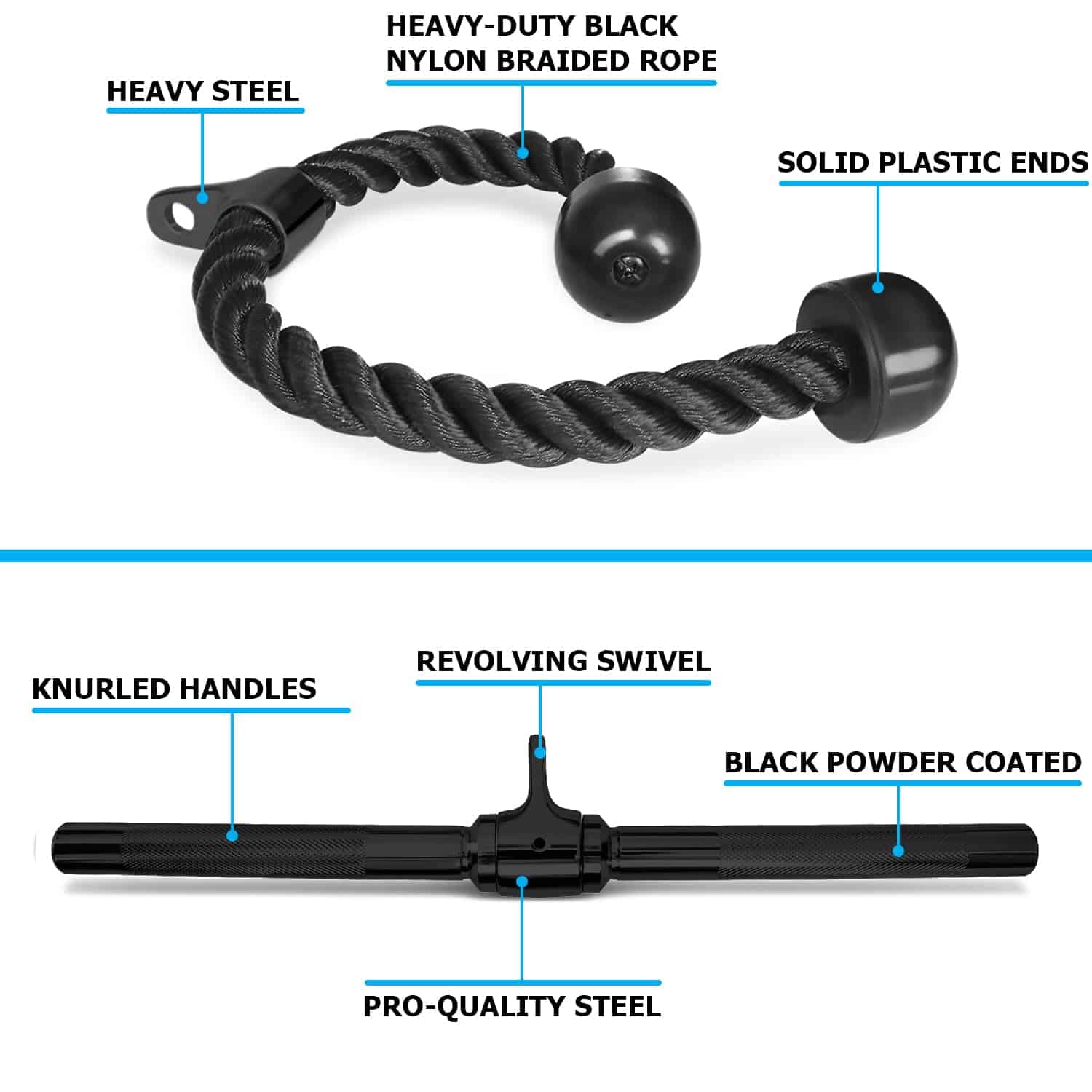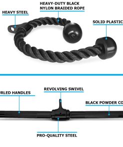 3. Cuerda de Tríceps está hecha de una resistente cuerda trenzada de nylon negro con extremos de goma sólida y un accesorio giratorio con acabado en polvo negro que proporciona un movimiento de rotación fluido. La barra de prensa en V de 6.5 pulgadas de longitud está hecha de acero sólido de alta calidad con acabado en polvo, asas texturizadas y superficie antideslizante.