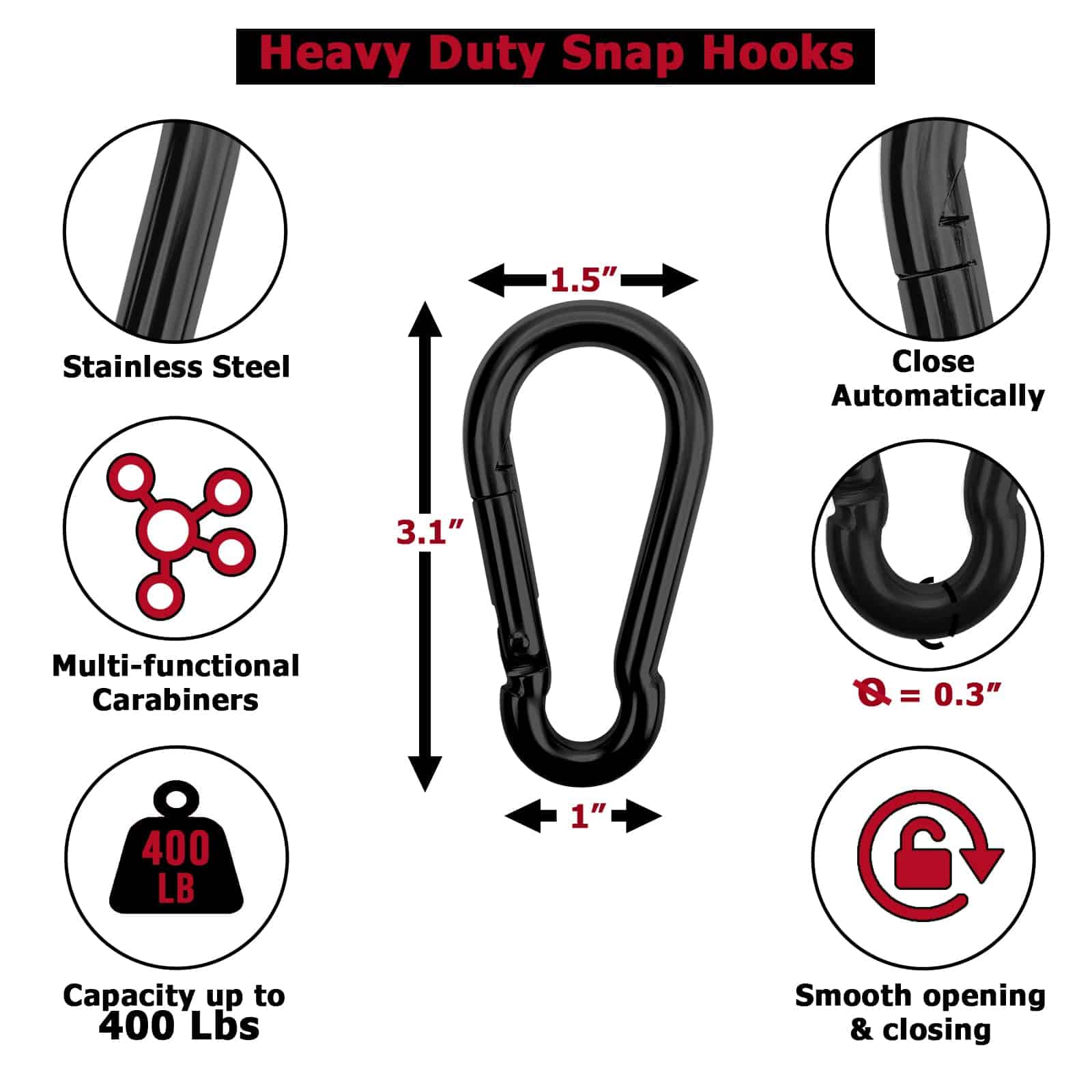 4. Barra con Forma de V con perillas planas para ajustarse cómodamente al brazo y evitar deslizamientos, soporta un peso de hasta 880 lbs (3.800N). 2 x Mosquetón de Acero Inoxidable (3.1″ x 1.5″): diseño compacto y se puede utilizar con una sola mano, capacidad: 400 lbs.