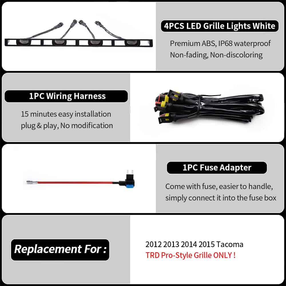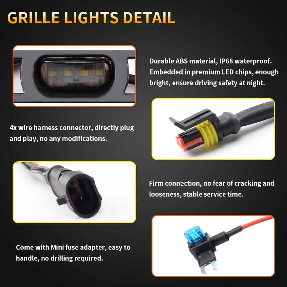 1. Luces de Rejilla LED Blancas Luces blancas de alta luminosidad. Paquete incluye: 4 luces de rejilla LED + 1 arnés de cableado + 1 fusible. Luces Raptor de Calidad Garantizada.