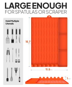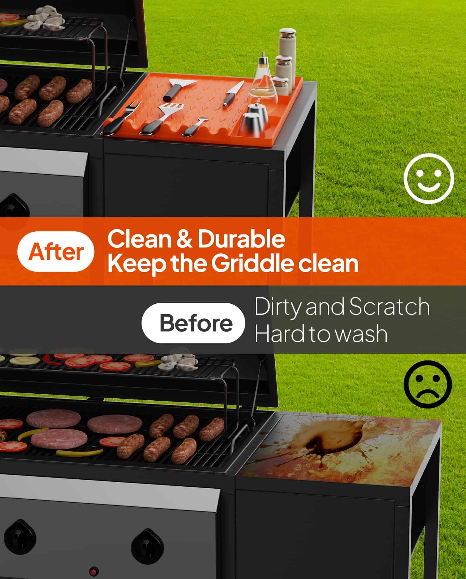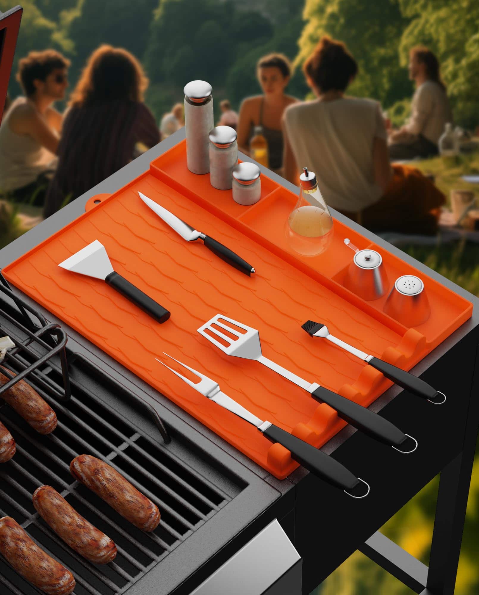3. Antideslizante y resistente a los arañazos: Protege la superficie de tu parrilla con este tapete de silicona, diseñado para evitar arañazos y mantener tus utensilios y botellas firmemente en su lugar. La textura antideslizante ayuda a reducir accidentes y mantiene tu área de parrilla ordenada.