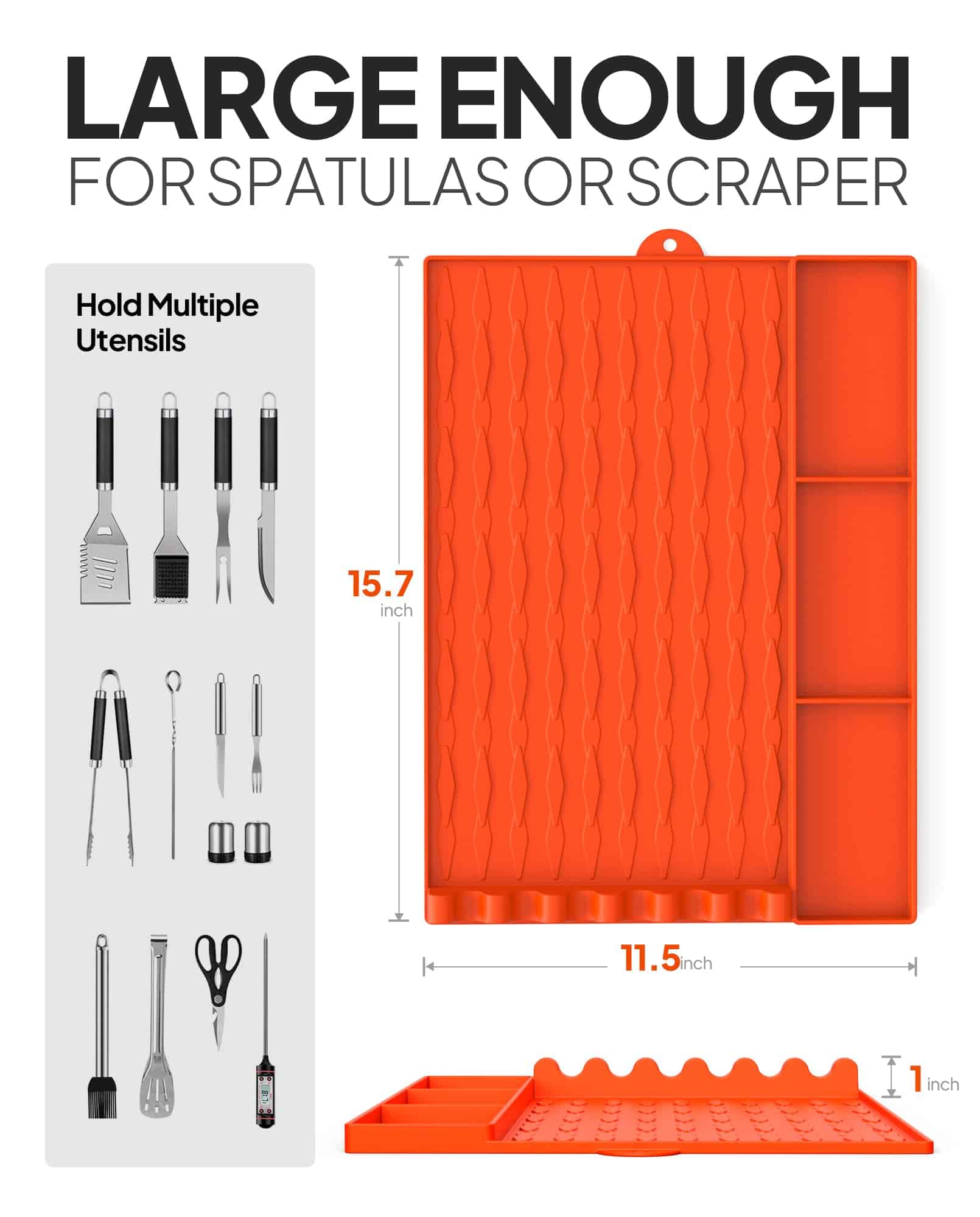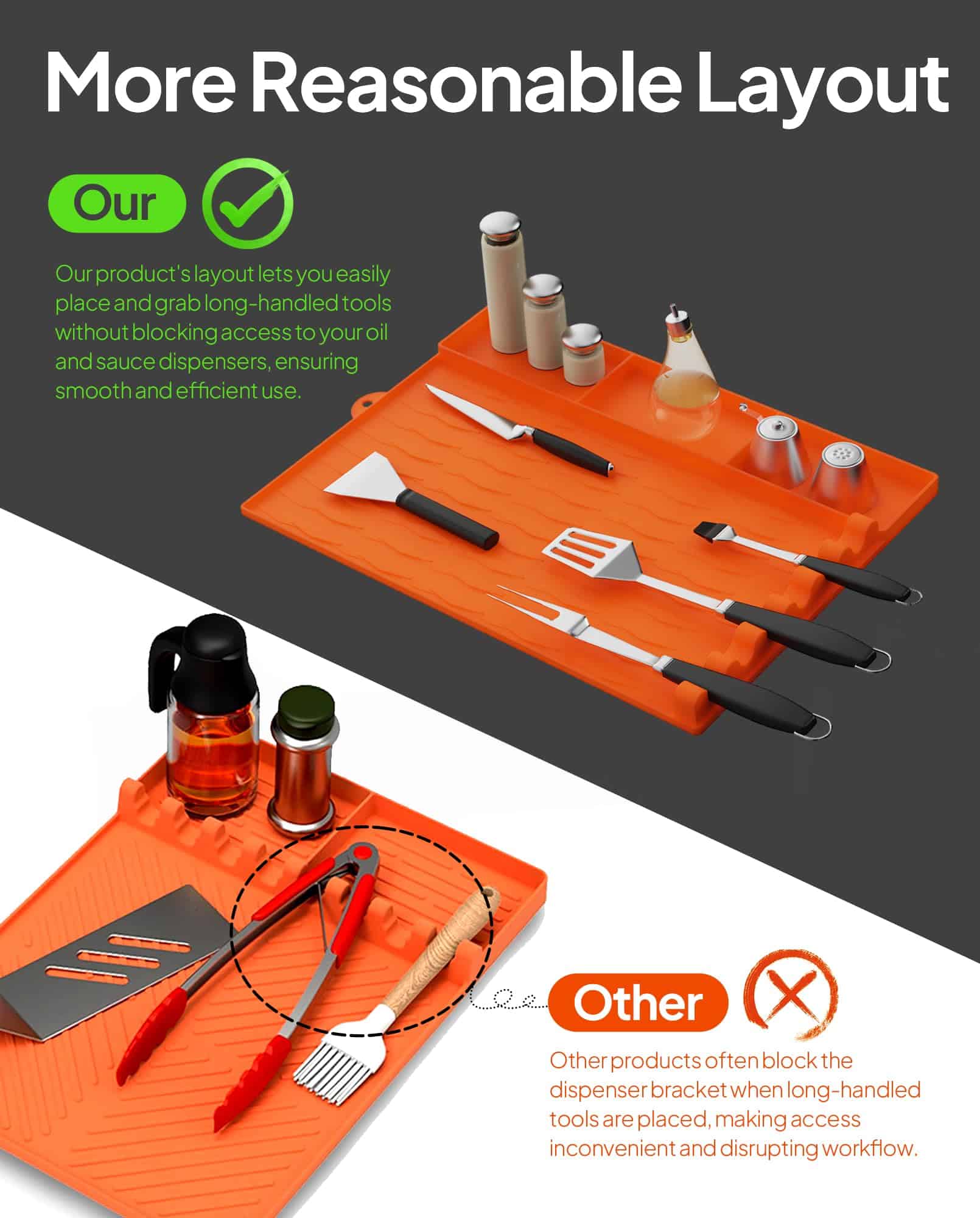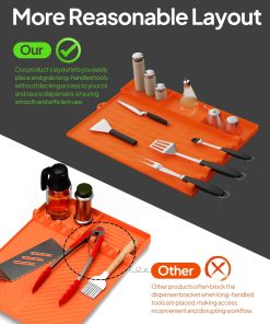 1. Diseño con espacio razonable: Este tapete está cuidadosamente diseñado con seis ranuras para sostener de forma segura tus herramientas de BBQ como espátulas, pinzas y pinceles. Además, cuenta con tres secciones dedicadas para botellas de condimentos, manteniendo todo organizado y al alcance fácil.