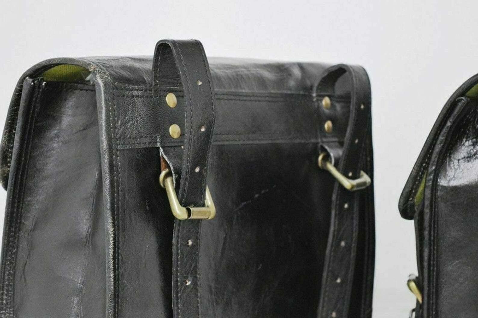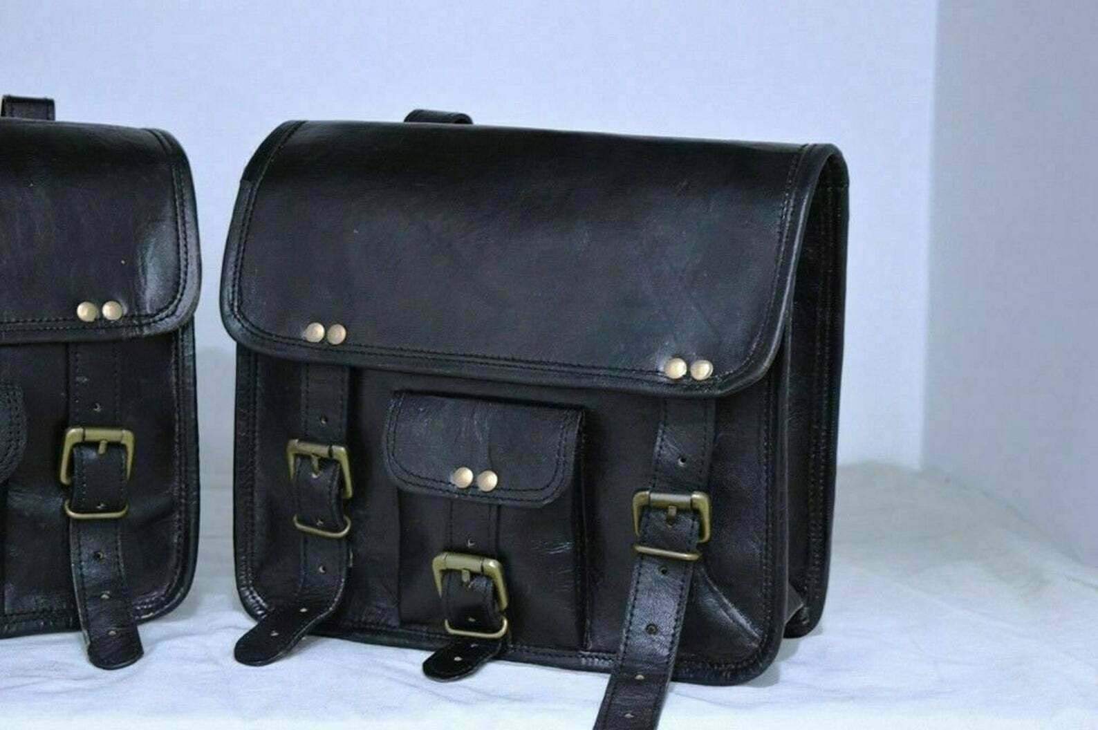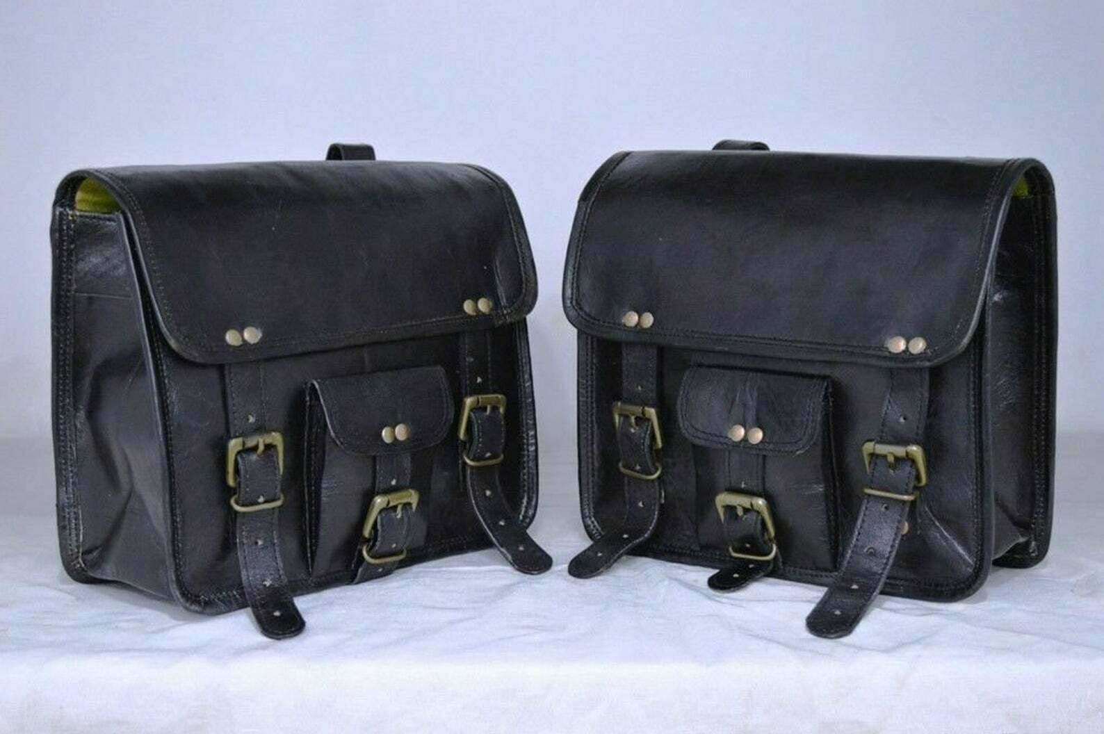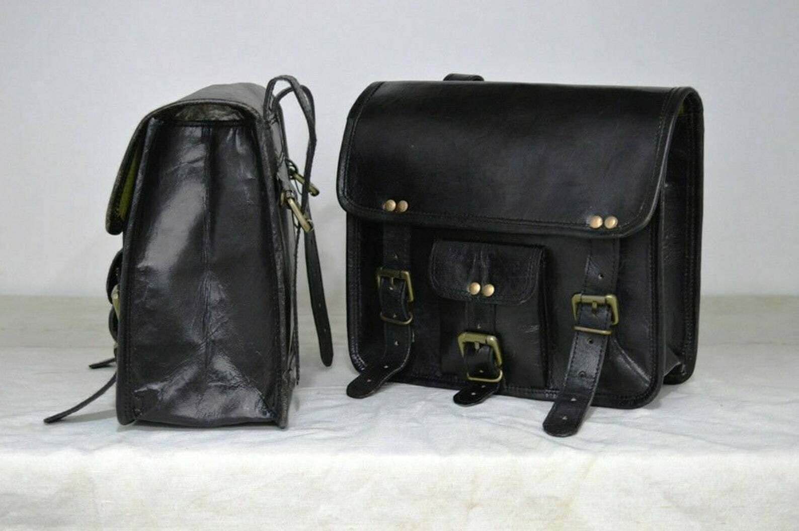 DESCRIPCIÓN: Bolsas de silla de montar para motocicletas Correa de cuero negro genuino Equipaje vintage de accesorios para motocicletas Dos bolsas laterales de montura de cuero genuino para herramientas y equipo Bolsa de montura de motocicleta Bolsa de viaje Luggage Panniers Gear Tool Pouch para bolsas de montura de motocicletas para motocicletas. Bolsos de motocicleta de cuero de cabra genuino de alta calidad / hechos a mano hechos de cuero de cabra genuino, fuerte, ligero y duradero, curtidos sin el uso de productos químicos. Diseñado principalmente para motoristas que están en movimiento. ¡Una bolsa se coloca sobre el lado izquierdo del asiento de la motocicleta y la otra se coloca sobre el lado derecho. Bolsa de herramientas para bolsas de motocicleta genial para viajar con pertenencias personales en el día a día, etc. ¡Especialmente perfecto para motoristas! ¡Los bolsos son unisex! ¡Todos los bolsos están diseñados y elaborados individualmente por artesanos talentosos y experimentados cuyo nivel de habilidad y precisión se manifiestan a través de todas sus hermosas creaciones. ¡Todos los bolsos son LIBRES DE QUÍMICOS, ECOLÓGICOS Y RESISTENTES A LA INTEMPERIE! La calidad de la bolsa mejora con el tiempo a medida que el cuero se suaviza y su color se profundiza. Se han utilizado aceites naturales especiales y una ligera aplicación para fomentar un tono artístico y una mezcla de marrones, que también hacen que la bolsa sea más resistente al agua. ¡El olor a cuero natural disminuirá con el uso y en unos pocos días. Esta bolsa presenta un aspecto único y vintage maravilloso, diseñado para complementar tu atuendo diario, todo con el estímulo para que lleves un estilo de vida simplificado, organizado y conveniente. Tamaño – 11″ Ancho 9″ Alto 5″ Profundo