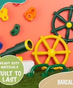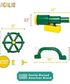 HORAS DE DIVERSIÓN, ACTIVIDAD Y JUEGO SEGURO AL AIRE LIBRE – Las manijas de patio de recreo ayudan a mantener seguros a los niños mientras juegan, escalan y hacen ejercicio, mientras que el Telescopio y Timón fomentan el juego imaginativo. El telescopio de patio de recreo es un juguete y no aumenta el tamaño. INSTALACIÓN RÁPIDA Y SENCILLA Incluye hardware gratuito para una instalación rápida. Timón de barco verde de 12 con tapa amarilla viene con hardware: 1 tornillo de montaje y 1 arandela. Las manijas de seguridad vienen con dos manijas de seguridad amarillas, cuatro cubiertas de tornillo y hardware. DURADERO Material resistente y un diseño fuerte y duradero aseguran que estos accesorios de patio de recreo duren a usted y su familia por años. CERTIFICADO SEGURO Estas manijas de juego para patio de recreo cumplen o superan todas las normas de seguridad ASTM. Capacidad de peso de 220 lb. DISEÑADO SOLO PARA USO RESIDENCIAL: No es adecuado para uso de grado comercial. GARANTÍA DE REEMPLAZO – Barcaloo respalda todos sus equipos de patio de recreo al aire libre al 100%. Estos accesorios de gimnasio de jungle vienen con una garantía automática de 1 año. Regístrese en línea para una GARANTÍA DE DOS AÑOS GRATUITA