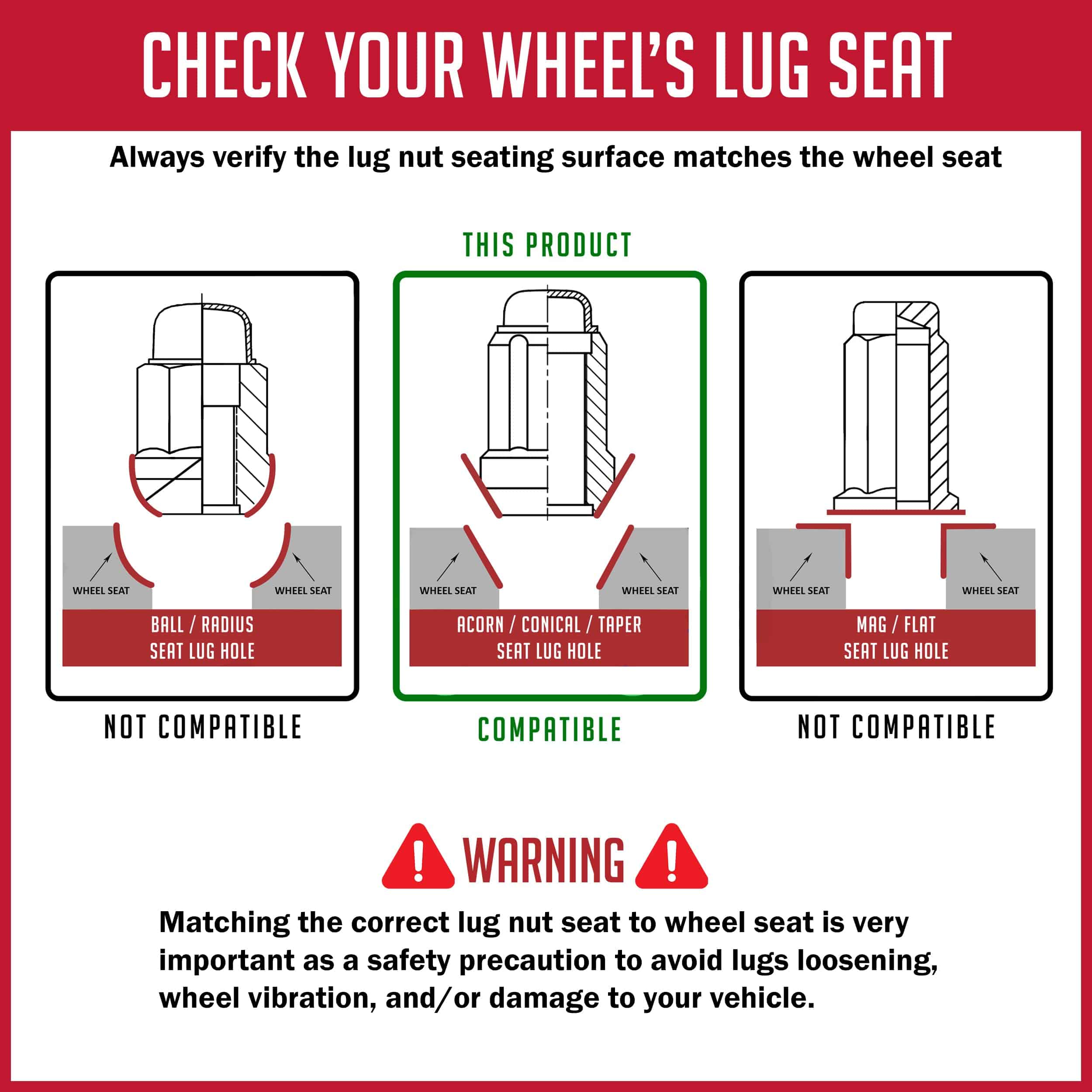1. Estas tuercas de orejeta están diseñadas para ruedas de posventa. Esta tuerca puede tener el hilo correcto para su vehículo Toyota o Nissan, pero el asiento de la tuerca puede no coincidir con la rueda OE, lo que podría causar un problema de seguridad. Siempre verifique la compatibilidad del asiento de la tuerca antes de la compra/instalación.