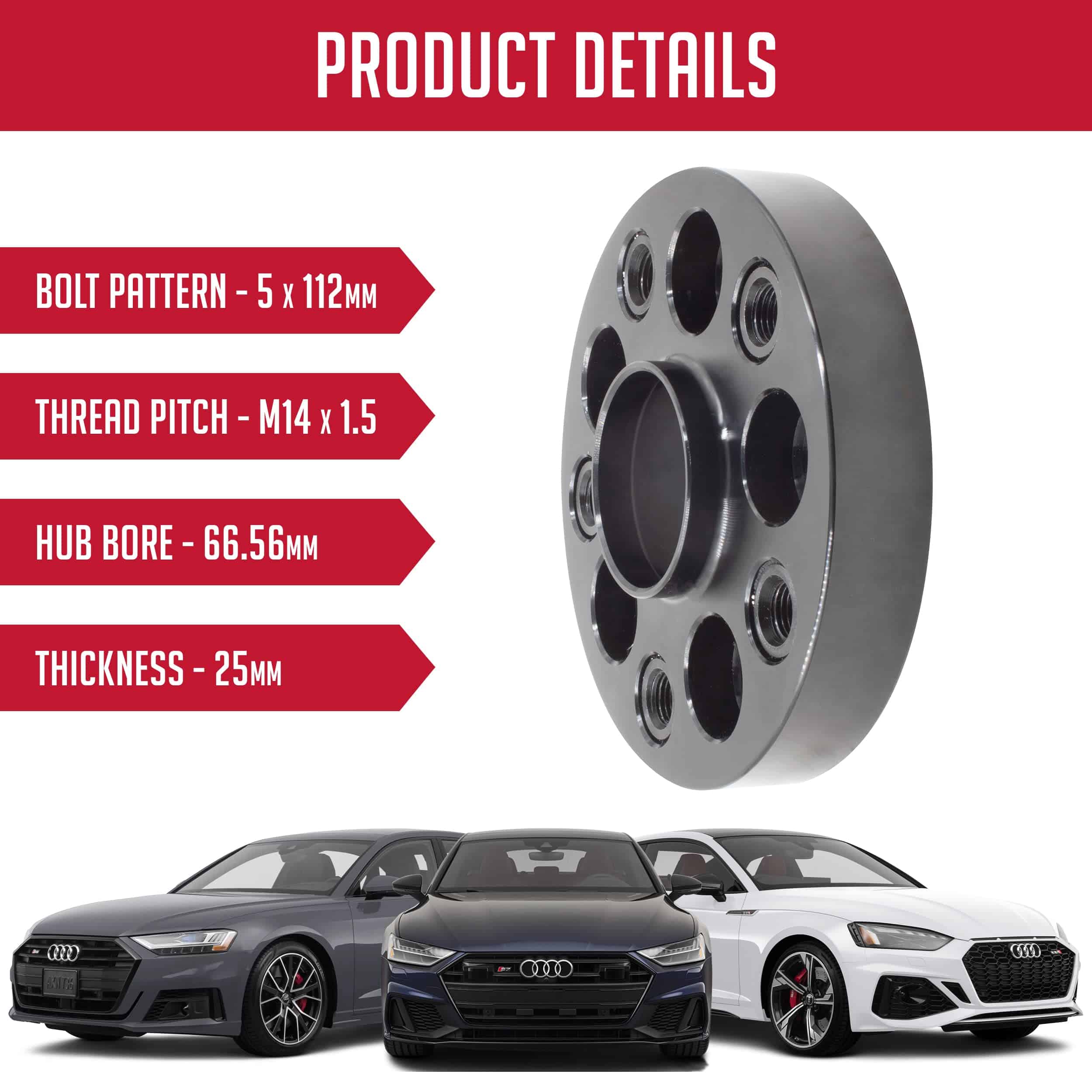 Accesorios para Ruedas Partes 1 Pieza Separador de Rueda Centrado en el Cubo Tuner para Vehículos Europeos con Pernos Negros M14 1.50 de 25mm de Espesor 5 en Patrón de Perno de 112mm PCD 66.56mm Vehículo y Cubo de Rueda Ajuste VW & Audi. Nuestros espaciadores mejorarán la apariencia de su vehículo. Resuelven problemas de espacio, crean más espacio para frenos y cierran brechas en los guardabarros también. No es necesario usar pernos más largos como la mayoría de las soluciones de espaciadores europeos. Nuestro diseño único permite el uso de pernos estándar OEM de longitud. Use este kit solo con ruedas AFTERMARKET. La rueda OE tiene asientos de bola. Los pernos en este kit son asientos acorn. El kit incluye (1) Separador de Rueda 5 en Patrón de Perno de 112mm (PCD) (5) Pernos Negros Cónicos de Asiento Acorn de Cabeza Corta M14 1.50 Espaciador al Vehículo (5) Pernos de Rueda M14x1.5 Acorn Cónico al Espaciador. Nuestros espaciadores están hechos de aleación de aluminio 6060-T6 FORJADO de calidad aeronáutica. Cada espaciador está anodizado de negro lo que mejora significativamente la dureza y resistencia a la corrosión. Los tornos CNC y las fresadoras garantizan un ajuste preciso al cubo de su vehículo eliminando posibles vibraciones. Todo el hardware es SAE Grado 10.9.