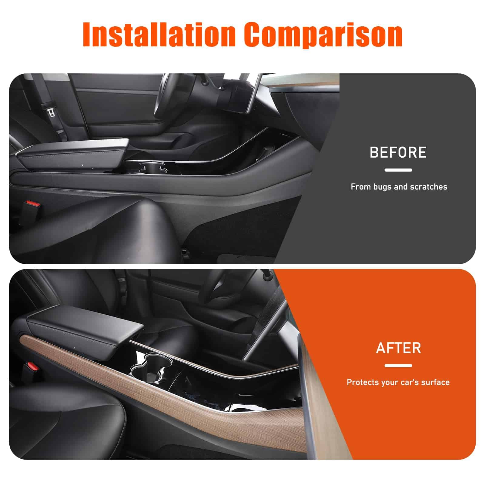1. Ajuste a los vehículos Según el diseño original del coche para Tesla Model 3 2017 2018 2019 2020. El kit de cubierta lateral de la consola central actualizada puede adaptarse perfectamente a los accesorios originales.