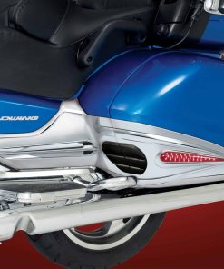 Este par de acentos de protección cromados con LEDs cubre los paneles laterales negros OEM de las alforjas y aumenta la seguridad y visibilidad al utilizar LEDs SMD. Estos acentos incorporan 56 LEDs de alta visibilidad, 28 por lado, para que pueda ser visto en todas las condiciones. El diseño de este acento de protección de alforja con LED se combina con el par de Cubiertas Laterales de Batería 52-822 de Show Chrome Accessories que tiene sus propias almohadillas de protección de goma a juego y un diseño que fluye hacia adelante. Se adapta a Honda GL1800 2012.