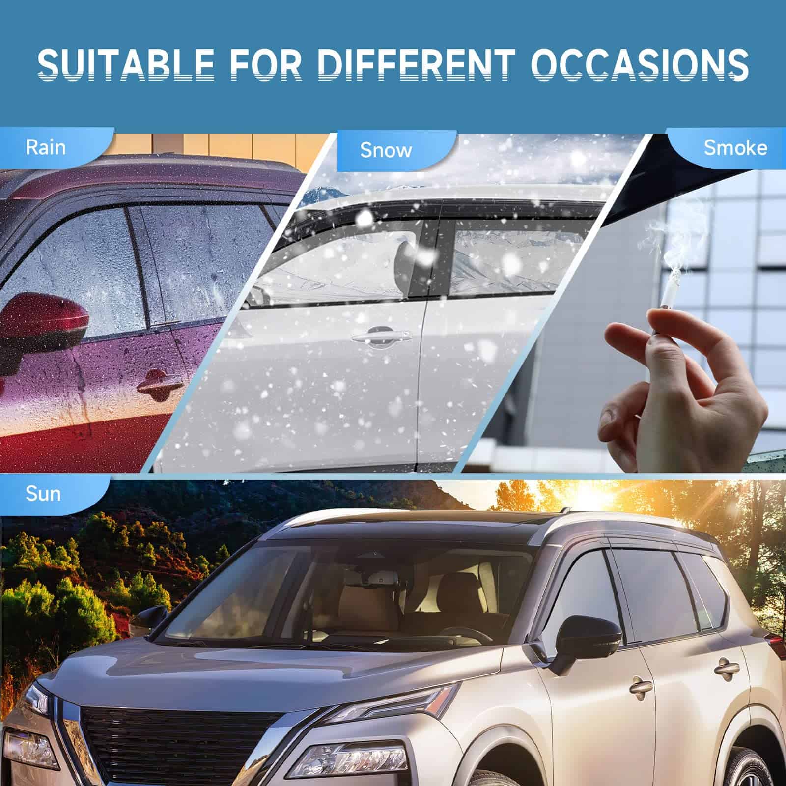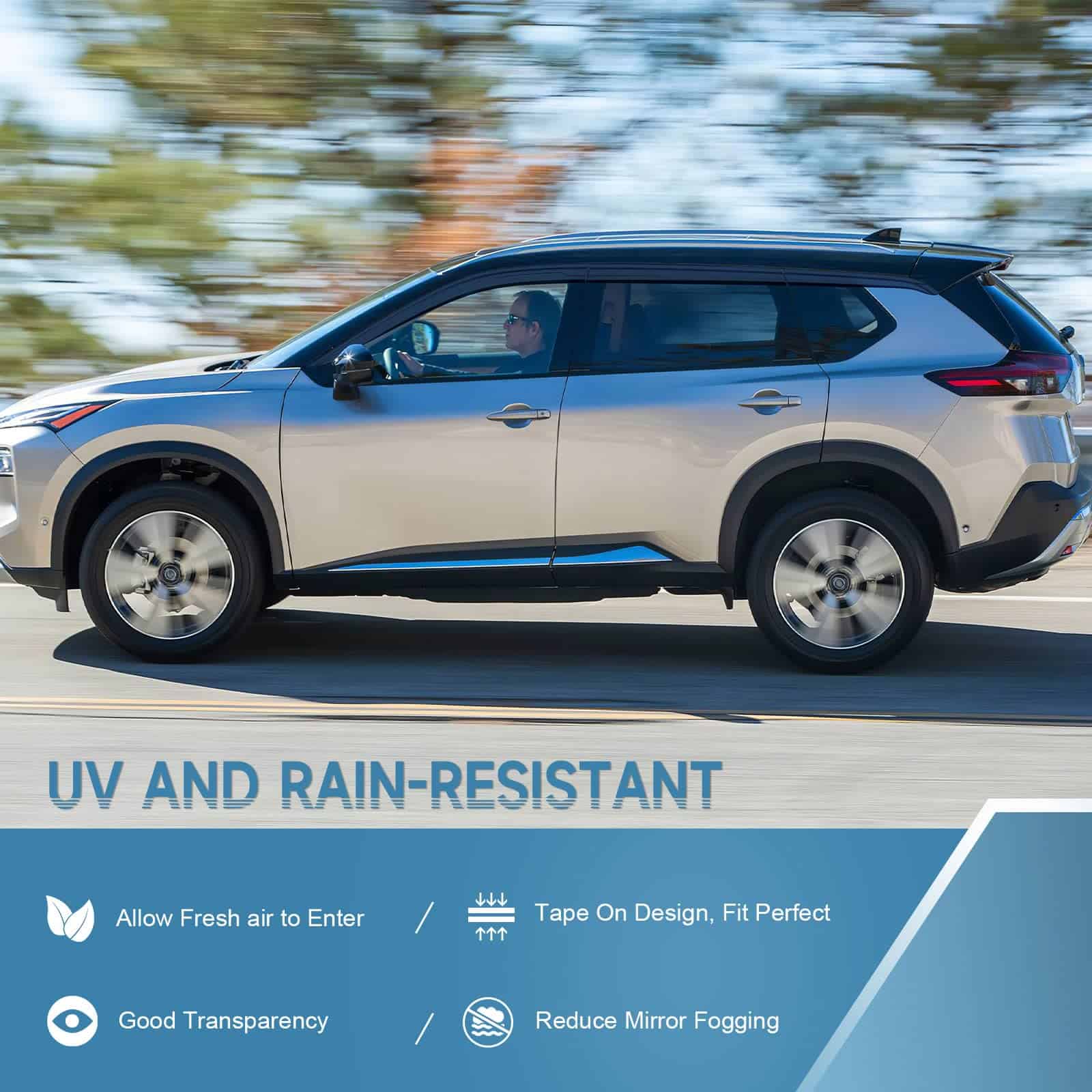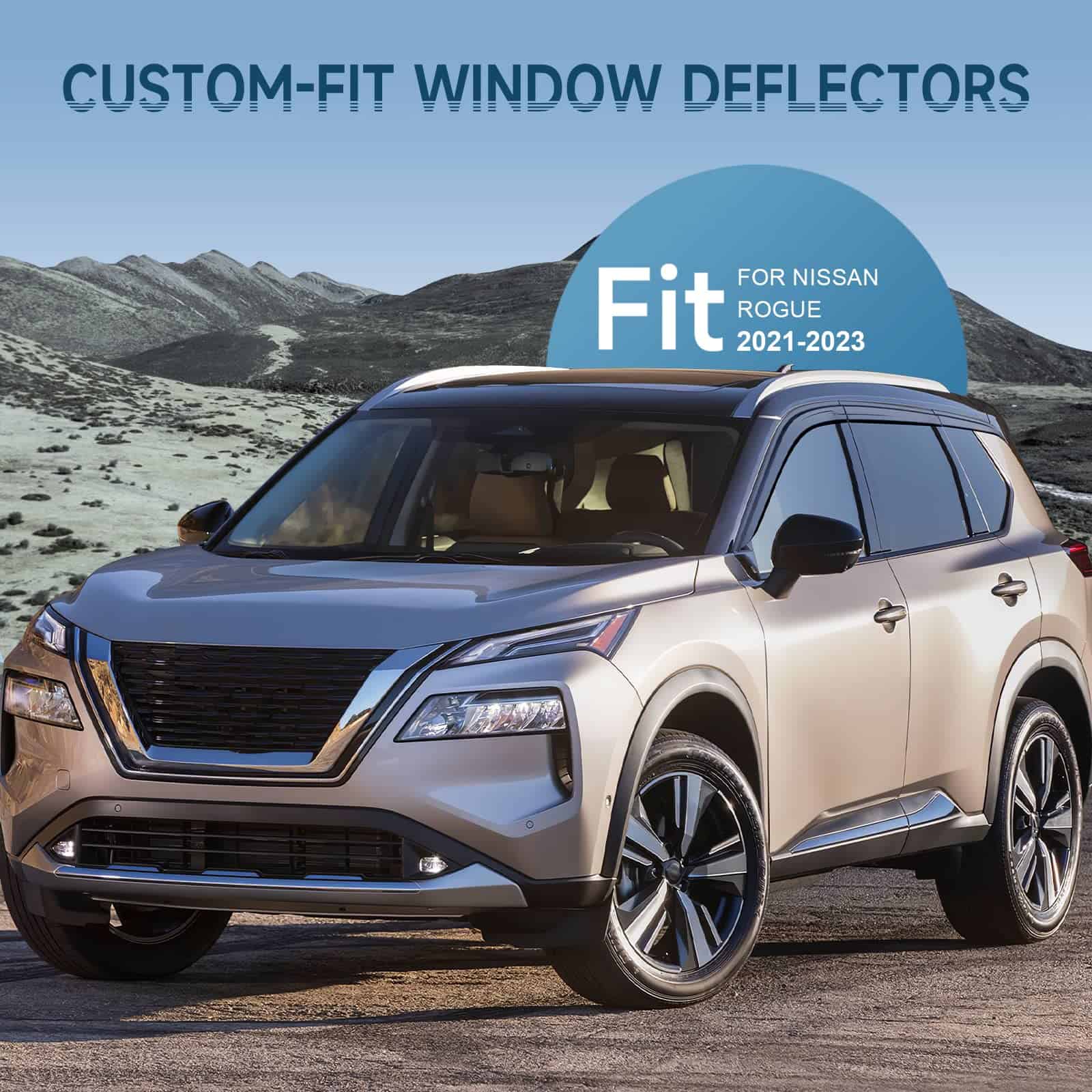 Rain guards para Nissan Rogue Compatible con Nissan Rogue 2021 2022 2023, diseñados para parecerse a una apariencia OE. Los Deflectores de Lluvia para el Nissan Rogue eligen el mejor Material para la protección solar, Mejora la apariencia de tu automóvil y permite una conducción más cómoda. Nota: Debido al material de los deflectores de lluvia, su curvatura cambiará un poco cuando se comprimió durante el transporte, por favor dóblelo suavemente de acuerdo con la ventana del auto al instalarlo.