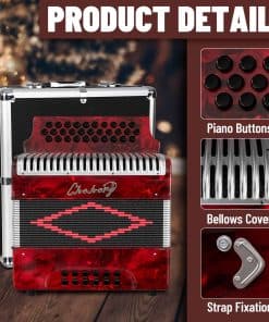 2. Cómodas y ergonómicas teclas de acordeón para adultos: El acordeón de 31 teclas está diseñado con teclas meticulosamente lijadas y pulidas para una comodidad y flexibilidad excepcionales. Ya sea que estés practicando en casa o actuando en vivo, estas teclas de tamaño adulto garantizan una maniobrabilidad sin esfuerzo, permitiéndote centrarte completamente en tu música.