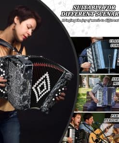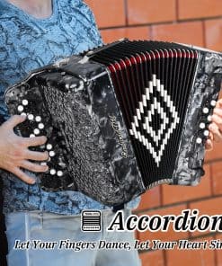 Disfruta de un sonido excepcional con nuestro acordeón de 34 teclas y 12 botones de bajo, afinado expertamente en F/B/E para tonos ricos y vibrantes. Presenta lengüetas de alta calidad y un diseño heterofónico de empuje-tiro, este acordeón produce notas nítidas y claras perfectas para actuaciones en solitario, juegos de conjunto o una variedad de estilos musicales. Diseñado tanto para principiantes como para músicos experimentados, este acordeón cuenta con un diseño intuitivo y 3 botones de afinación para una fácil operación. Ya sea que estés aprendiendo lo básico o perfeccionando tus habilidades, este instrumento hace que dominar la música sea sencillo y agradable. Desde melodías clásicas hasta ritmos modernos, este acordeón se adapta perfectamente a cualquier género. Su versatilidad lo convierte en la elección perfecta para músicos de todos los niveles y un regalo pensado para los amantes de la música. Construido para durar, este acordeón viene con un estuche bien acolchado para un transporte seguro. El diapasón de celuloide y la correa ajustable de bajo garantizan comodidad, mientras que la tecnología de supresión de ruido minimiza distracciones, permitiéndote concentrarte en crear hermosa música. Diseñadas pensando en la ergonomía, las teclas brindan máxima comodidad durante sesiones de juego prolongadas. Ya sea que estés practicando en casa o actuando en el escenario, este acordeón garantiza una experiencia suave y agradable.