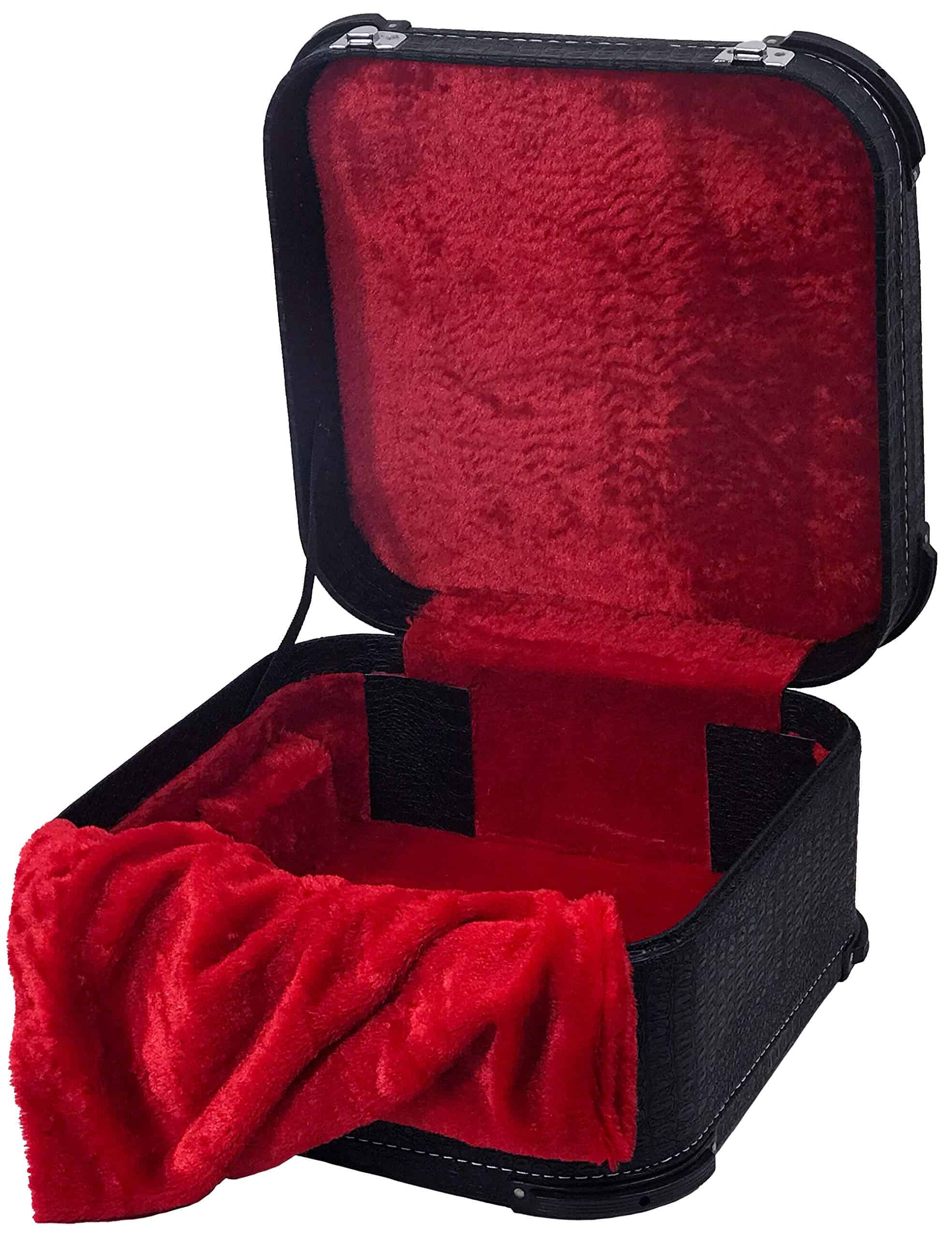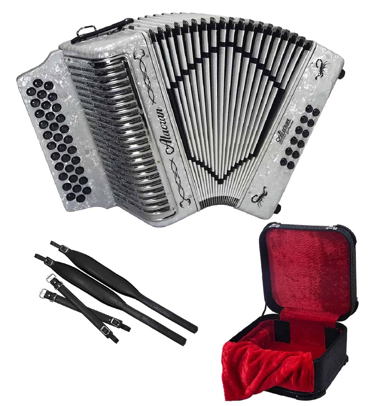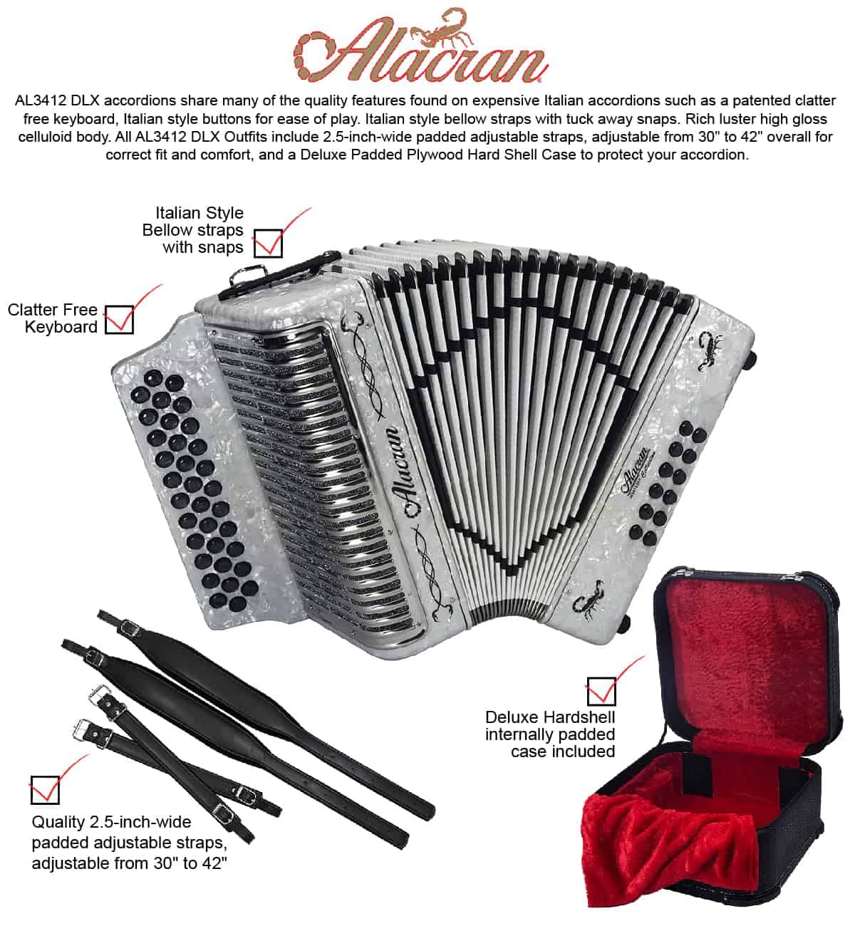 El Nuevo Paquete de Acordeón Diatónico Alacrán NAL3412 DLX de 34 Botones, 12 Bajos incluye el acordeón NAL3412 DLX con lengüetas de bajo con un teclado patentado suave y sin ruido, correas de fuelle de estilo italiano con broches ocultos y un protector de fuelle de lujo. Un juego de correas ajustables acolchadas de 2.5 pulgadas de ancho, ajustables de 30″ a 42″ y un estuche de madera contrachapada de lujo completan el paquete.