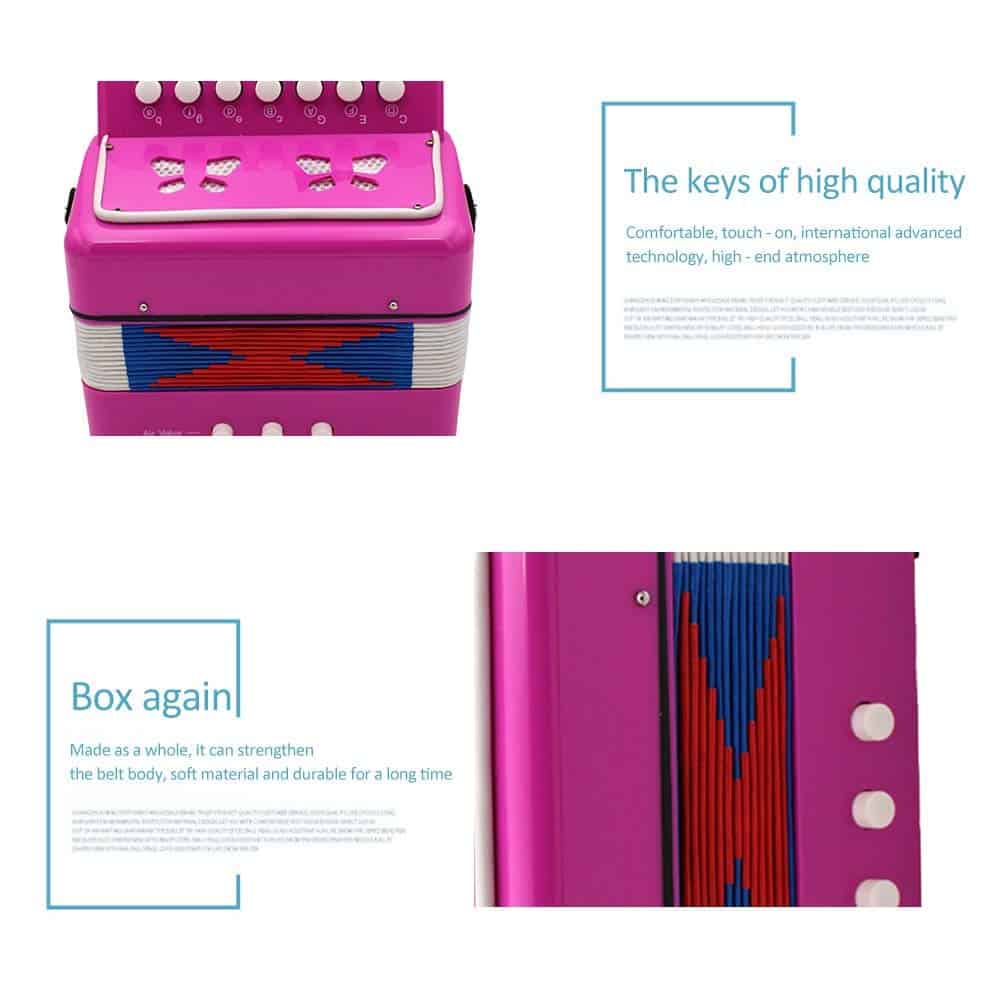 MATERIAL: Hecho de material ABS, el acordeón es seguro y no tóxico para jugar. DISEÑO: Diseñado con hebillas en ambos lados para facilitar sujetar el acordeón, agarre fácil de manejar. GRAN REGALO: El acordeón de tamaño pequeño es un regalo perfecto para compartir las alegrías de la música. FÁCIL DE USAR: El diseño simple utiliza botones para tocar notas y botones para tocar armonía, en lugar de un teclado complejo. FUNCIÓN: Desarrollar el talento musical, la coordinación mano-ojo y el ritmo de los niños. Descripción:Material principal: ABS, papel kraft Tamaño: Aprox. 18 10 18cm (L W H) Nota:1 pulgada 2,45 cm/1 cm 0,393 pulgadas2. Por favor permita un error de 1-3 cm debido a la medición manual. Por favor asegúrese de que no le importe antes de pujar.3. Debido a la diferencia entre diferentes monitores, la imagen puede no reflejar el color real del artículo. ¡Gracias!Incluye: 1 caja de juguete para niños Acordeón