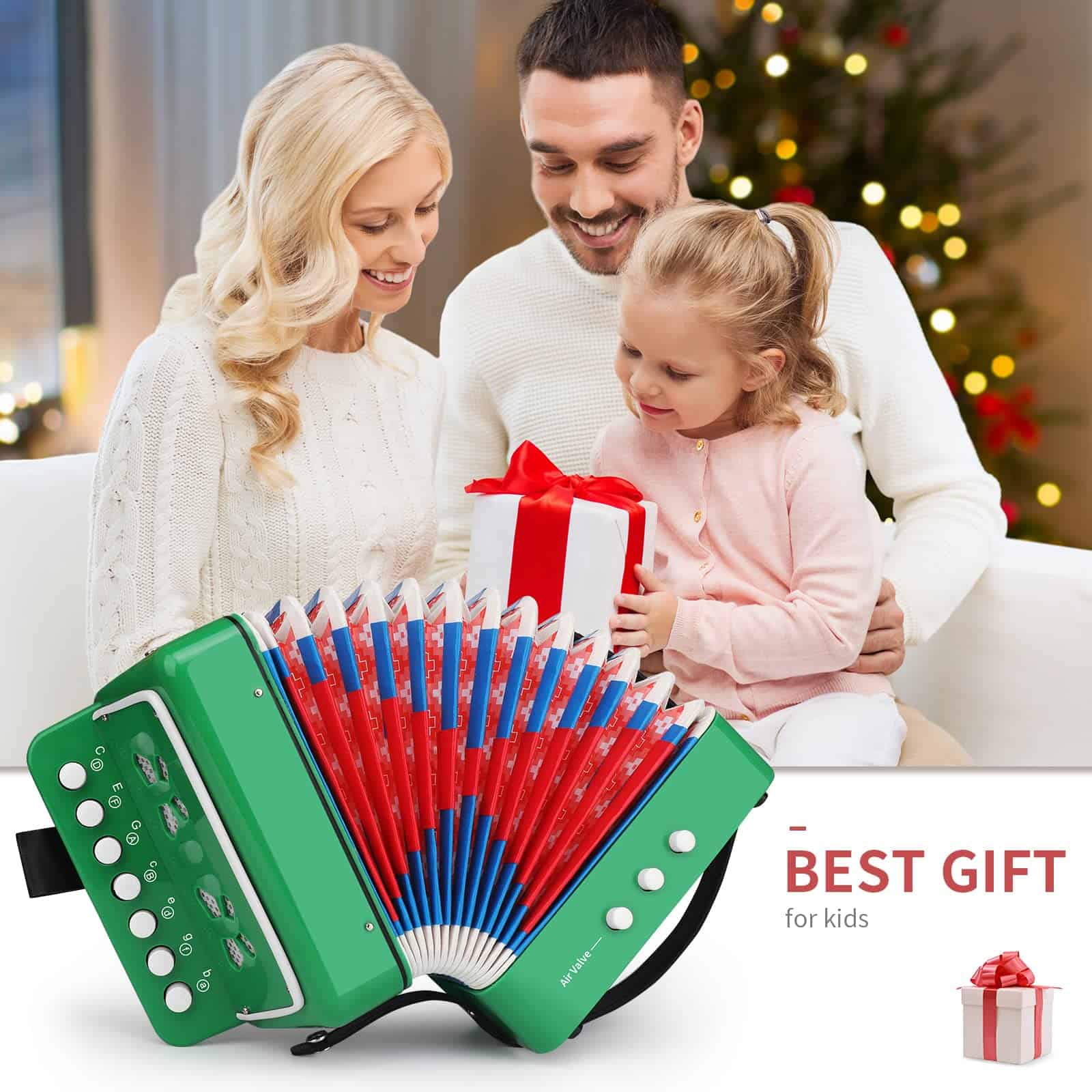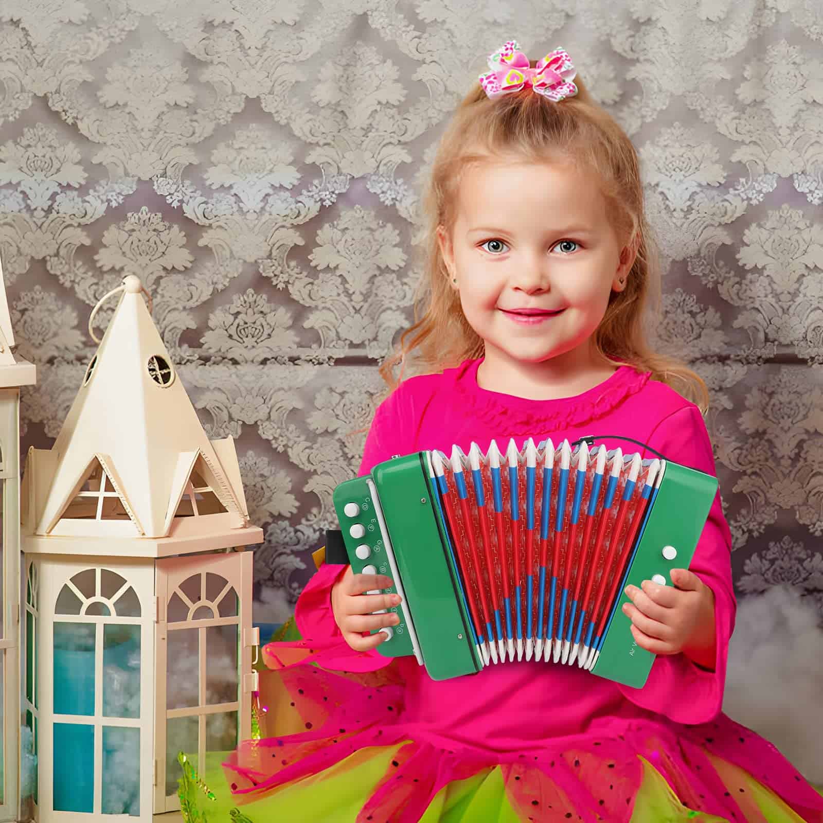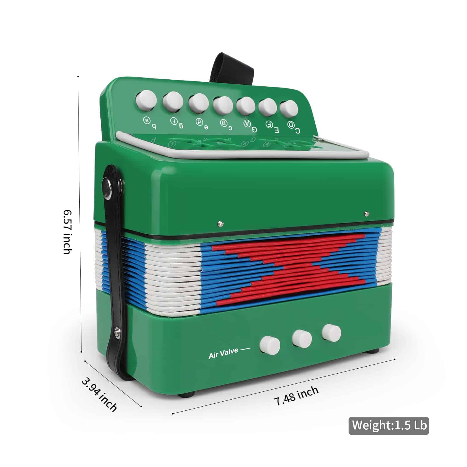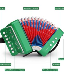 Acordeón de 10 Teclas para Niños Enseñanza de Música Infantil Acordeón para Niños Características: 3 Botones de Válvula de Aire 7 Botones de Tecla (Do-Mi-Sol-Do-Mi-Sol-Si) 2 Correas de Cuero PU en color negro, cierre de clip en la parte superior Diseño de correa en el lado para una mejor sujeción al tocar música. 100% Seguro para tu bebé ya que utilizamos material de resina ABS grado alimenticio no tóxico Especificaciones: En la caja: Acordeón de 10 Teclas y Manual Embalaje de papel ecológico Tamaño del producto: 6.7 x 3.9 x 6.9 pulgadas (Largo x Ancho x Alto) Edad Recomendada del Niño: 3 años en adelante.