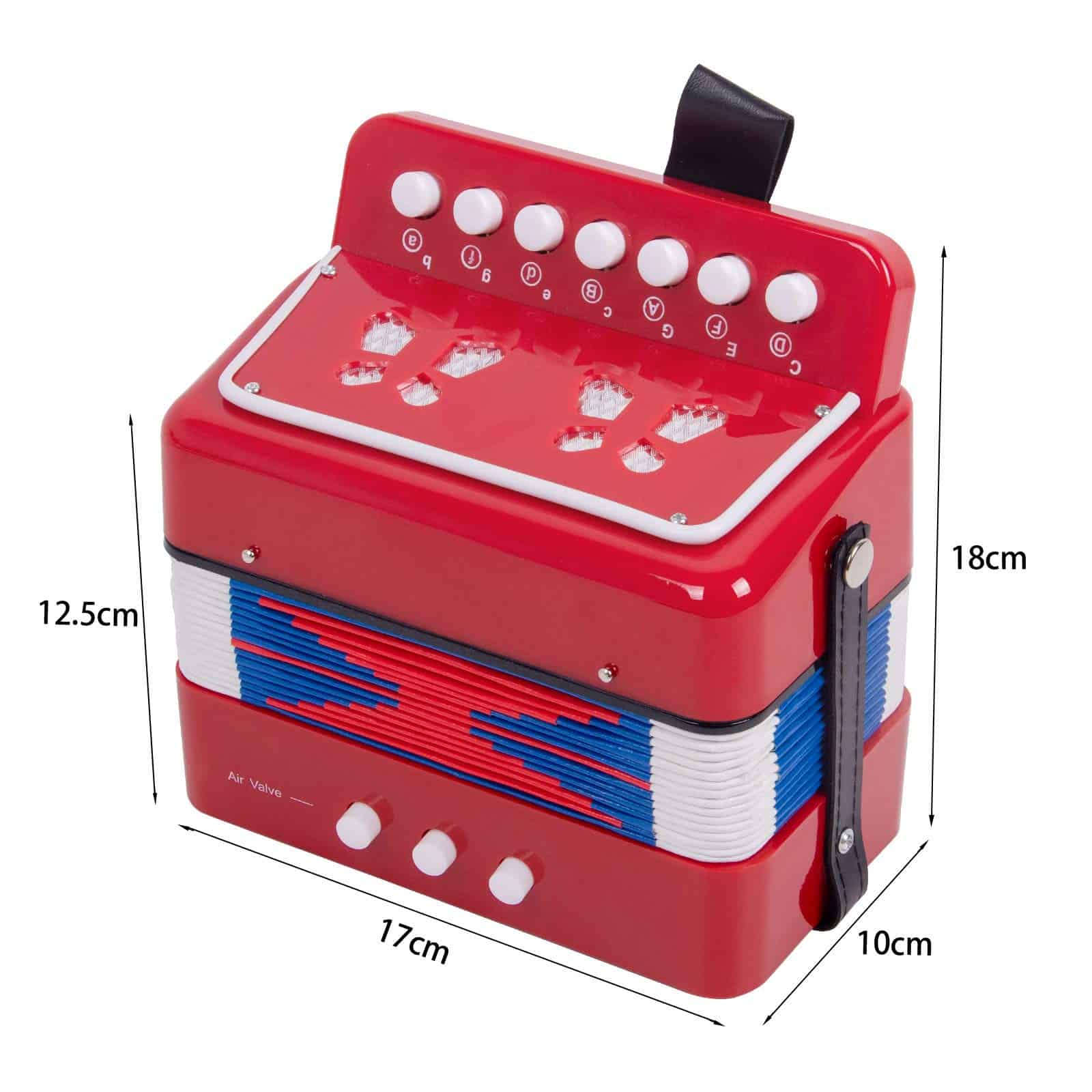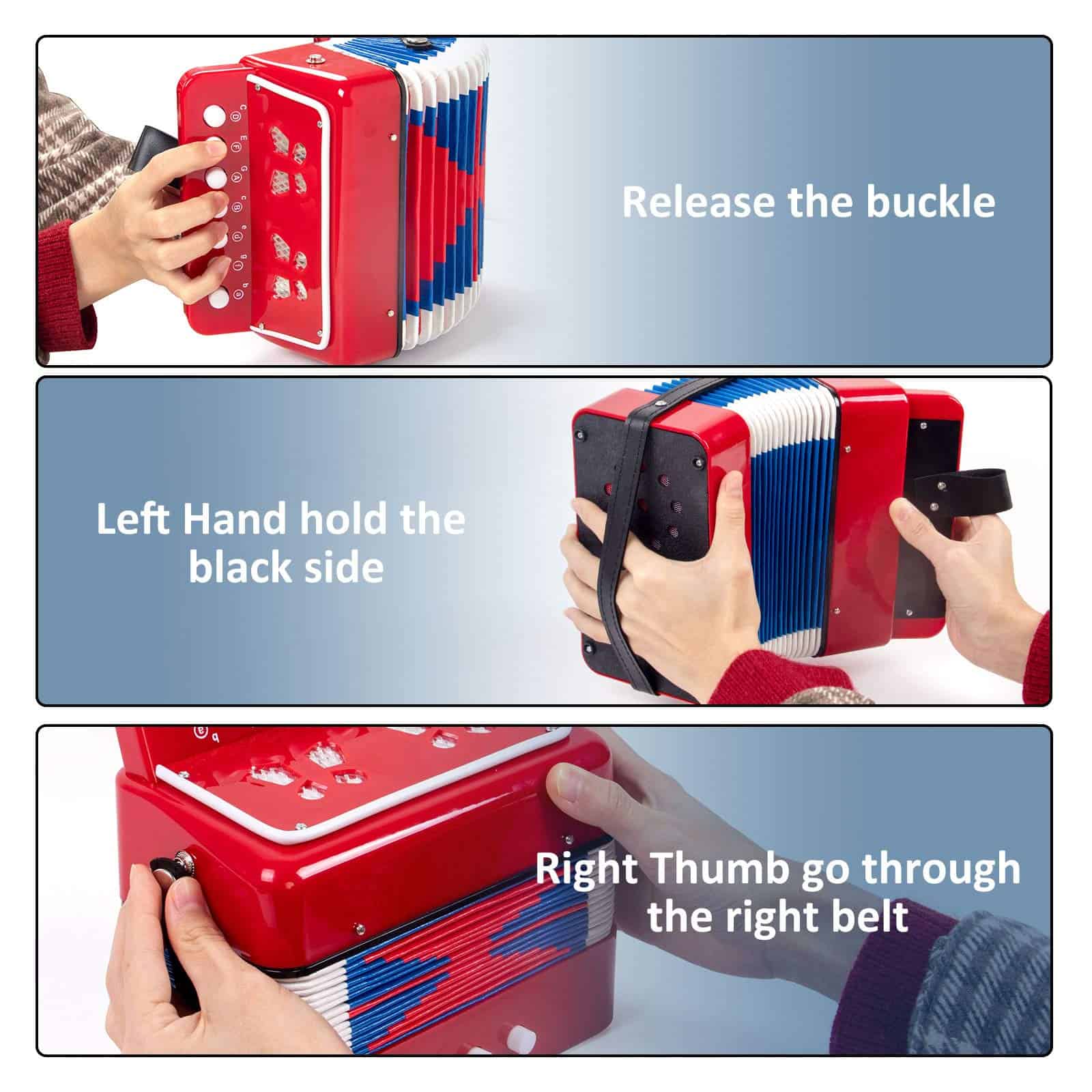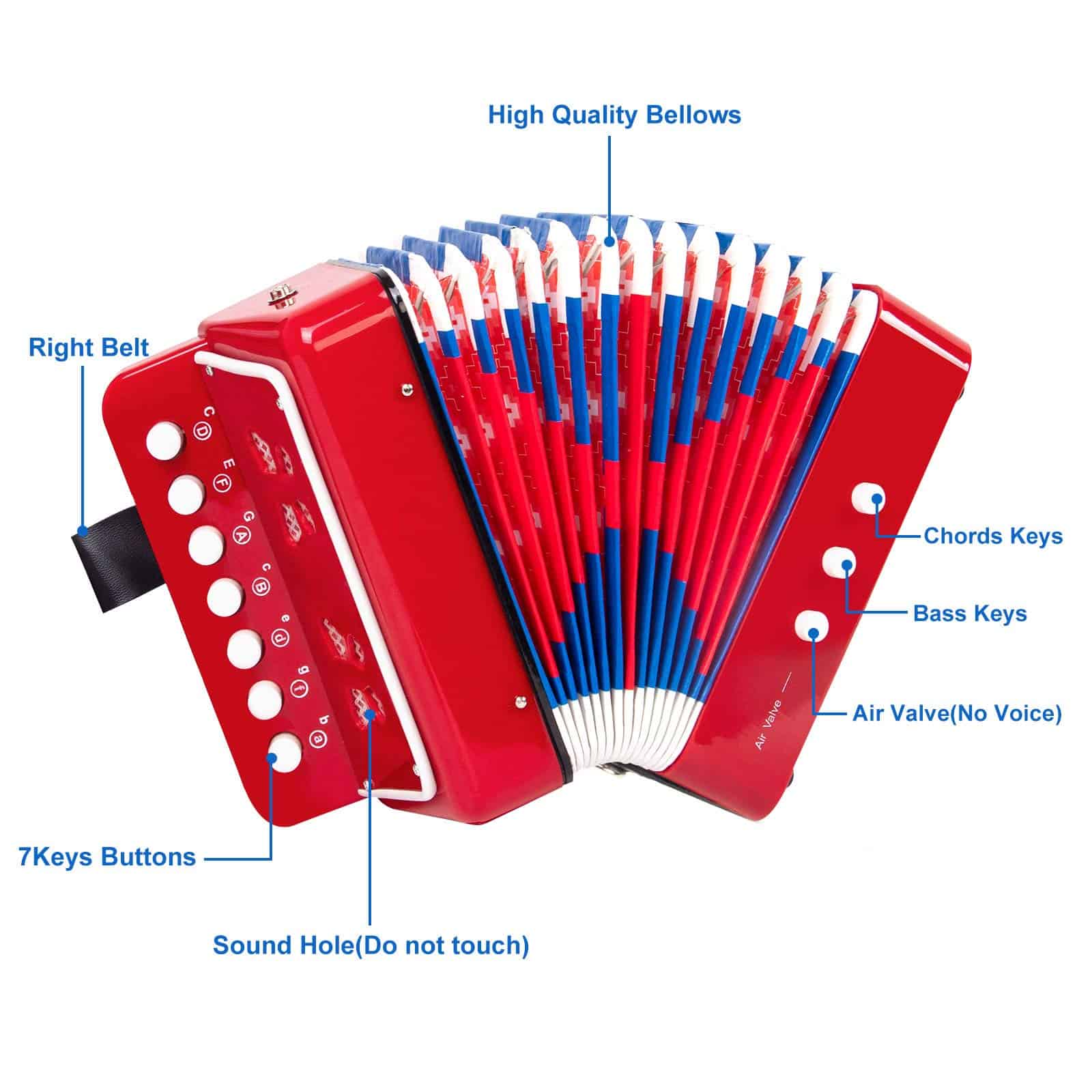 2. Diseño detallado perfecto: Fuelles de alta calidad, resistentes y duraderos, hechos de materiales seguros. 7 botones pueden satisfacer las necesidades de la música en general. Hebilla, desátese cuando quiera usarla y ciérresela cuando no esté en uso. El orificio de sonido, cuando tocas, un hermoso concierto sale del orificio de sonido.