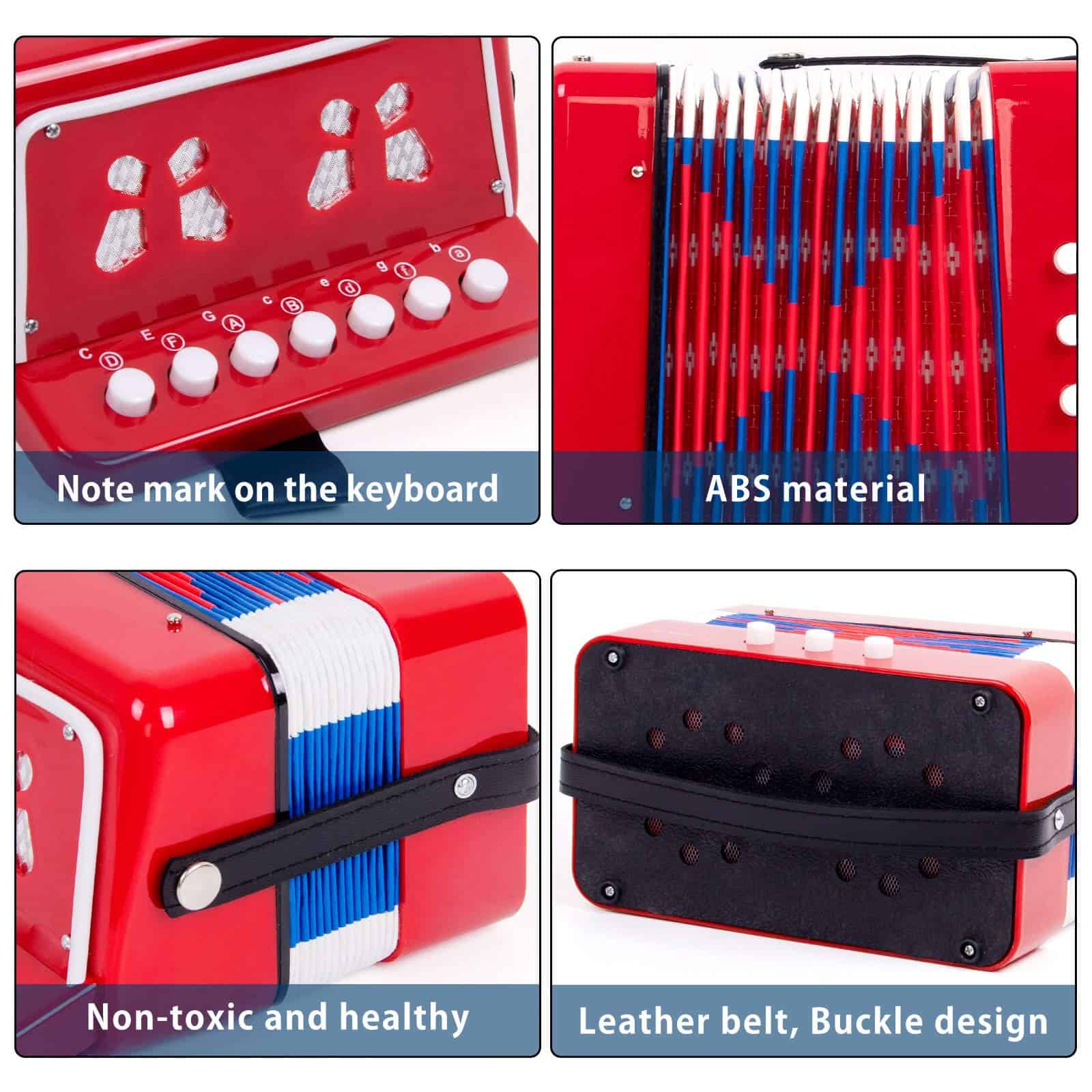 3. Seguridad y protección ambiental: Nuestros acordeones utilizan materiales de resina ABS de grado alimenticio, no tóxicos e inofensivos. Los niños aprenden y juegan 100% seguros, los fuelles están hechos de cuero, papel kraft y tela, fuertes y duraderos, pueden prevenir daños.